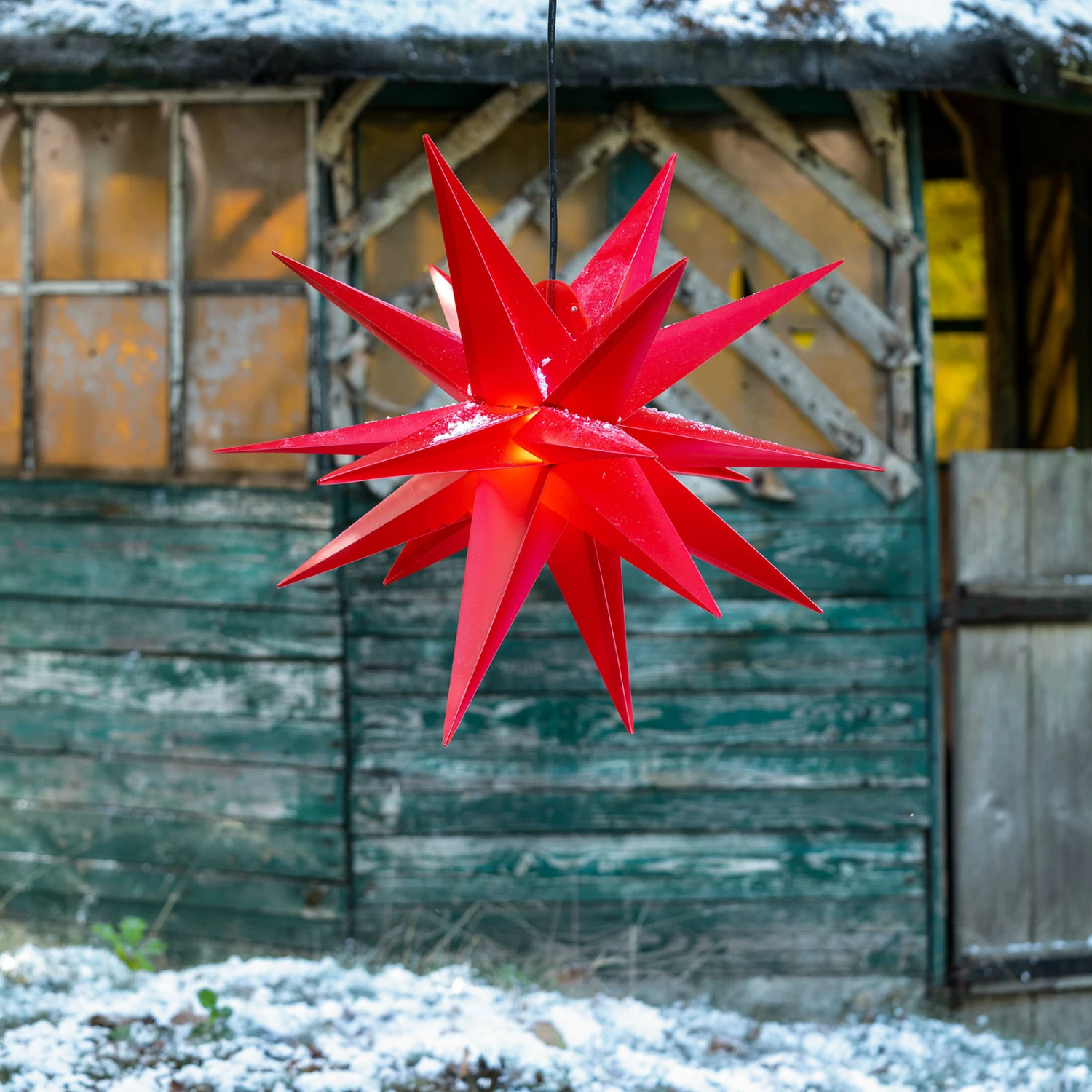 Dieser große Kunststoff-Stern vereint alles, was ein attraktives Deko-Accessoire ausmacht: anspruchsvolles Design, gepaart mit schöner Form- und Farbgebung. Zudem ist der 18-zackige Stern mit der Schutzart IP44 ausgestattet, was ihn gegen Spritzwasser schützt und eine Verwendung im Außenbereich – z. B. an der Außenseite der Fenster sowie auf dem Balkon oder der Terrasse – unkompliziert macht. Aufgrund des Durchmessers von 60 cm ist diese schöne, vorweihnachtliche Dekoration nicht zu übersehen.
