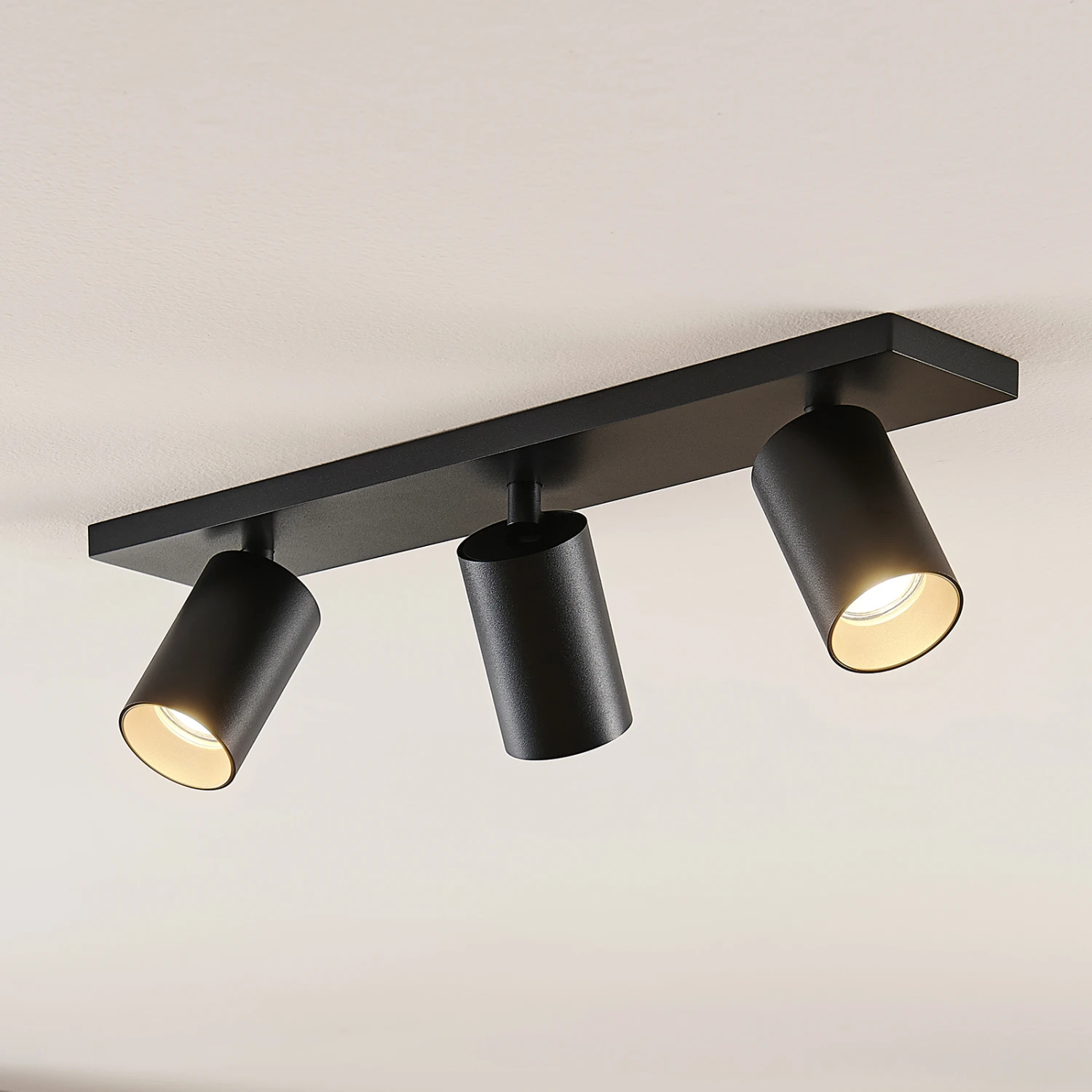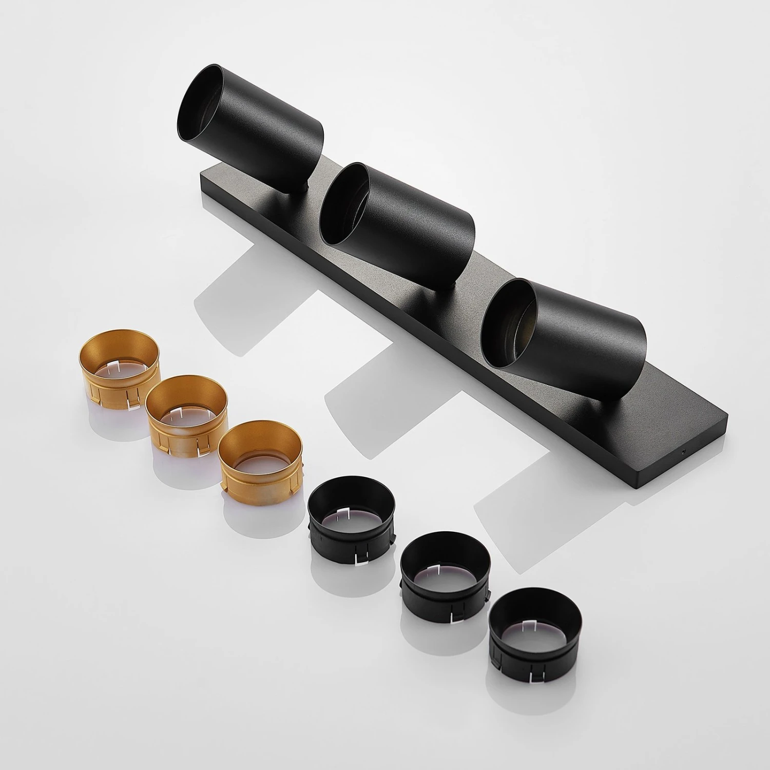 Die schwarze Lampe aus hochwertigen Aluminium Brinja besteht aus drei zylindrischen Strahlern, die sich alle um 90 Grad kippen und um 350 Grad drehen lassen. Die Strahler sitzen auf einer rechteckigen Halterung, welche sowohl an der Decke als auch an Wänden angebracht werden kann.