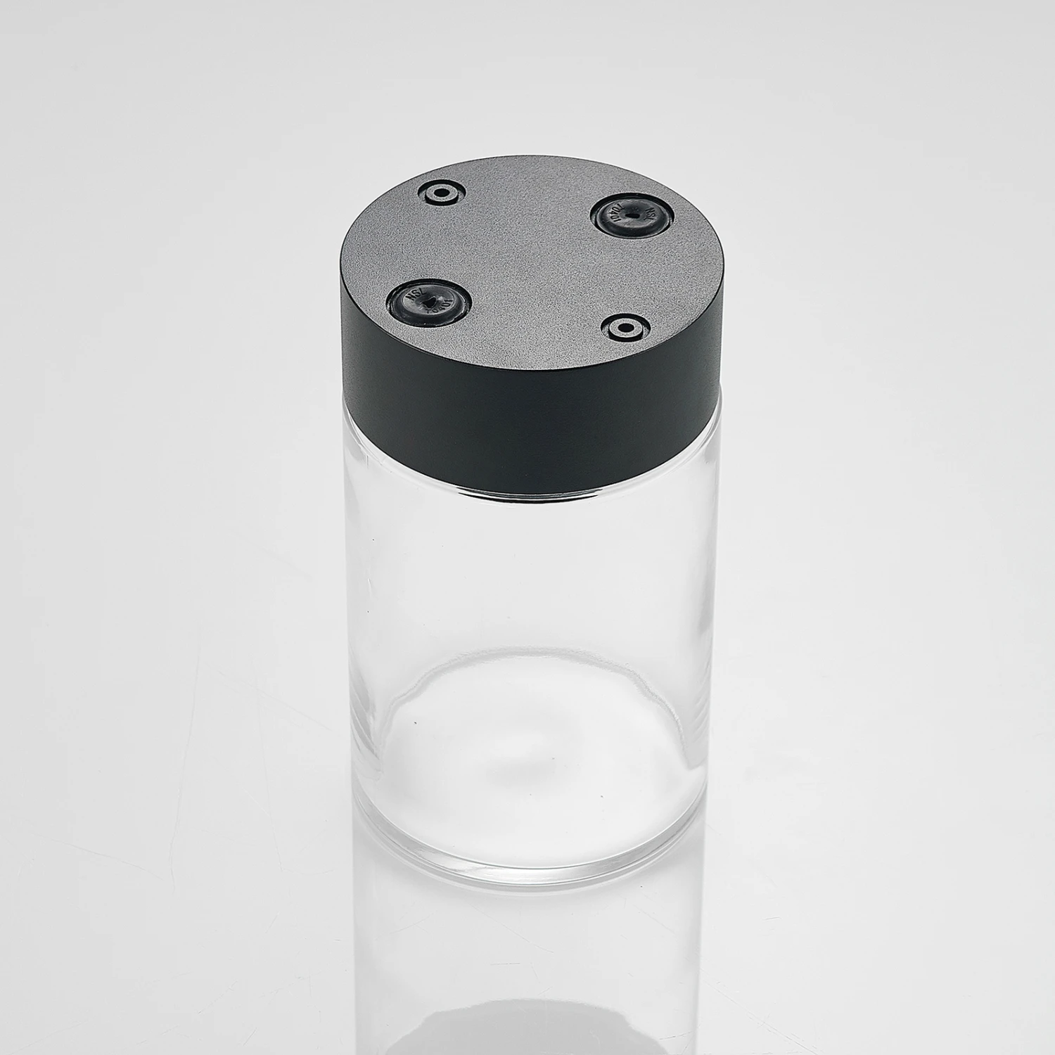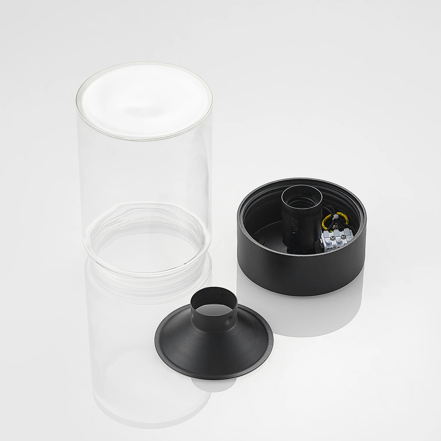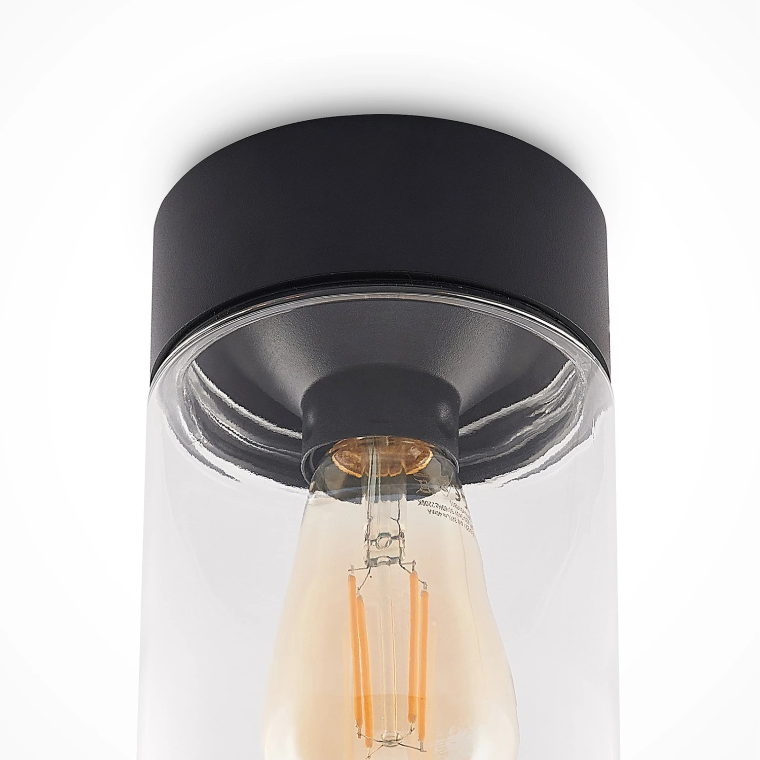 Runde Außendeckenleuchte Liljana mit schwarzem Gestell und klarem Glasschirm