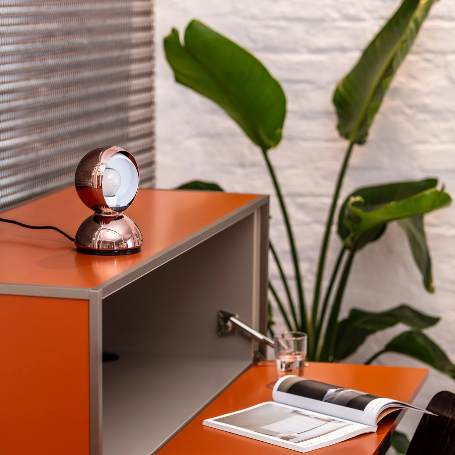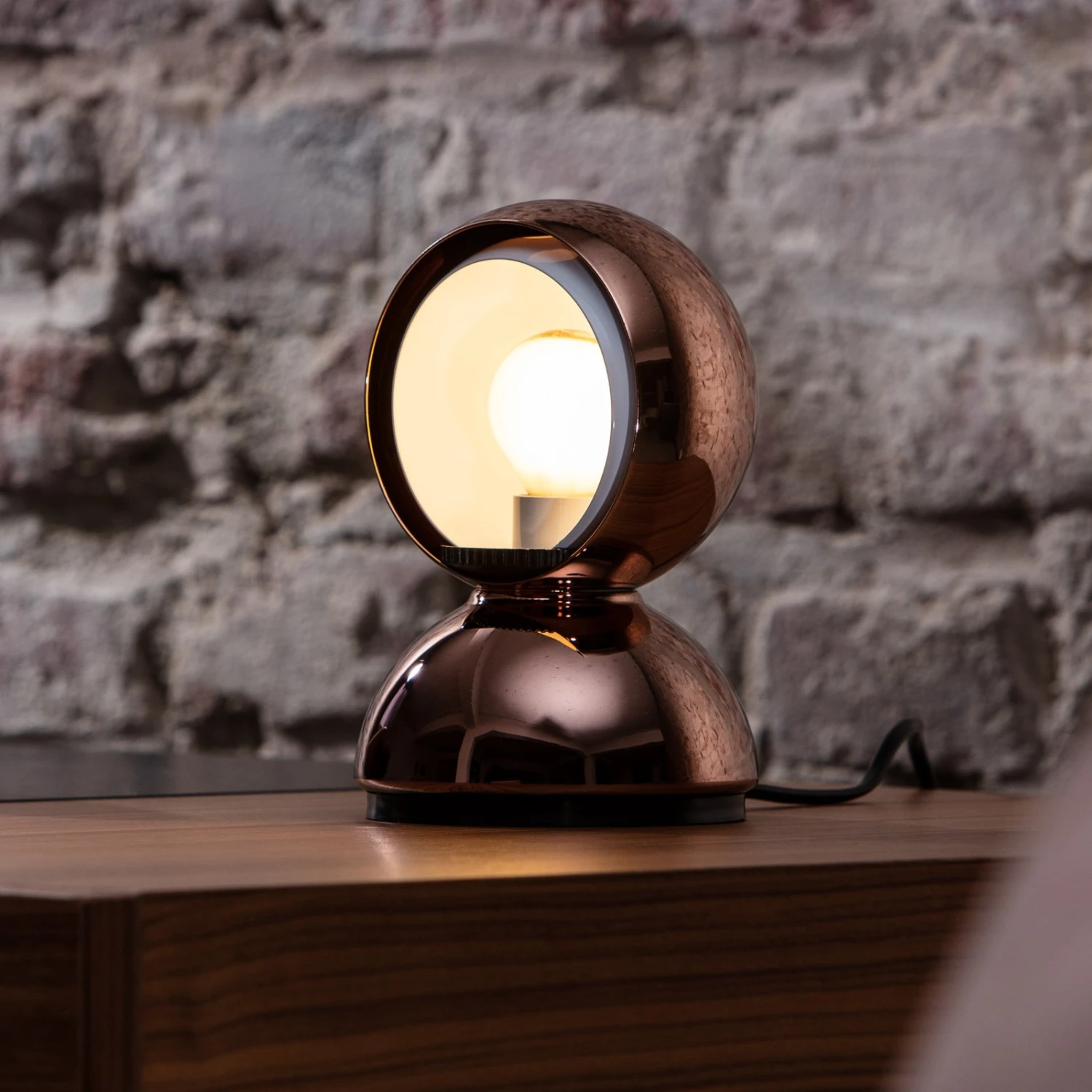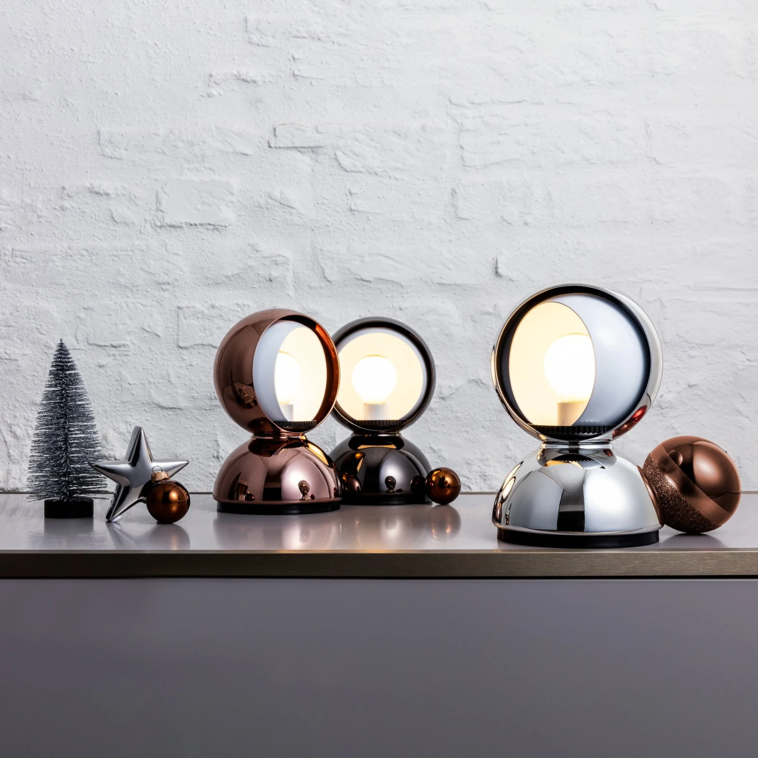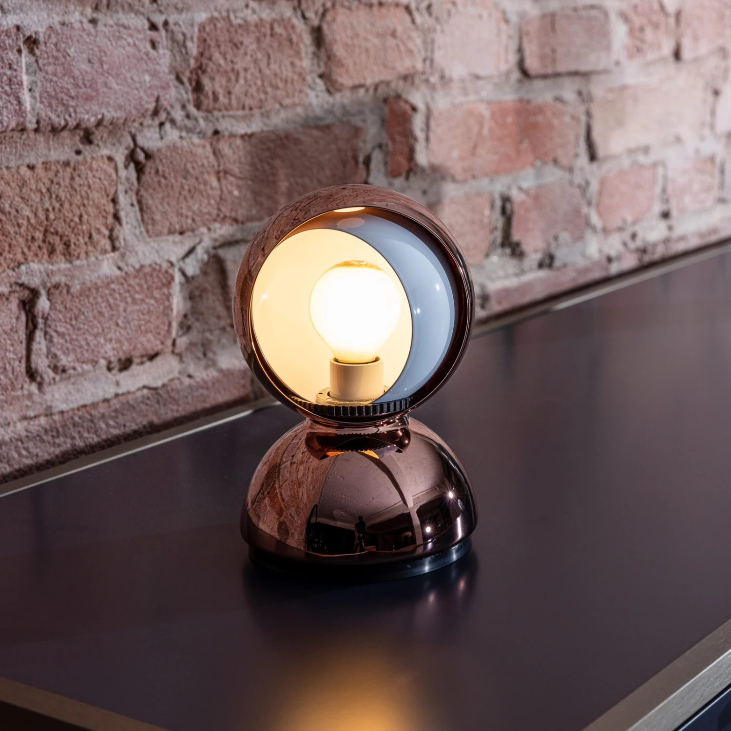 Eclisse zeichnet sich nicht nur durch ihr klassisches Aussehen aus, sondern vor allem durch ihre Funktionsweise. Sie hat nämlich eine Art mechanischen Dimmer eingebaut. In der Halbkugel des Leuchtenkopfs befindet sich noch eine zweite, kleinere Kugel, die man drehen und somit mal mehr, mal weniger vor die Öffnung der äußeren Kugel schieben kann. Damit kann man die Intensität des Lichtscheins variieren und man kann auch beeinflussen, ob man eher direktes oder indirektes Licht bekommt.