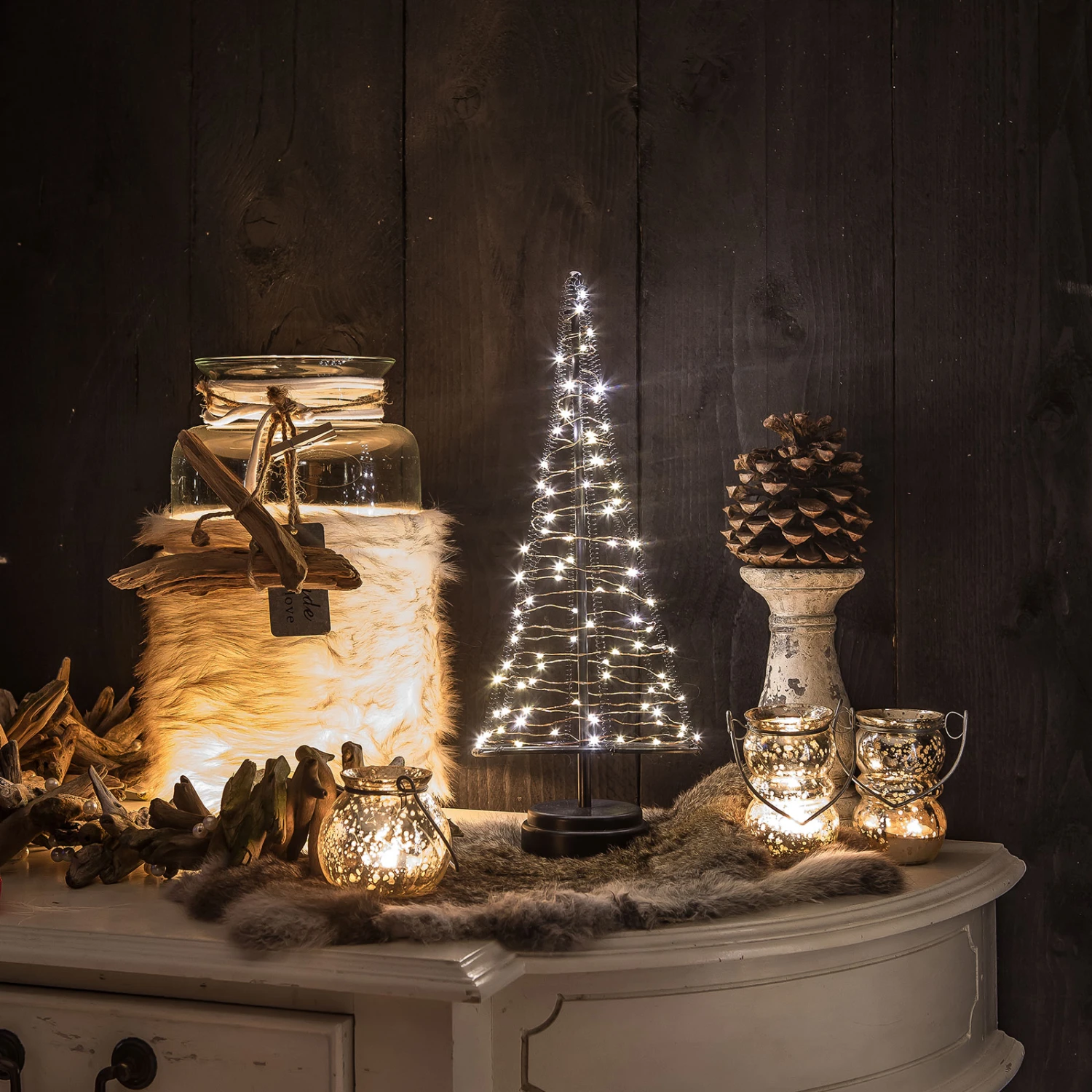 Der Deko-Weihnachtsbaum Santa’s Tree erzielt mit einfachen Mitteln eine große Wirkung. Er besteht aus einem runden Fuß und einem stabförmigen Ständer mit schwarzer Oberfläche, an dessen Spitze Draht-Spiralen entspringen. In Kombination mit einem unteren Führungsring ergibt sich eine Baumsilhouette. Das mit den warmweiß leuchtenden LEDs besetzte Kabel in Kupferoptik wird aufsteigend um den Baum geführt. Santa’s Tree lässt sich vielseitig im Innenbereich platzieren – vom Boden, über der Kommode, bis zur Fensterbank.