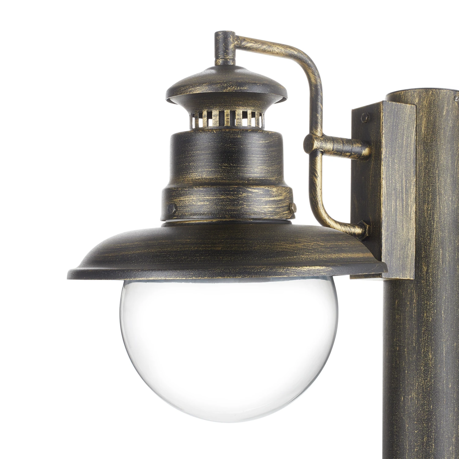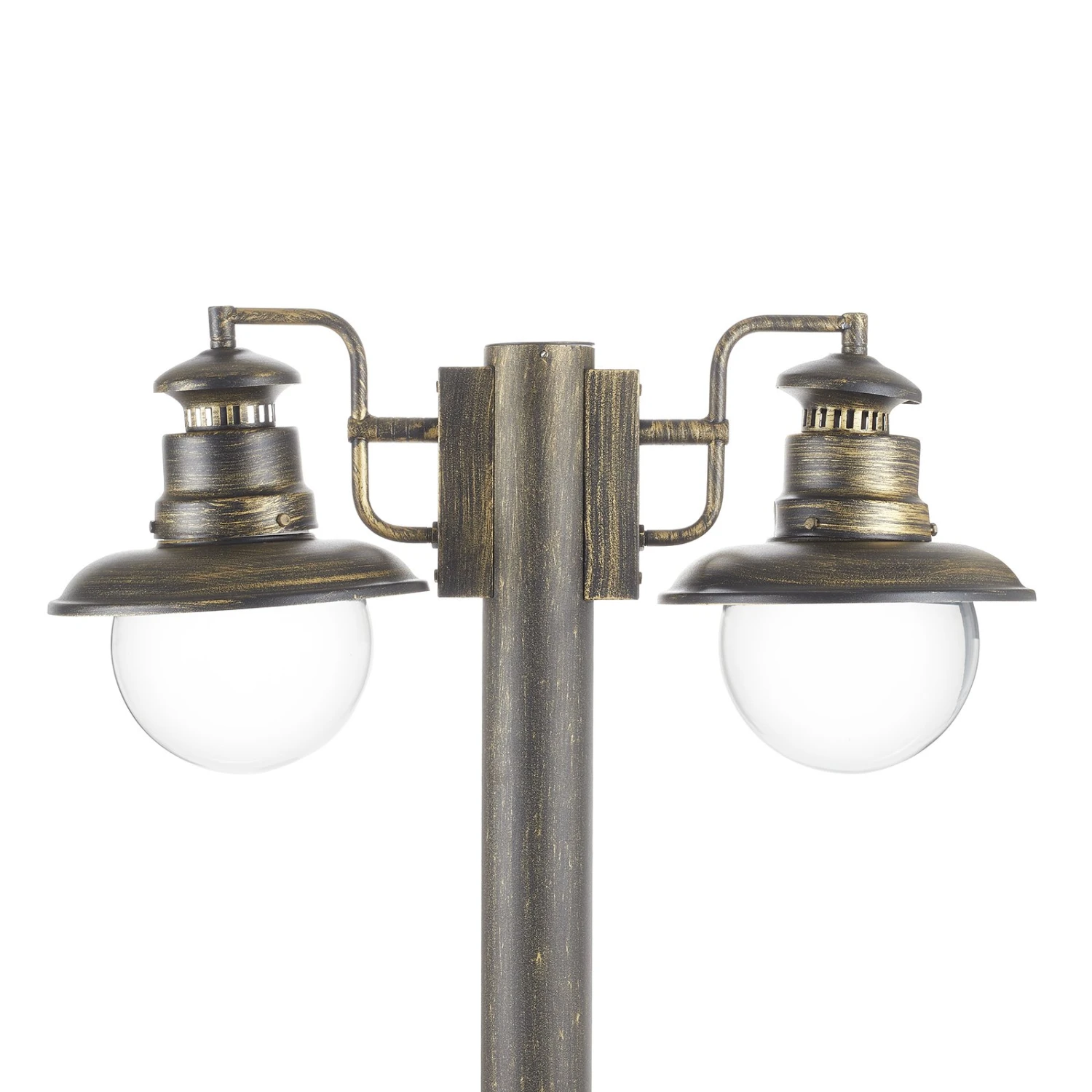 Wege, Zufahrten oder Gartenanlagen lassen sich mit der zweiflammigen Mastleuchte Artu hell beleuchten, denn durch das klare Glas der Schirme strahlt das Licht der Leuchtmittel – wahlweise eine herkömmliche Glühlampe bis 60 W oder auch moderne und langlebige LED-Leuchtmittel – ungehindert in die Umgebung aus. Das schwarz-goldene Finish des Metalls und die klaren Leuchtenschirme aus Glas lassen sie auch tagsüber zu einem dekorativen Accessoire auf dem Grundstück werden.
