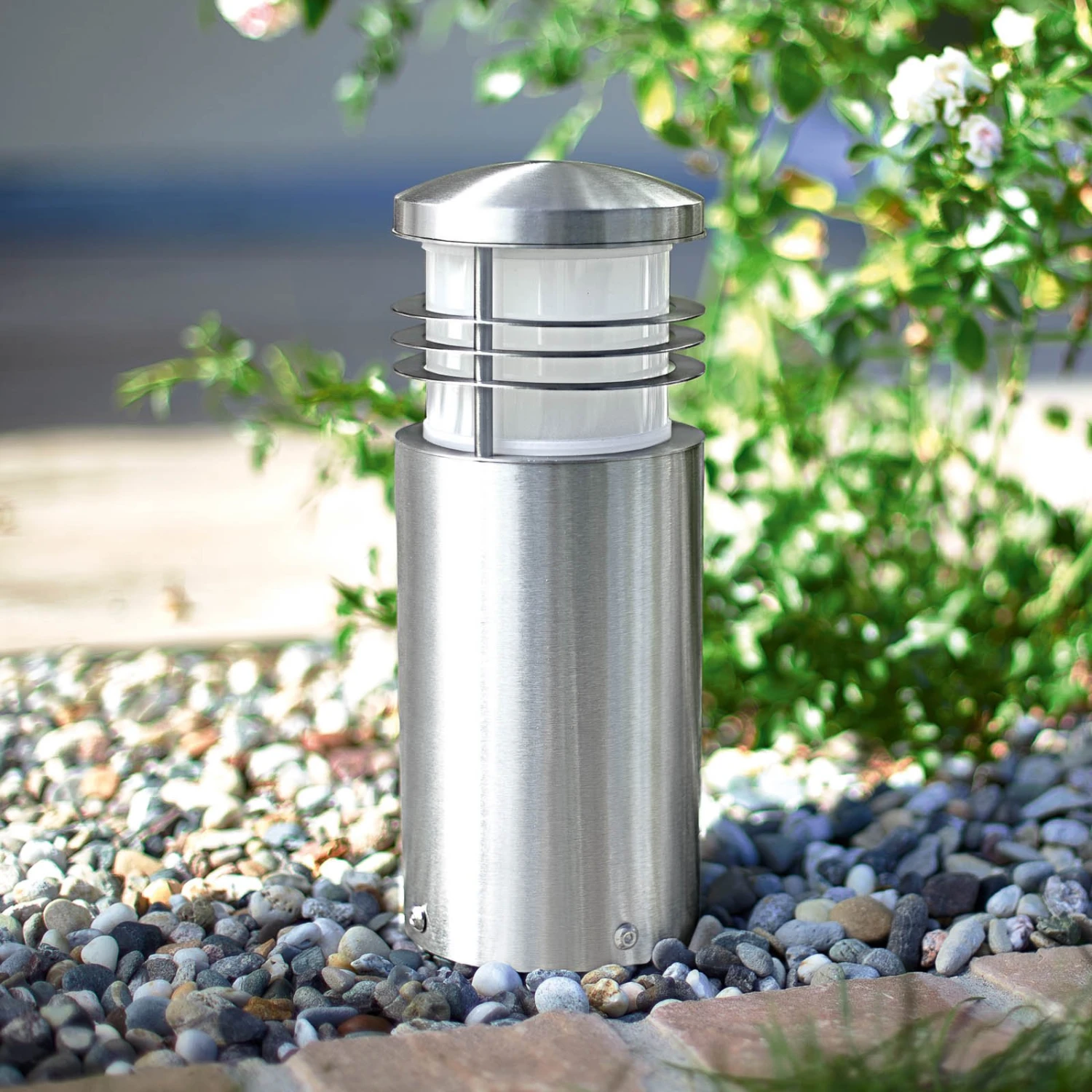 Auch in Küstenregionen kann die Sockelleuchte Creo problemlos zur Außenbeleuchtung eingesetzt werden, denn sie wurde aus hochwertigem V4A-Edelstahl mit einem Diffusor aus PVC gefertigt. Schutzart IP44 schützt sie vor festen Fremdkörpern mit einem Durchmesser von weniger als 1 mm und gegen Spritzwasser. Die Sockelleuchte ist für den Betrieb mit Energiesparlampen oder LED-Lampen mit einer Maximal-Wattage von 15 W konzipiert. Das Leuchtmittel ist nicht enthalten – bitte zusätzlich bestellen.