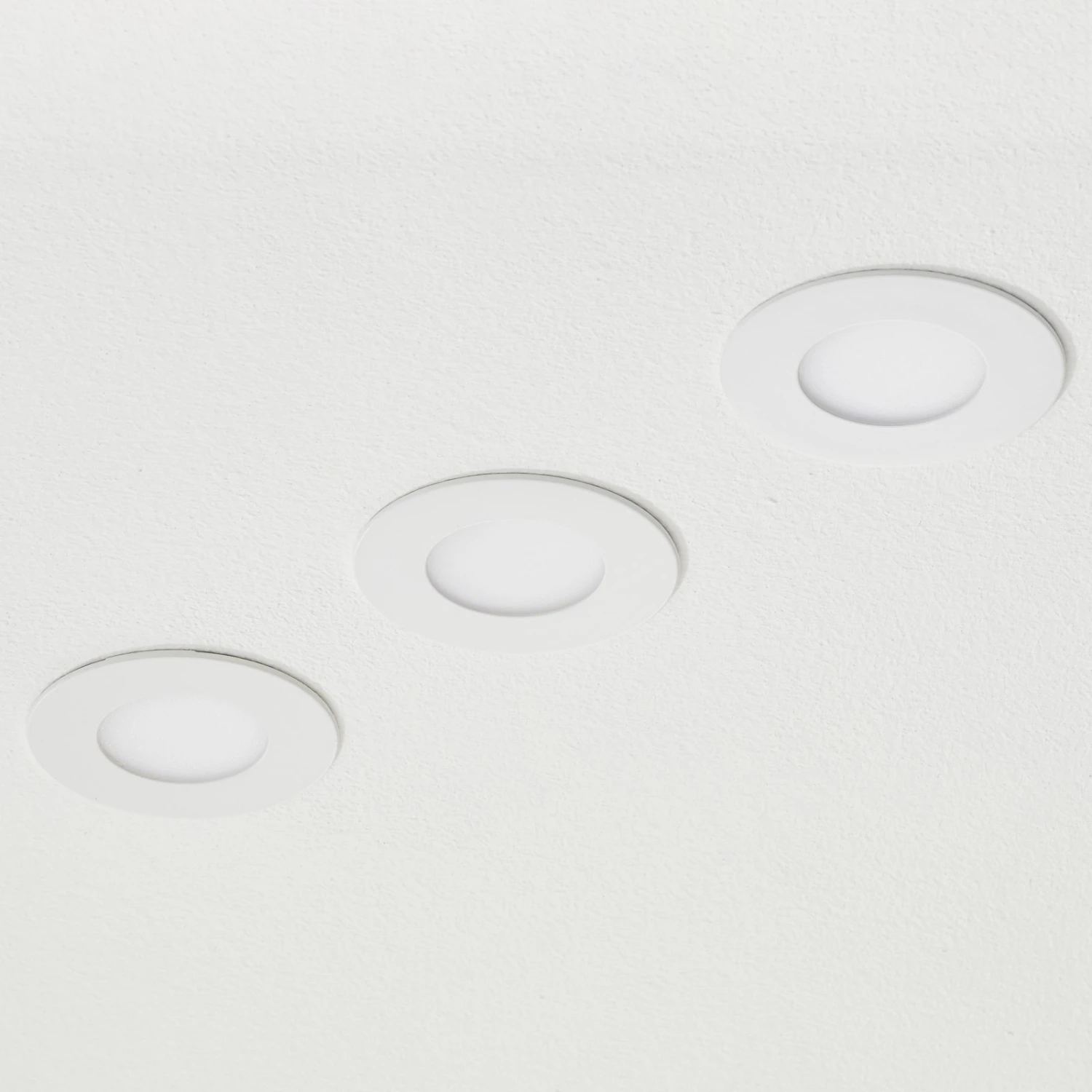 Der LED-Einbauspot Fueva-C ist mit einem dezenten Metallrahmen in Weiß ausgestattet und wird als praktisches 3er Set geliefert. Dank ihres harmonischen Erscheinungsbilds sind sie im ausgeschalteten Zustand auf weißen Untergründen nahezu unsichtbar.