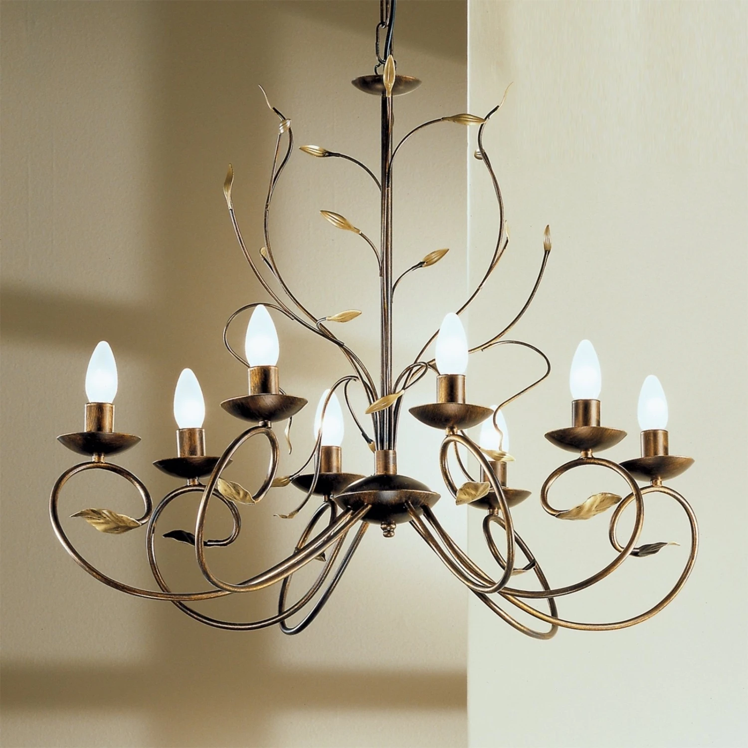 Schlichte Eleganz strahlt dieser Kronleuchter im dezenten Florentinerstil aus. Elegant ranken sich wenige „Zweige“ mit gemäßigtem Blattwerk aus antik-goldenem Eisen um strahlende Kerzenlampen.