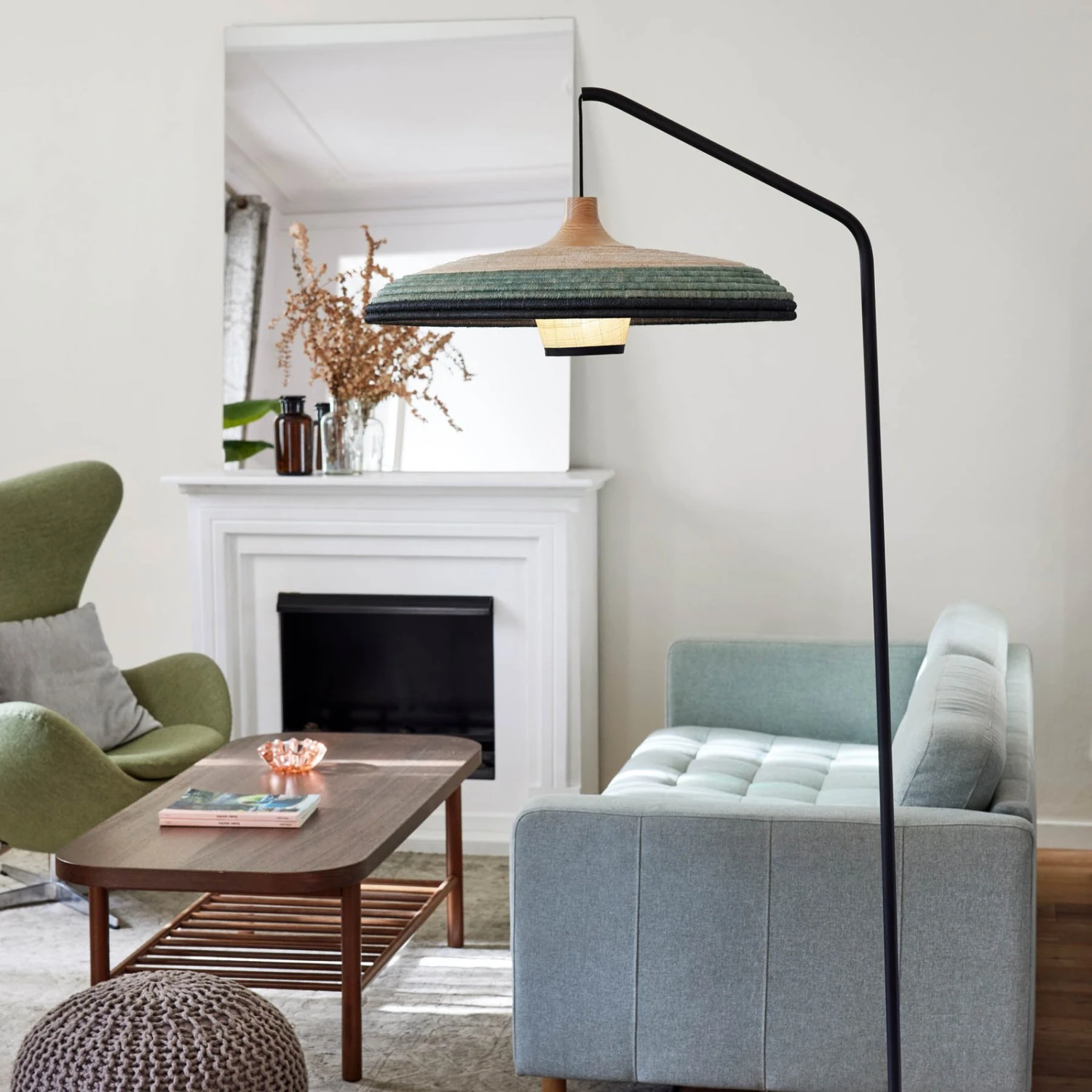 Der weite, tellerförmige Schirm der Stehleuchte Grass wurde in harmonischen Farben im Streifendesign aus dem Naturmaterial Abacà gefertigt. Diese Pflanzenfaser wird aus dem inneren Teil des Abacà-Baumes gewonnen und zeichnet sich durch eine hohe Zugfestigkeit und durch Langlebigkeit aus, weshalb sie auch beispielsweise zur Herstellung von Schiffstauen verwendet wird. Am weiten, flachen Schirm wurde nach unten gerichtet ein kleiner Schirm aus Raffiafasern angebracht, der das Leuchtmittel verhüllt und damit eine blendfreie Lichtstrahlung gewährleistet. Das Gestell der Stehleuchte Grass besteht aus schwarzem Metall und ist mit einem zierenden Holzdetail dekoriert.