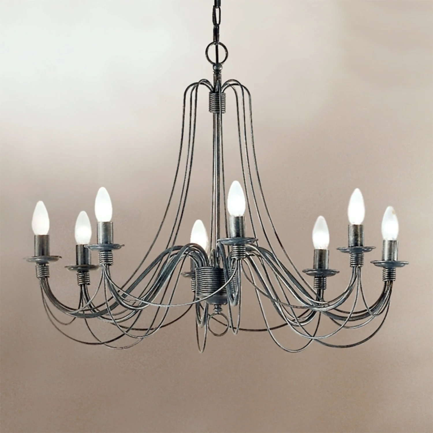 Die Schmiedekunst machts möglich – acht Kerzen scheinen auf schwebenden Seilen zu tanzen und verbreiten stimmungsvolle Helligkeit. Der Leuchter ist mit einem Durchmesser von 80 cm und 8 Leuchtmitteln auch für große Räume geeignet.