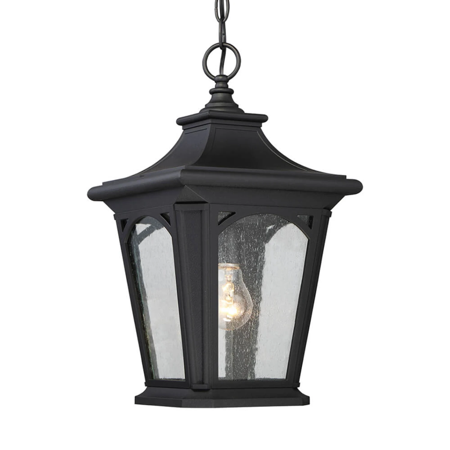 Die mit Kettenabhängung ausgestattete Hängeleuchte Bedford erweist sich als klassische Schönheit, die zu vielen Grundstücks- und Fassadenstilen passt. Die schwarz gestaltete Laterne wurde aus witterungsbeständigem Polycarbonat hergestellt. Bedford widersteht aber nicht nur Hitze und Kälte, sondern zeichnet sich auch durch Seewasserfestigkeit aus, d. h., diese wunderschöne Lichtquelle kann auch auf küstennahen Grundstücken genutzt werden.