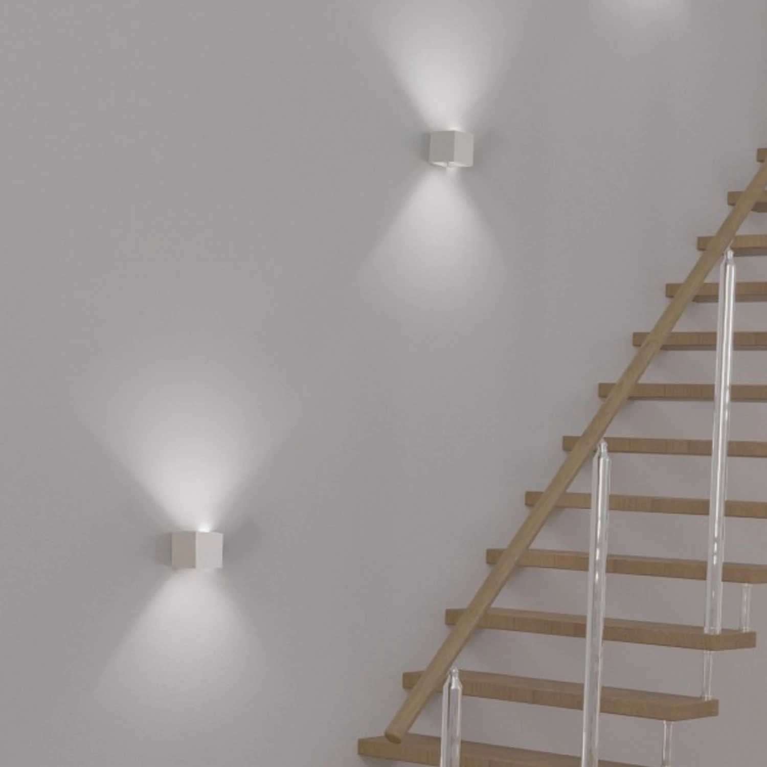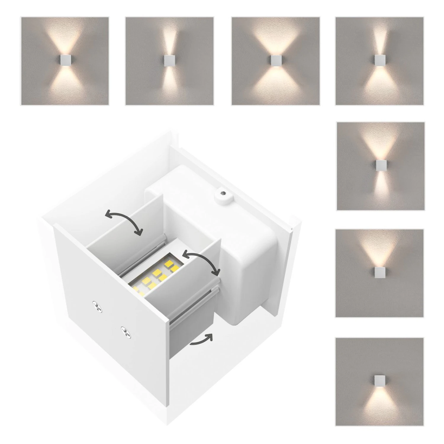 Äußerlich präsentiert sich diese Wandleuchte in Würfelform und mit einem modernen, einfarbigen Finish. Sie ist dafür ausgelegt, das Licht sowohl nach oben als auch nach unten abzugeben. Jedoch ist es ebenfalls möglich, beide Lichtkegel separat mit Hilfe von Metallklappen im Inneren anzupassen oder eine Seite vollständig zu schließen. Da diese LED-Leuchte gegen Spritzwasser geschützt ist, steht auch der Verwendung im geschützten Außenbereich nichts entgegen.