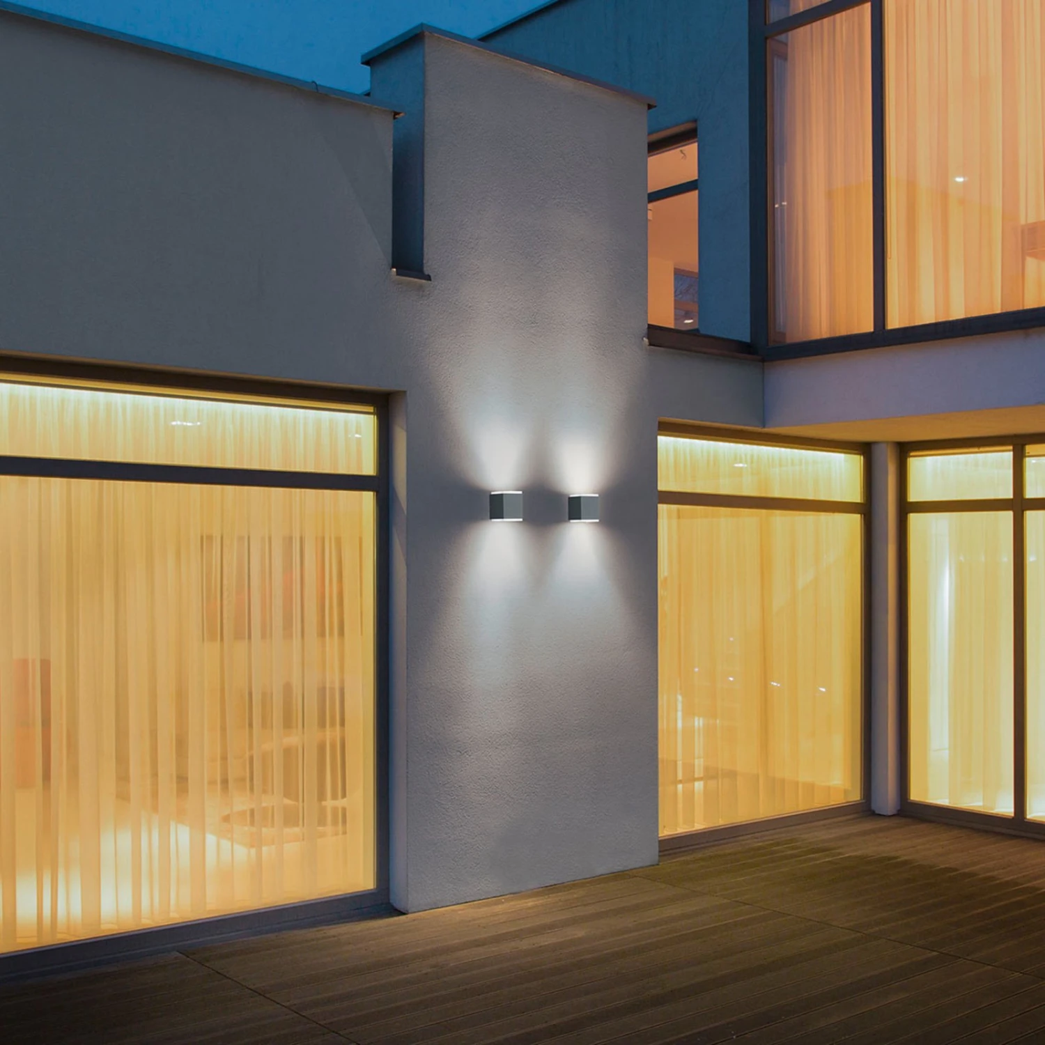 Als Eingangsbeleuchtung rechts und links neben der Haustür, als Lichtquelle für die Terrasse oder für Wege rund um das Haus und gleichzeitig zur Beleuchtung der Fassade bietet sich die kleine, würfelförmige LED-Außenwandleuchte Kibo an. Die graphitfarbene Pulverbeschichtung und die eckige Gestaltung machen sie zum modernen und doch schlichten Lichtspender, der seine effektvolle Wirkung erst mit dem Einschalten des Lichtes erzielt. Dann nämlich strahlt das Licht aufwärts und abwärts an der Fassade entlang und setzt damit einzigartige Lichteffekte, besondes dann, wenn die Leuchte zu mehreren montiert wird.