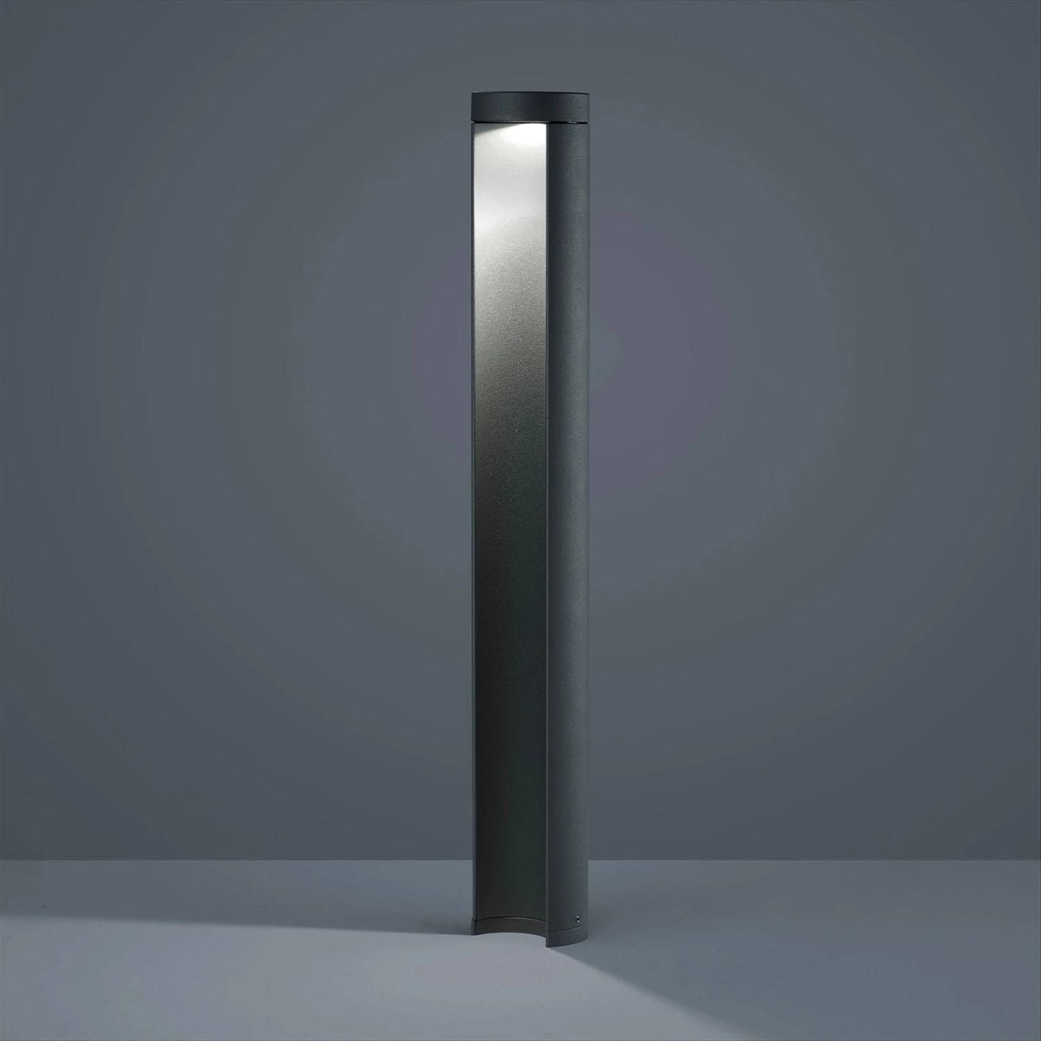 Wie ein nach einer Seite geöffnetes Rohr ist die in dunklem Graphitton pulverbeschichtete LED-Wegeleuchte Sky gestaltet. Warmweiße LEDs sind in der oberen Abdeckung verbaut und geben ihr Licht nach unten in die geöffnete Röhre ab. Hierdurch wird die Leuchte selbst in Szene gesetzt und ein blendfreier Lichtkegel auf dem Boden erzeugt.