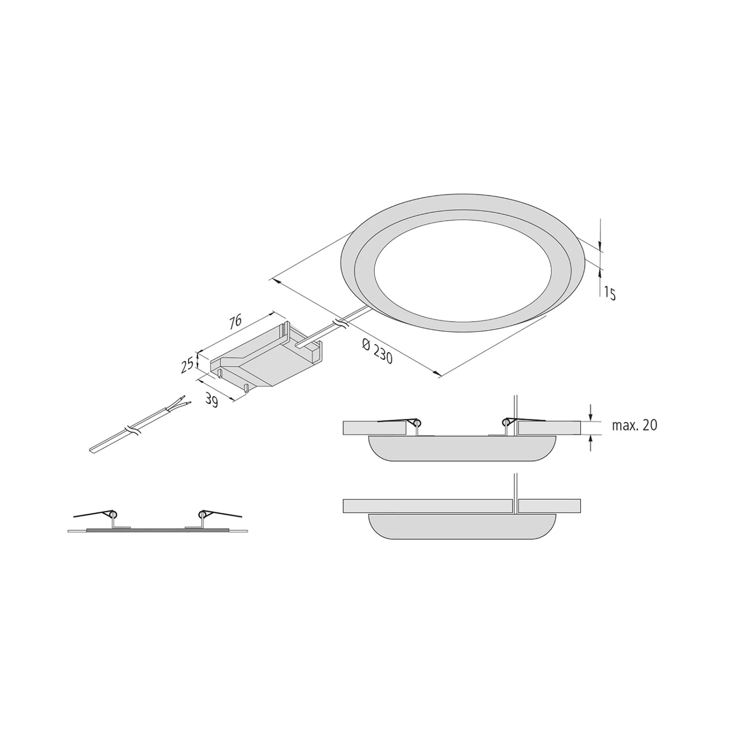 Die runde LED-Deckenleuchte FR 65/205 kann als Anbauleuchte verwendet werden, lässt sich aber auch in Decken einbauen. Sie passt sehr flexibel in Bohrungen von 6,5 bis 20,5 cm und in Deckenplatten mit einer Stärke von max. 2 cm dank verstellbarer Montagefeder. Die Deckenleuchte ist mit einer Anschlussklemme für den Direktanschluss an 230 V und integrierter Durchgangsverdrahtung ausgestattet, so dass sie problemlos zur Beleuchtung größerer Bereiche in einer Reihe durchverdrahtet werden kann und sich die Montage sehr einfach gestaltet. Mit der LED-Deckenleuchte FR 65/205 lassen sich deshalb besonders gut lange Flure mit abgehängten Decken beleuchten. Energieeffiziente LEDs spenden hinter der satinierten Abdeckung eine gleichmäßige Beleuchtung ohne sichtbare Lichtpunkte und können über einen Phasendimmer in der Gebäudeinstallation (nicht enthalten) auch gedimmt werden.