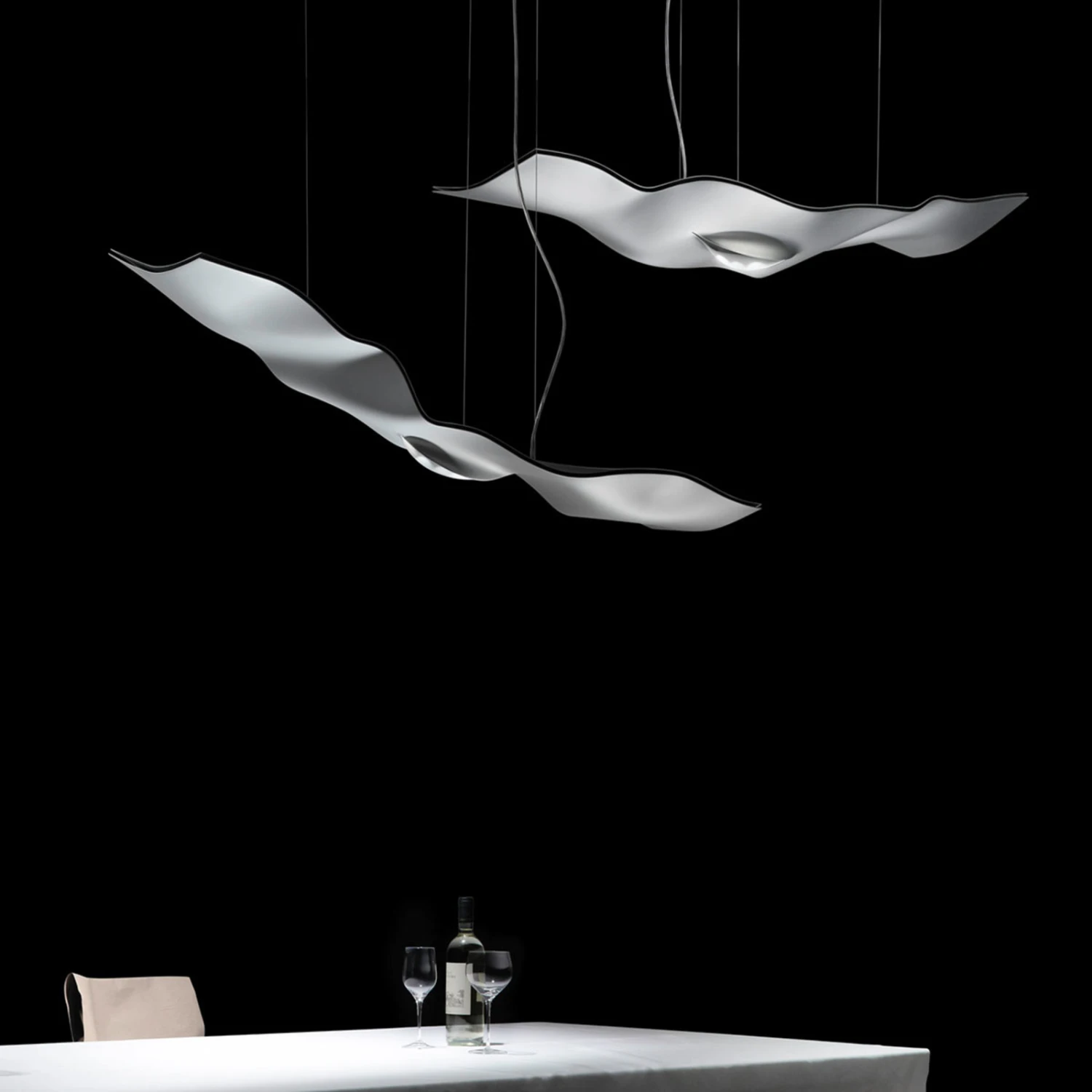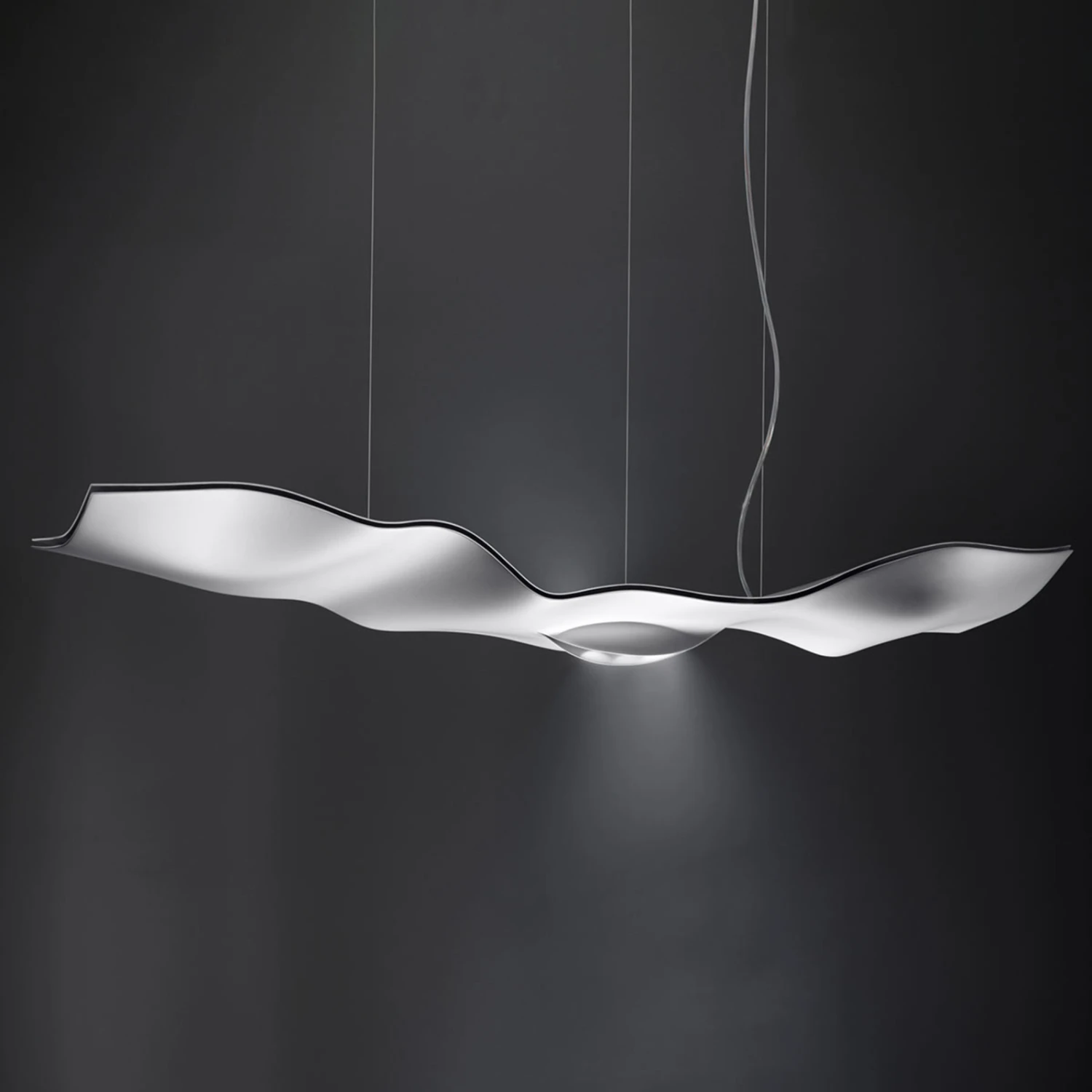 „Fliegendes Licht“ – mit diesem poetischen Ausdruck wurde das Hängeleuchten-Modell Luce Volante von Ingo Maurer betitelt. Das Design lässt erahnen, warum die Leuchte so heißt. Der Leuchtenkörper aus Aluminium und Glasfaser sieht aus wie ein federleichtes Blatt Papier oder ein Stück Stoff, das im Wind flattert. In der Mitte dieses leicht wellenförmigen Blattes befindet sich die Lichtquelle.