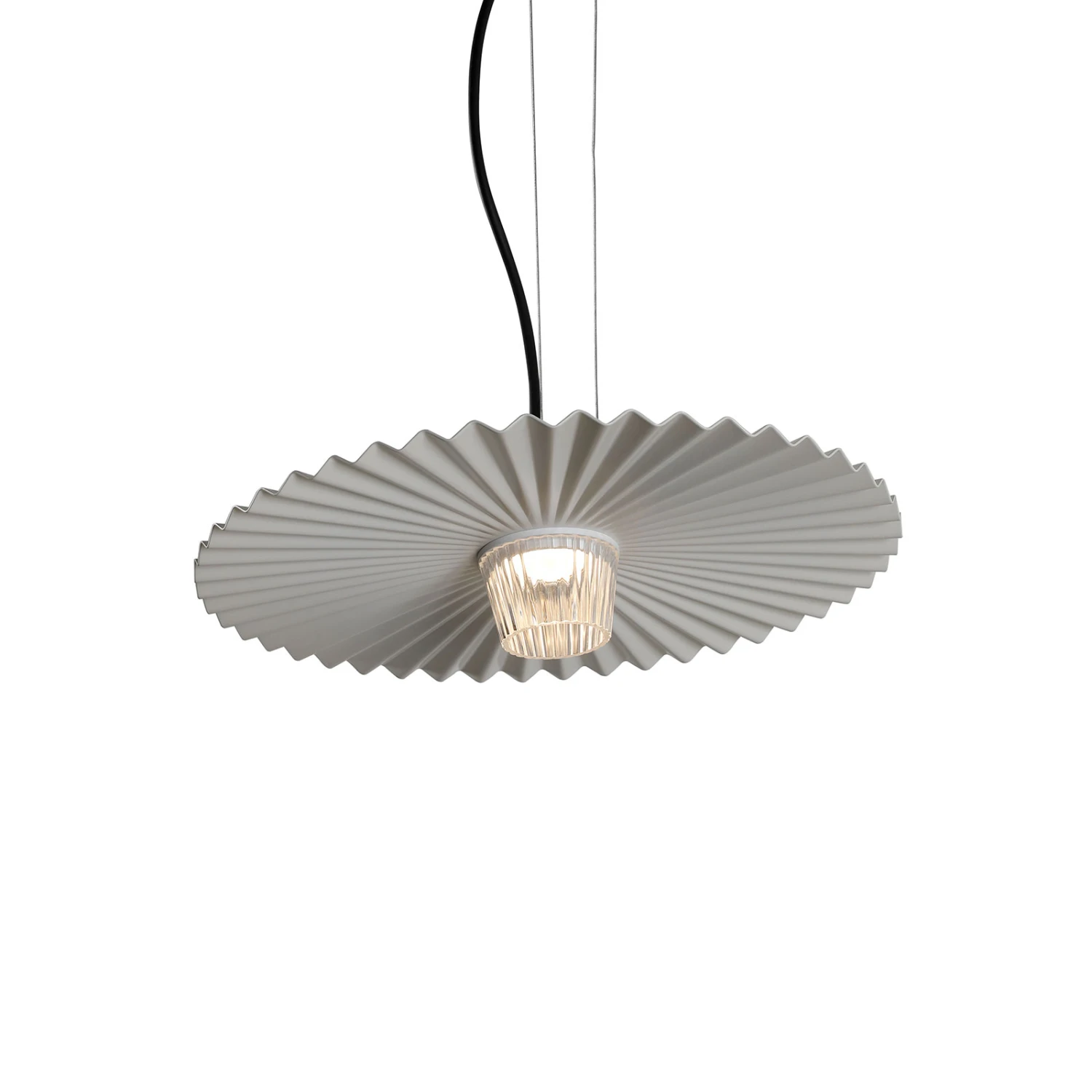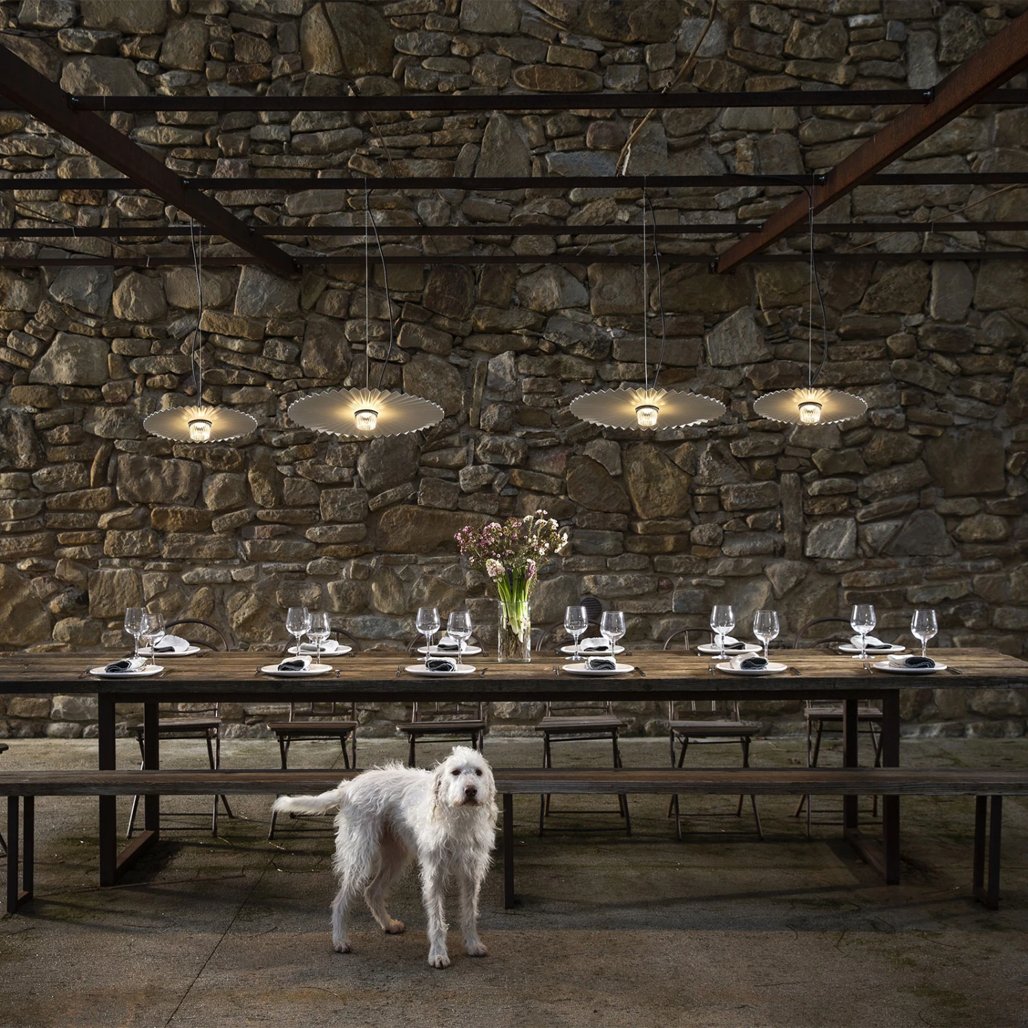 Mit Luca De Bona, Dario De Meo und Matteo Ugolini trugen gleich drei Designer zu Gonzaga bei. Das Motiv ist ein minimalistisches Faltenmuster, dessen vom Zentrum linear nach außen orientierte Struktur den in den unendlichen Raum strebenden Lichtstrahlen zu folgen scheint. Unterhalb der aus Aluminium bestehenden runden Scheibenform befinden sich die warmweiß leuchtenden LEDs innerhalb einer klaren, geriffelten Abdeckung. Die gegen Witterungseinflüsse resistente Pendelleuchte Gonzaga kann über einen geeigneten Dimmer gedimmt werden und ist überaus vielseitig einsetzbar – vom hochwertig eingerichteten Wohn- und Esszimmer bis zur Veranda, Terrasse oder dem Eingangsbereich.