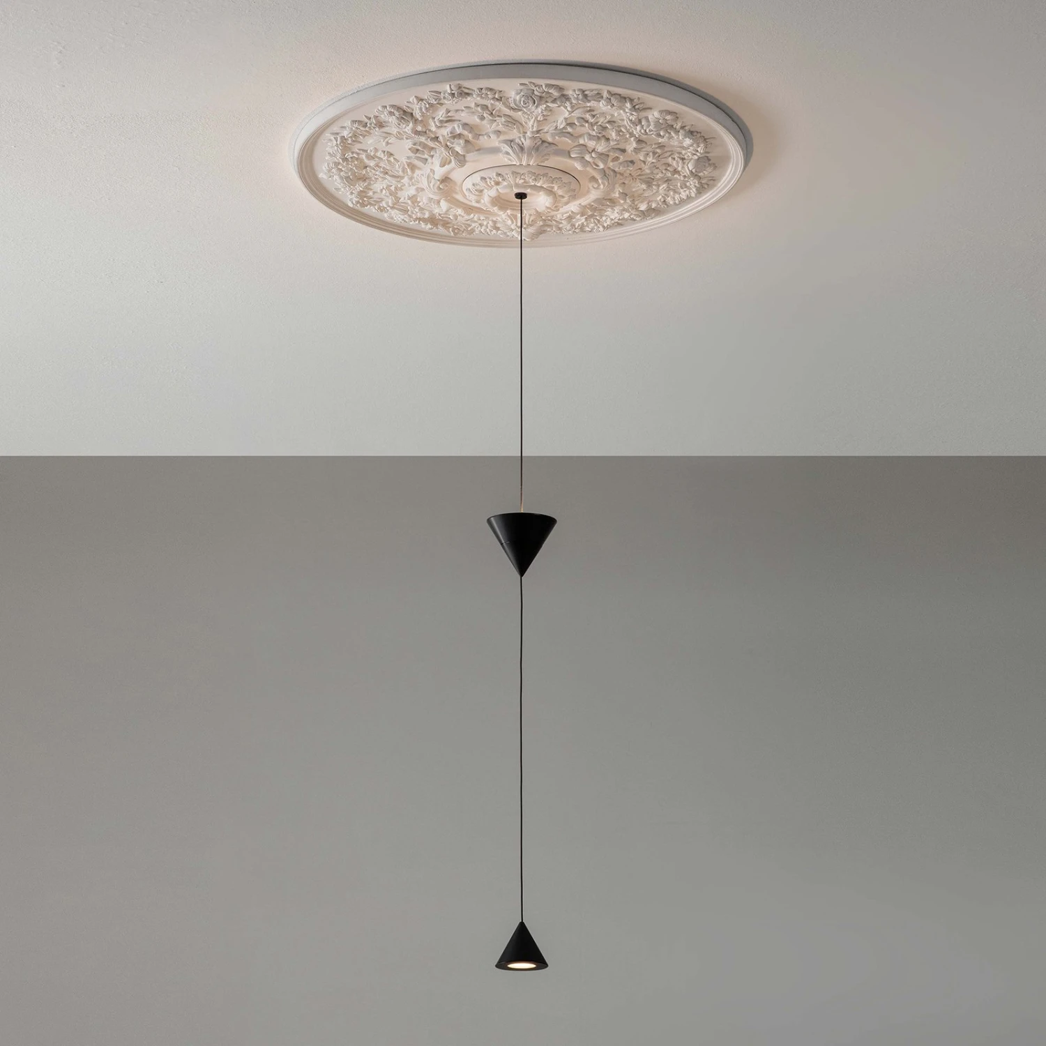 Die Verbindung einer weißen Gips-Deckenrosette mit Blumenmuster und kegelförmigen Lampenschirmen aus schwarzem Aluminium ist ein gewollter Stilbruch, der so gekonnt umgesetzt ist, dass das Endergebnis durchaus harmonisch auf den Betrachter wirkt. Noch angenehmer kann das Licht der warmweißen LEDs durch einen externen Phasenabschnittsdimmer gestaltet werden. Mit diesem fungiert der Wandschalter gleichzeitig als Dimmer.