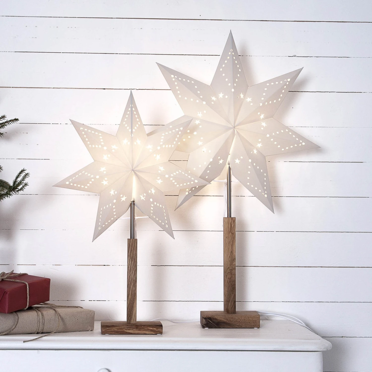 Einen sehr natürlichen Eindruck macht die mit Holz-Standfuß und Metallgestell bestückte Dekoleuchte Karo, die von einem siebenzackigen, aufwendig gemusterten Stern gekrönt wird. Dank ihres natürlichen Looks ist sie genau das richtige Dekoaccessoire für z. B. den skandinavischen Wohnstil.