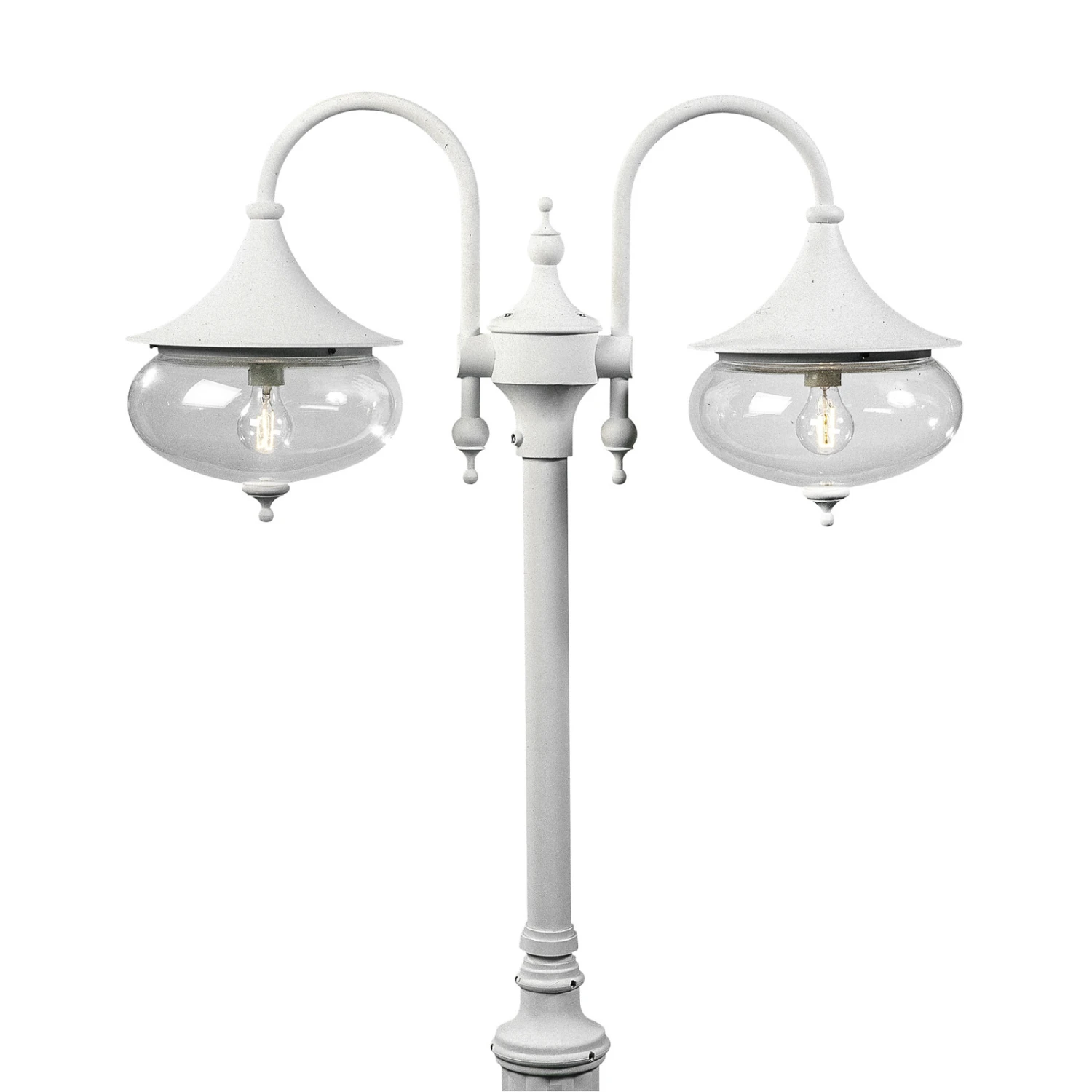 Klassische Aluminium-Mastleuchte mit 2 großen Schirmen, die beidseitig an dekorativen, gebogenen Armen hängen und durch das klare Acrylglas eine hervorragende Ausleuchtung garantieren.