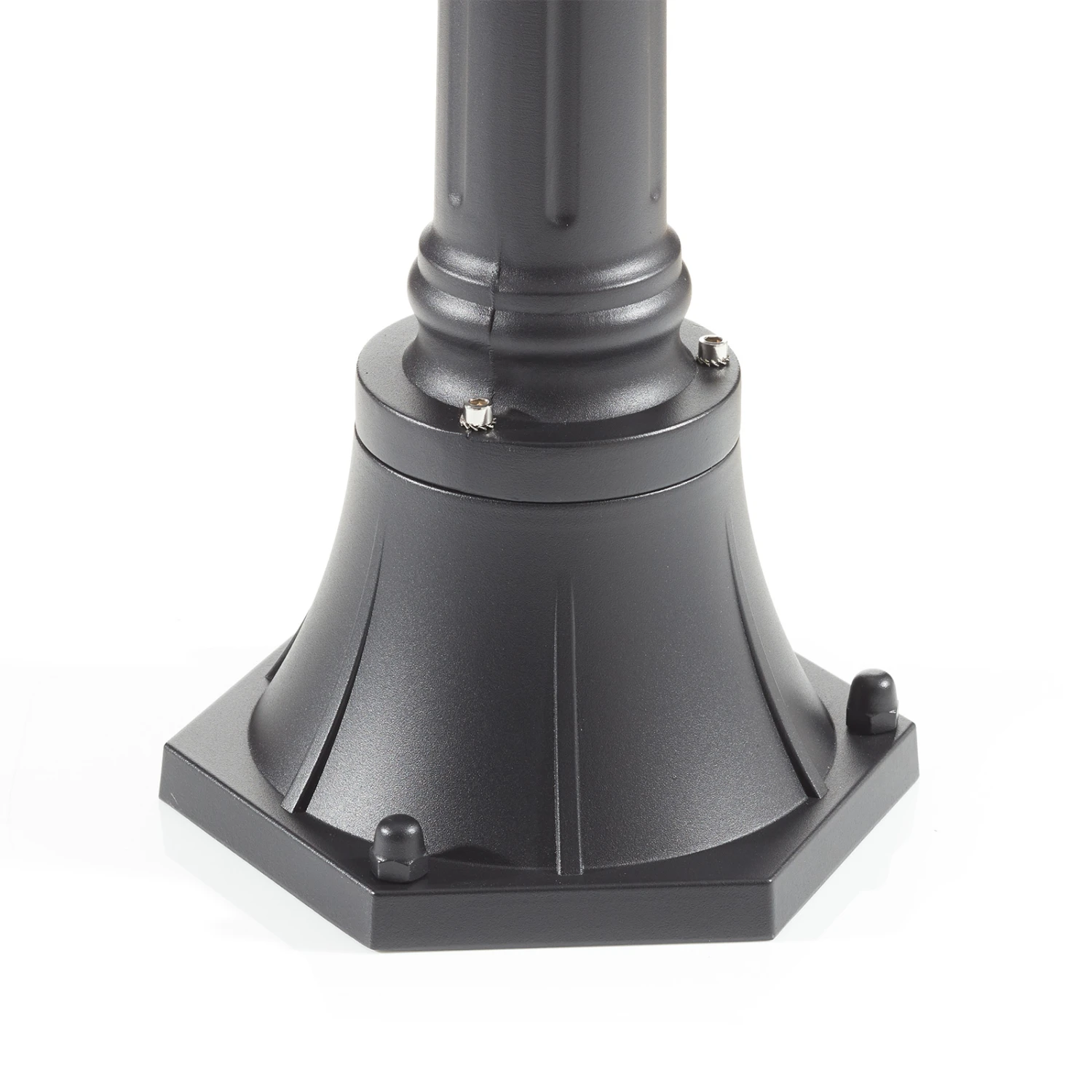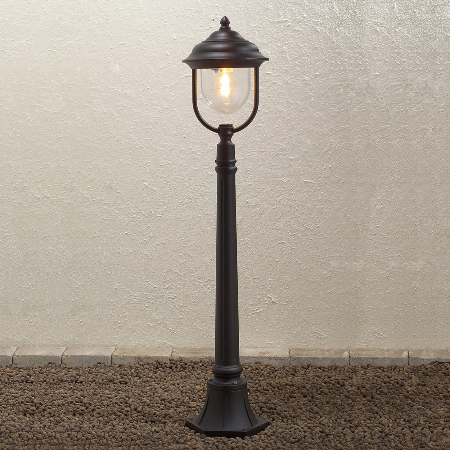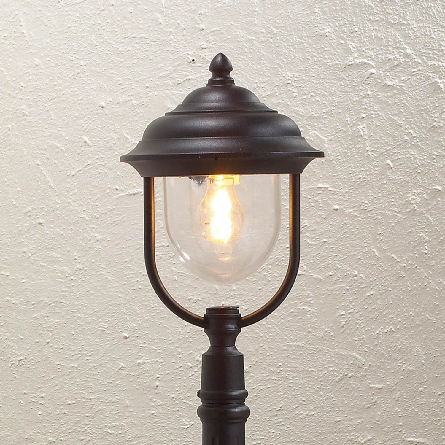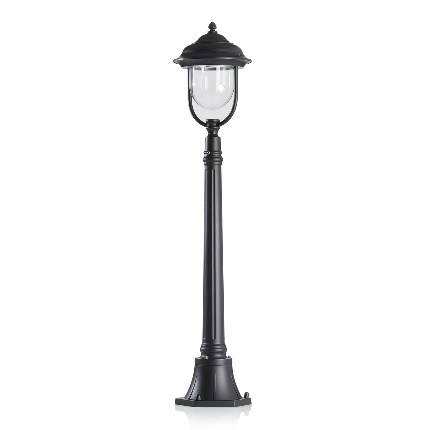 Klassische, aus Aluminium gefertigte Wegeleuchte Parma. Das klare Leuchtenglas garantiert eine optimale Ausleuchtung. Der schön geformte Schirm und die Verzierungen an Leuchte und Mast verleihen der Leuchte eine leicht nostalgische Wirkung.
