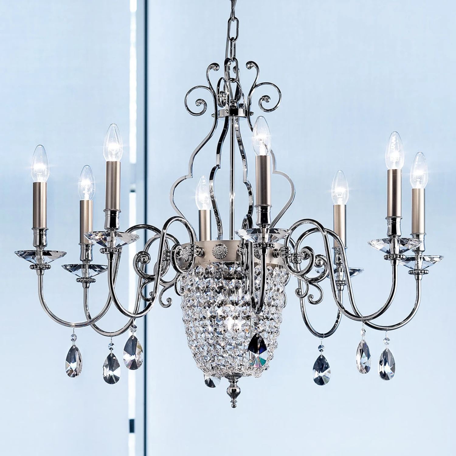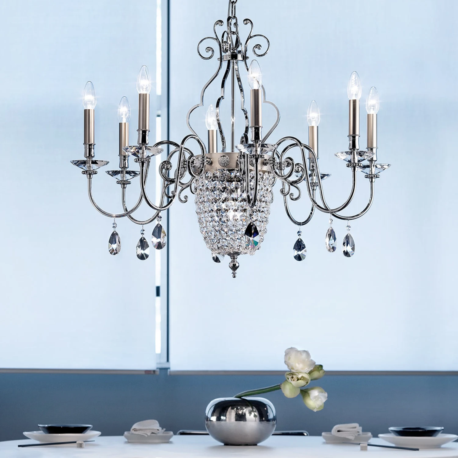 Elegantia ist ein Kronleuchter in klassischer Form, der durch die Kombination des Gestells aus verchromten Leuchtenarmen und zierenden Elementen und nickel-matt gestaltetem Mittelteil und Kerzenschäften eine besondere Ausstrahlung erhält. Geschliffene Glaselemente in kleiner, runder Form und in Form großer Tropfen bilden den Behang des Kronleuchters und machen ihn zum schillernden Lichtobjekt über einem Tisch.