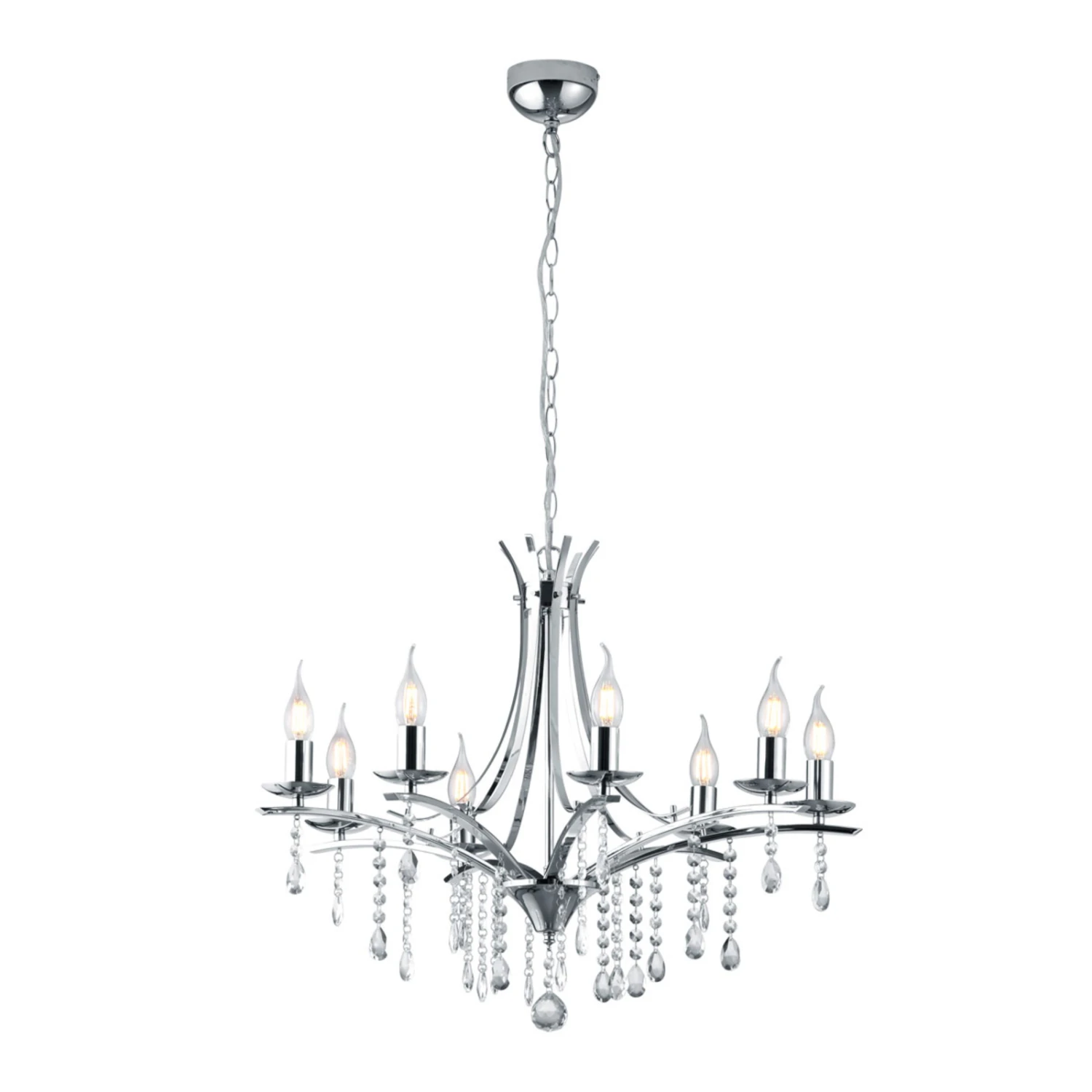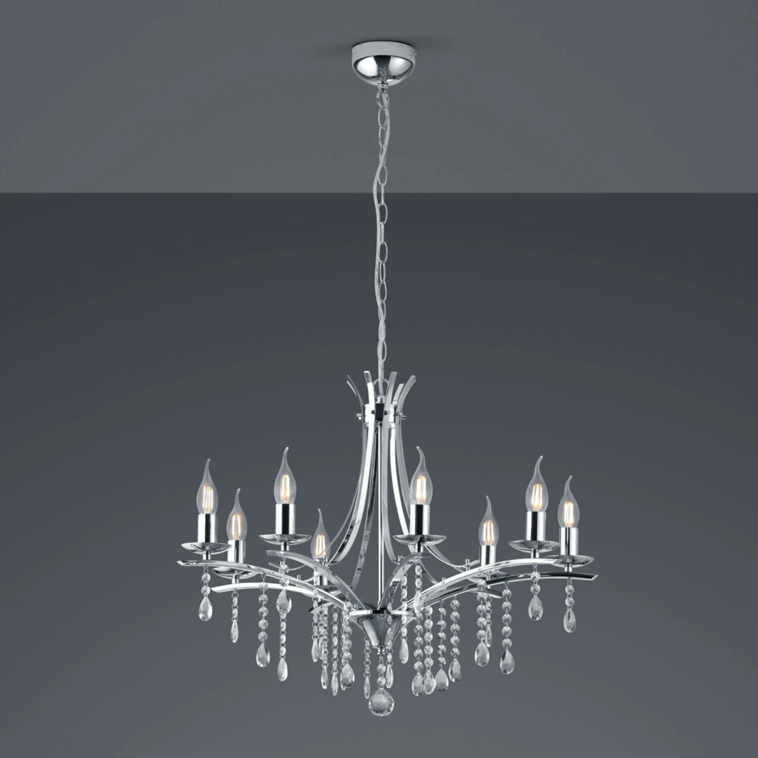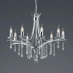 Die verchromte Metalloberfläche des Kronleuchters schenkt derweil funkelnde Lichtakzente, die dem Design eine noch edlere Note verleihen. Hinzu kommen mehrgliedrige Glasbehänge, die von jedem Leuchtmittel in den Raum zu tropfen scheinen und somit noch mehr Eleganz versprühen.