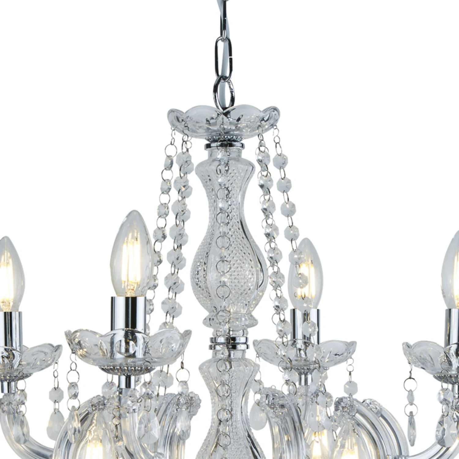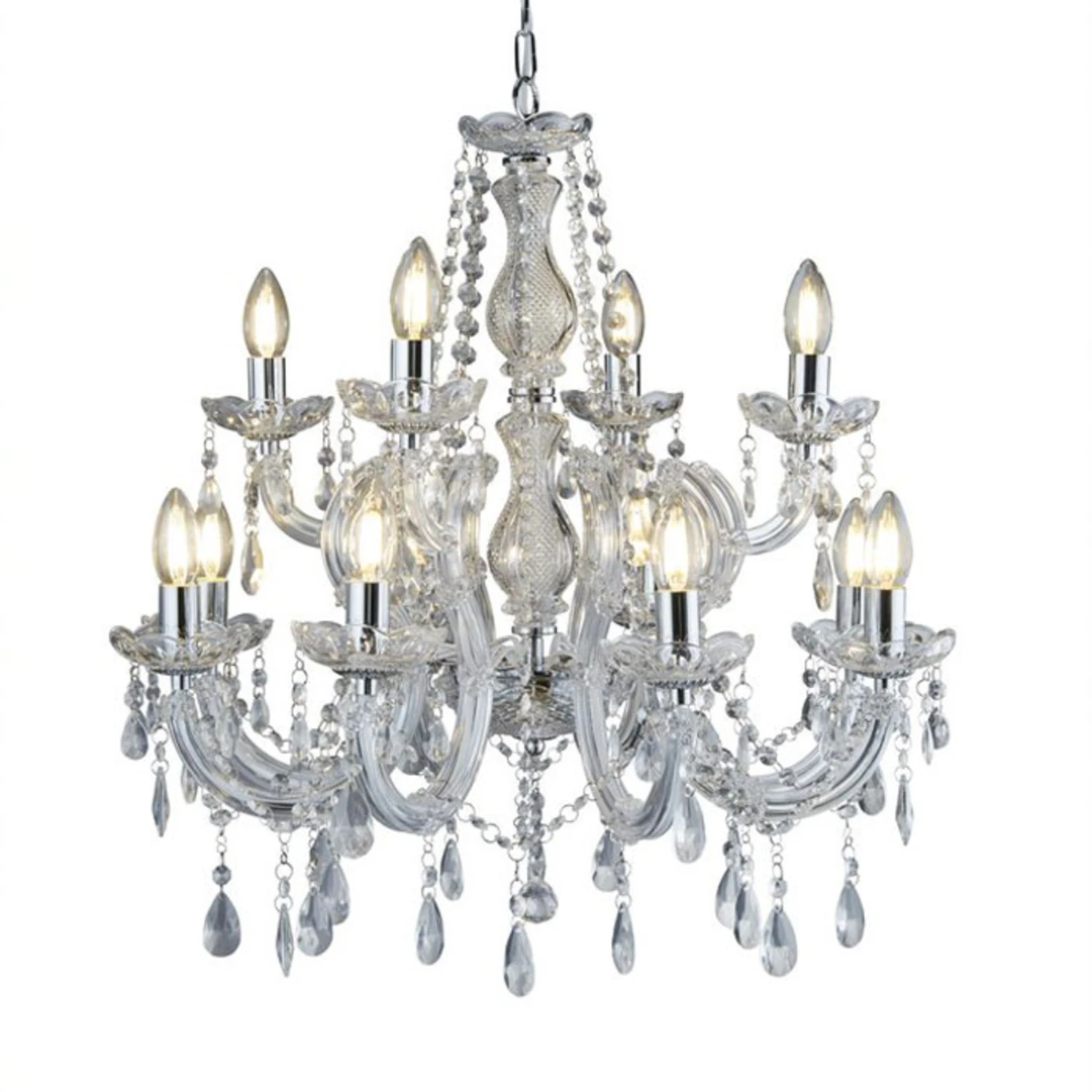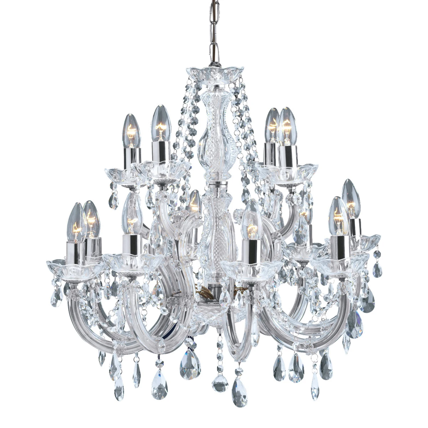 Fast gänzlich aus Acrylglas gefertigt ist der imposante Kronleuchter MARIE THERESE. Ein üppiger Behang aus geschliffenen Glaskristallen verziert das formschön gestaltete Gestell des Kronleuchters, der mit seinen 12 Kerzen für eine helle und gleichmäßige Ausleuchtung sorgt. Ergänzt wird das glanzvolle Gesamtbild durch einzelne dezente Elemente in Chromoptik, die den Kronleuchter zum Strahlen und Glänzen bringen.