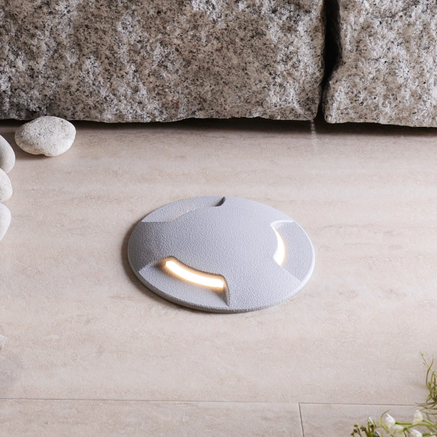 Besonderheit dieser LED-Bodeneinbauleuchte Ceci ist das im Lieferumfang enthaltene Leuchtmittel, welches eine Einstellung der Lichtfarbe ermöglicht. Es ist mit einem kleinen Schalter ausgestattet, über den sich die Lichtfarbe einstellen lässt, und zwar entweder Warmweiß (3.000 K), Universalweiß (4.000 K) oder Tageslicht (6.500 K). Die Bodeneinbauleuchte in Grau strahlt durch die drei Lichtaustritte, sodass ein interessanter Lichteffekt entsteht. Sie hält großen mechanischen Belastungen stand und ist UV- und korrosionsbeständig.