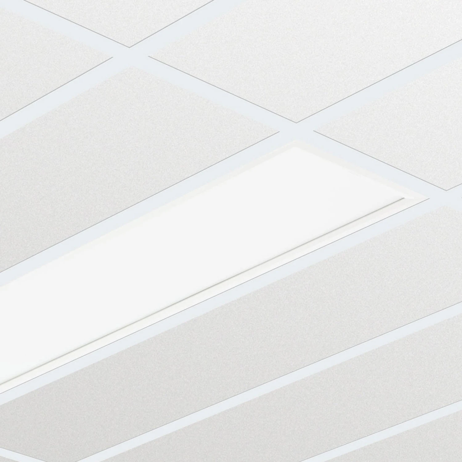 In Räumen mit Rasterdecken des Formats 120 cm x 30 cm lässt sich mit dem Einbaupanel RC132V aus der Philips CoreLine Serie eine großflächige Allgemein- und Arbeitsbeleuchtung schaffen. Dank der geringen Blendwirkung ist auch ein Einsatz über Bildschirmarbeitsplätzen möglich. Der Rahmen aus weiß lackiertem Stahl umfasst einen Diffusor aus opalem Kunststoff. Dieser streut das Licht der integrierten LEDs gleichmäßig.