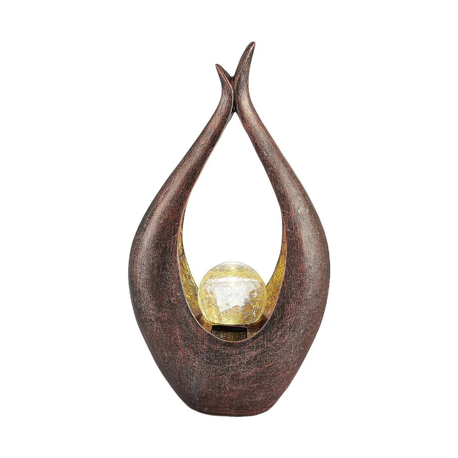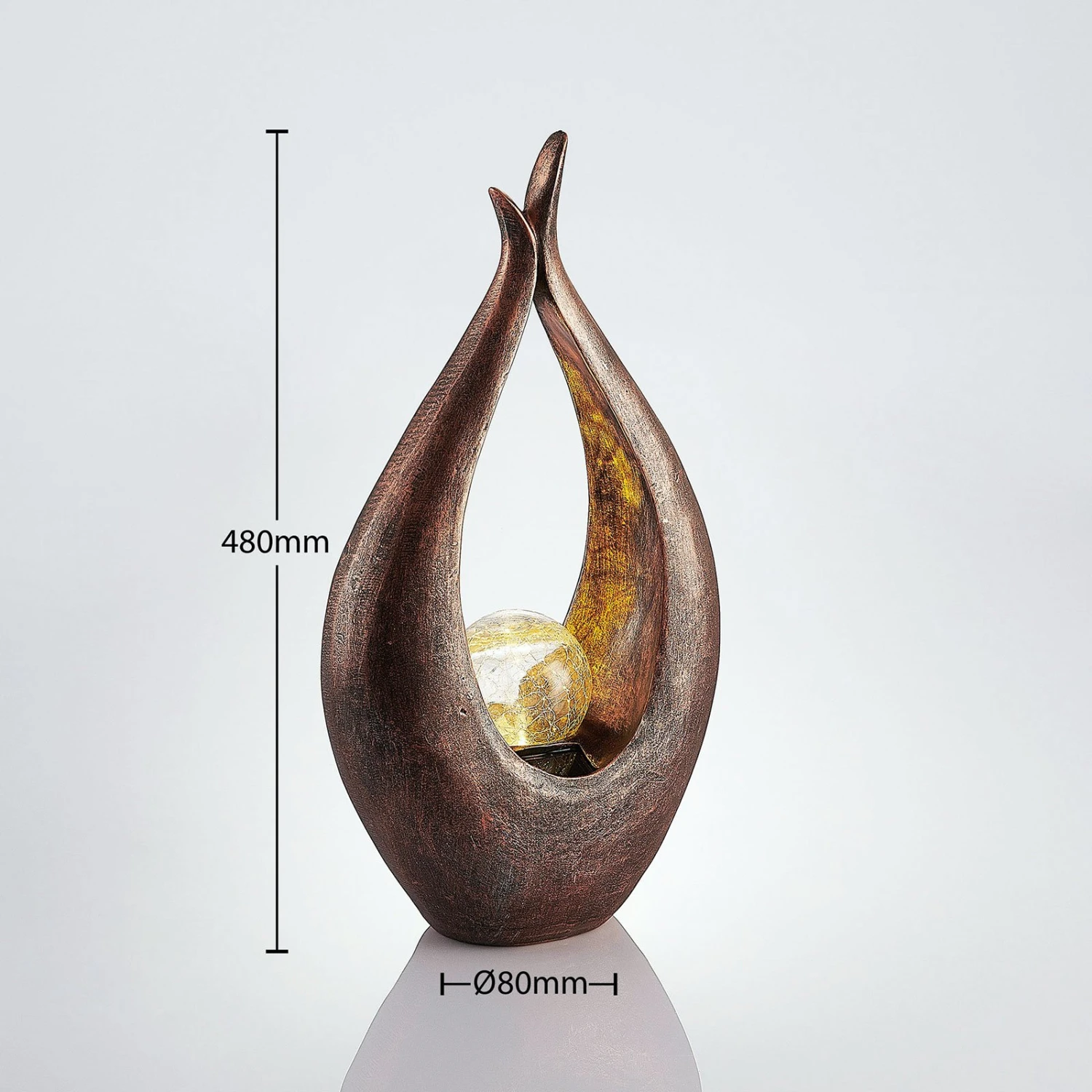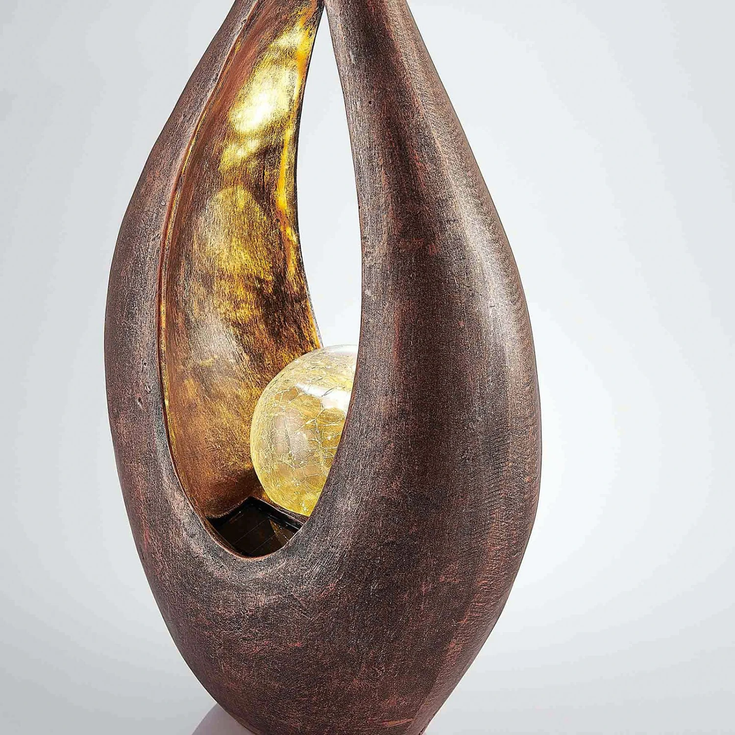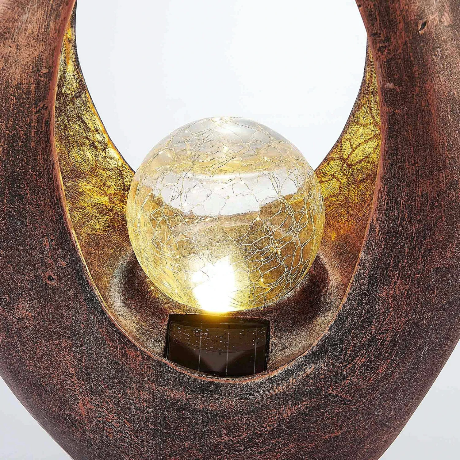 Braune LED-Solar-Dekoleuchte Adem im Ethnostyle Mit dieser Dekolampe samt Solarfläche zieht Design in den Garten ein, denn die LED-Leuchte Adem schenkt auf außergewöhnlich anmutende Art und Weise Licht neben der Sitzbank, dem Blumenbeet oder Kiesweg. Zwei nach oben geschwungene Arme, die sich an ihren Spitzen berühren, rahmen dabei den mittig platzierten Lichtball ein. Und auch das Farbkonzept weiß zu überzeugen: Der beständige Wechsel zwischen Schwarz und Braun fügt sich schön in eine natürliche Umgebung ein und steht im Kontrast zum zarten Glasball, der zugleich mit seiner gesprungenen Optik besticht.