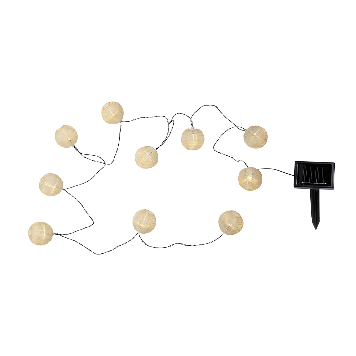 Die LED-Solarlichterkette Festival besteht aus einem Erdspieß mit einem Solarmodul und einer wiederaufladbaren Batterie. Außerdem ist sie mit einem Dämmerungssensor ausgestattet, der die Leuchte automatisch ein- und ausschaltet. Vom Erdspieß geht ein Kabel ab, an dessen Ende zehn kleine Lampions mit etwas Abstand zueinander angebracht sind. Die Lampions werden jeweils von einer LED beleuchtet, die über die Batterie mit Strom versorgt werden. Da keine zusätzliche Stromquelle nötig ist, eignet sich die Lichterkette ideal für den Außenbereich, den Garten oder den Balkon.