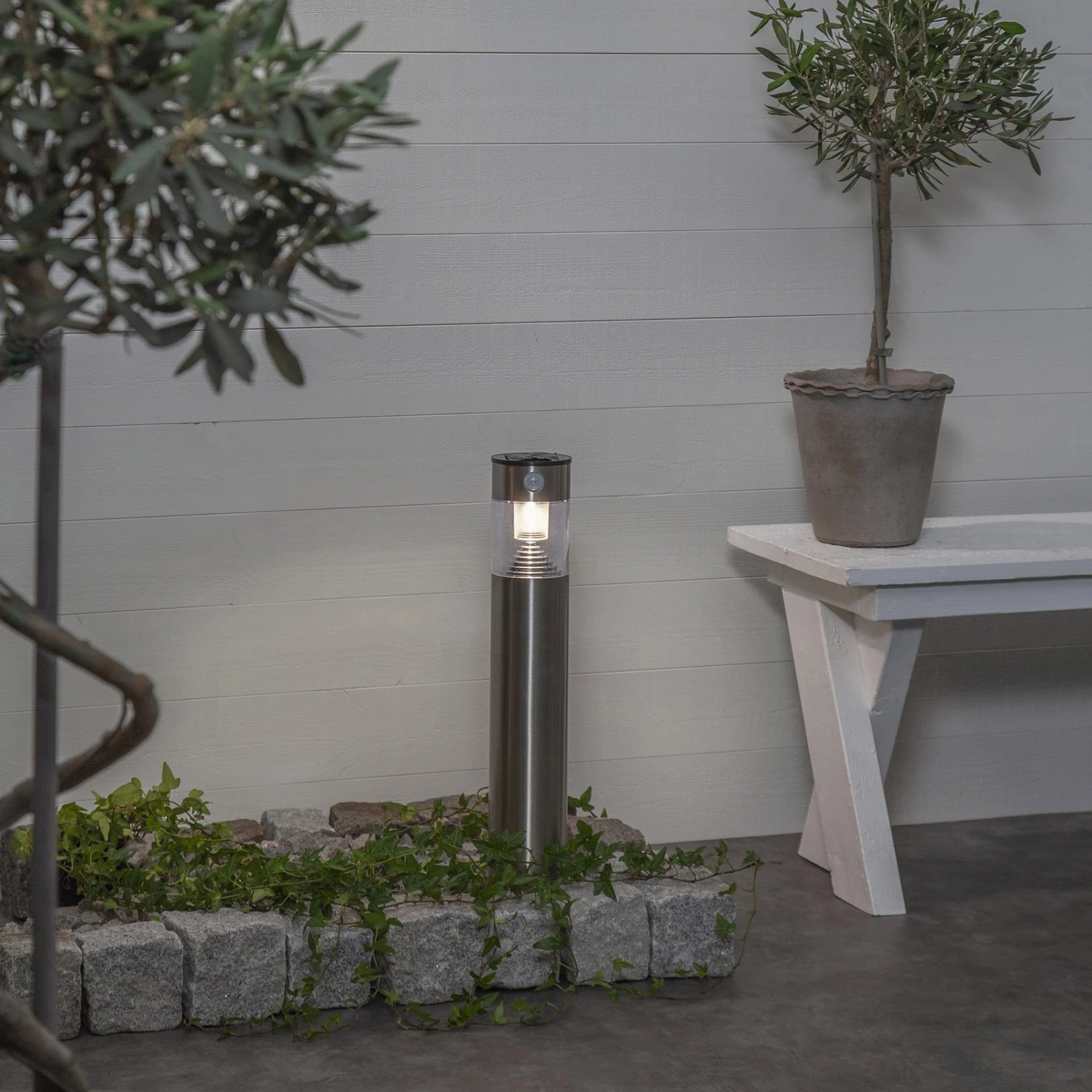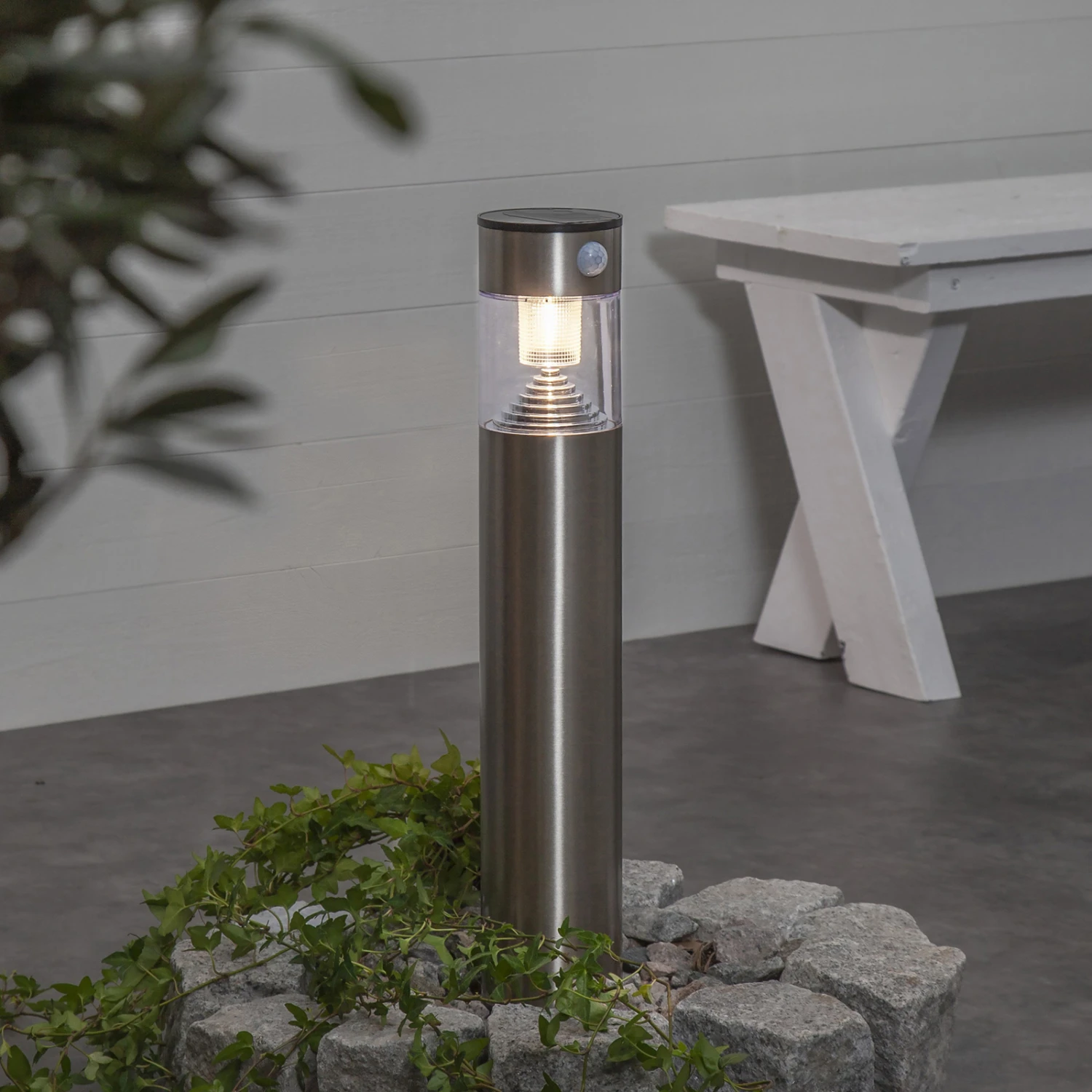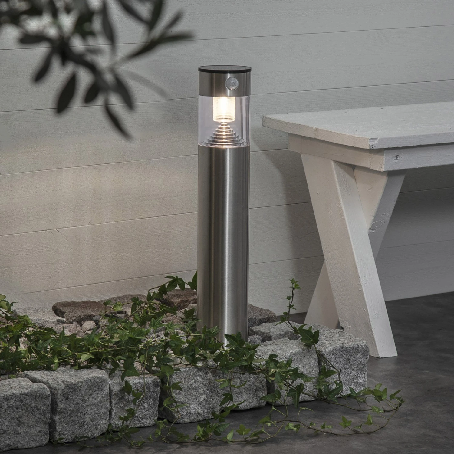 Marbella verfügt zusätzlich über einen praktischen Bewegungs- und Dämmerungssensor. Der Bewegungssensor erfasst Bewegungen in einem Radius von 5-8 Metern und einem Winkel von 100°. Bei erkannter Bewegung leuchtet Marbella für 40 Sekunden mit 80 Lumen, danach konstant mit 10 Lumen. Sobald die Dämmerung am Abend einsetzt, schaltet sich das Licht automatisch an.