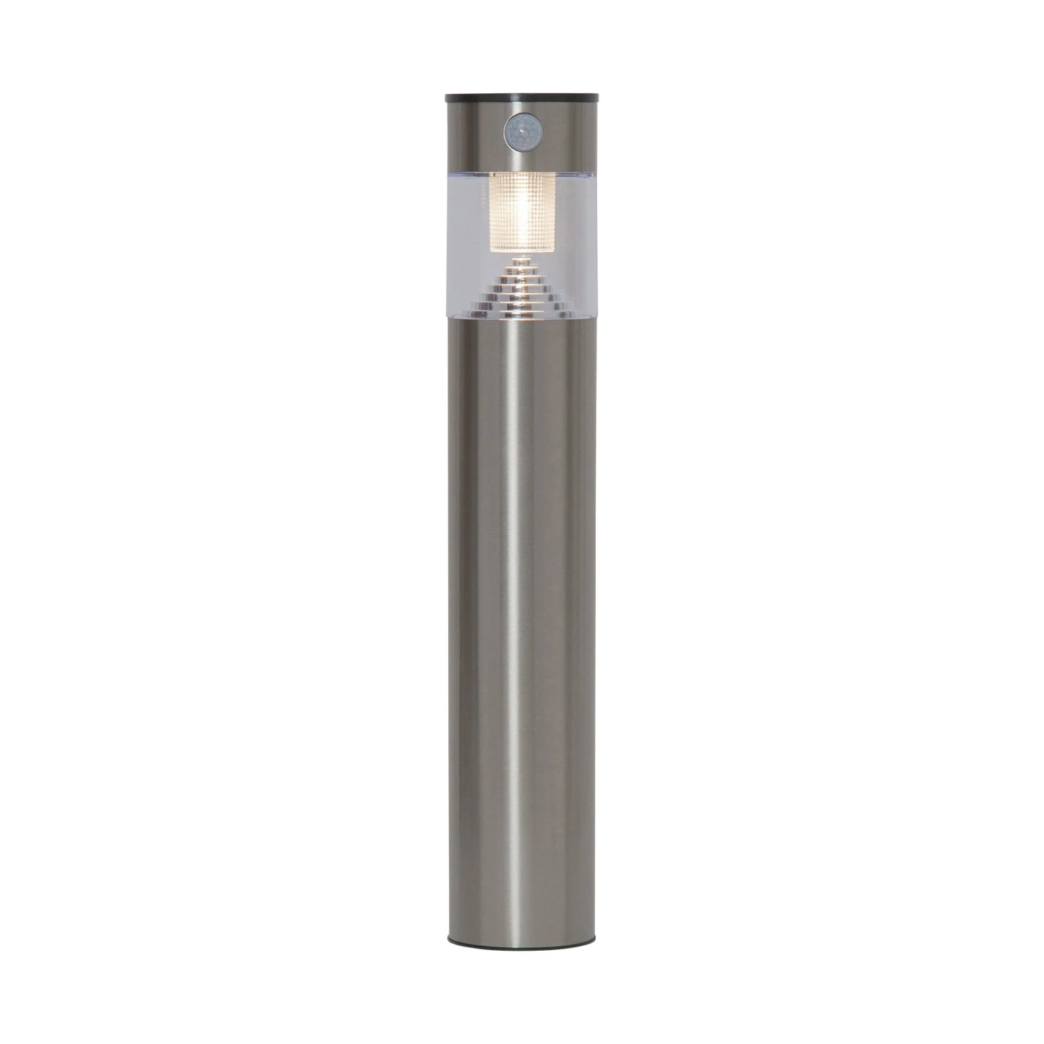 Ihr Körper ist aus Edelstahl und Metall gefertigt und in Silber gehalten. Im oberen Drittel fügt sich ein transparenter Bereich ein, in dem die warmweiß leuchtenden LEDs sitzen und für eine Beleuchtung rundherum sorgen.