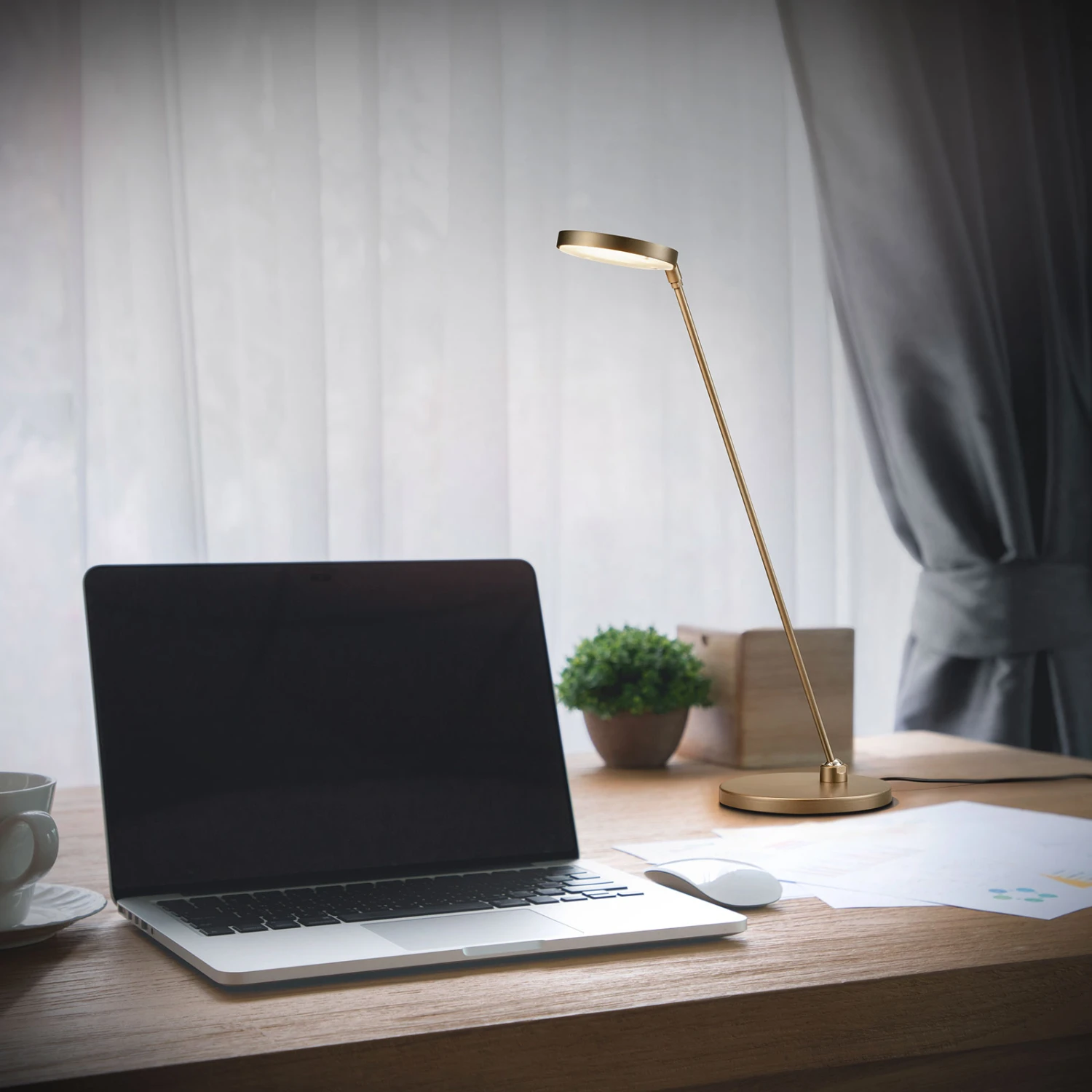 Diese LED-Tischleuchte kommt in puristischem Design daher. Aus dem runden Fuß heraus verläuft der etwas schräg angesetzte Arm in gerader Linie bis zum Leuchtenkopf. Dessen runde Fläche ist nach unten mit LEDs bestückt. Hierdurch wird beispielsweise der Tisch in der Leseecke optimal ausgeleuchtet.