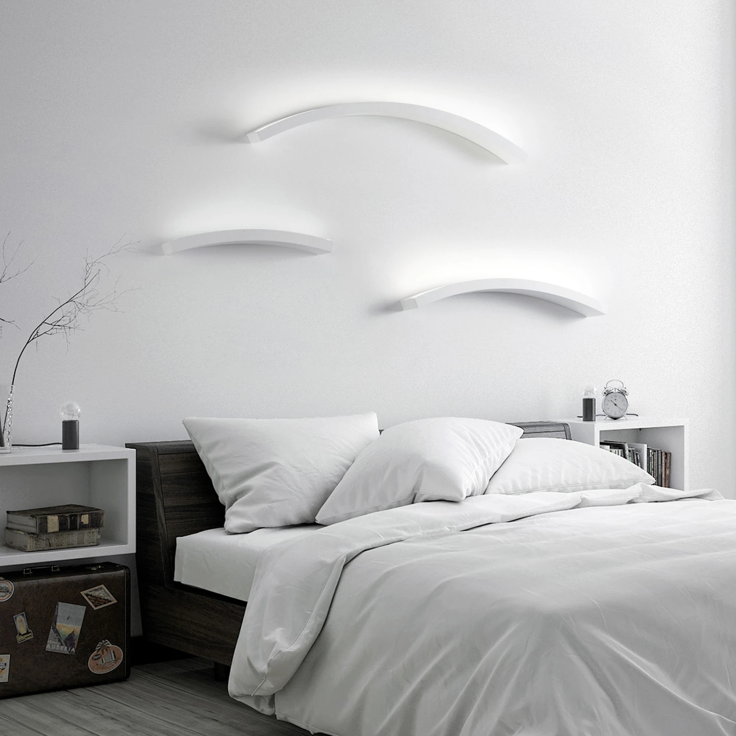 Mit ihrer schlichten Form als langer, gebogener Quader sowie der vollständig weißen Farbgebung ist die Wandleuchte Melossia schlicht und modern gestaltet. Als Ausstattungselement in Aufenthaltsbereichen, Gängen sowie Schlaf- und Hotelzimmern sorgt Melossia mit einem diffus erhellten Bereich an der Wand für ein angenehmes Zusatzlicht. Hierzu befindet sich in der Oberseite des Gipskörpers ein LED-Streifen hinter einer matten Abdeckung.