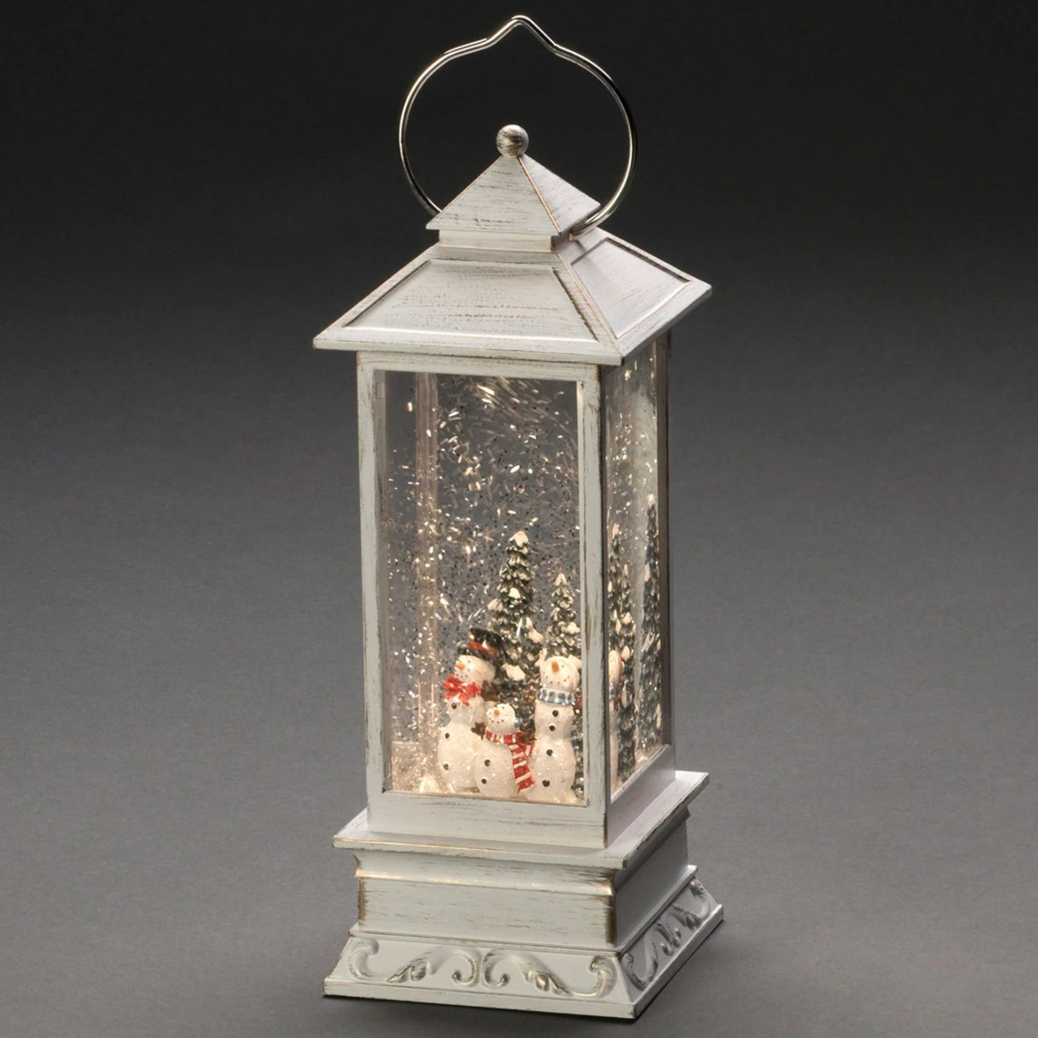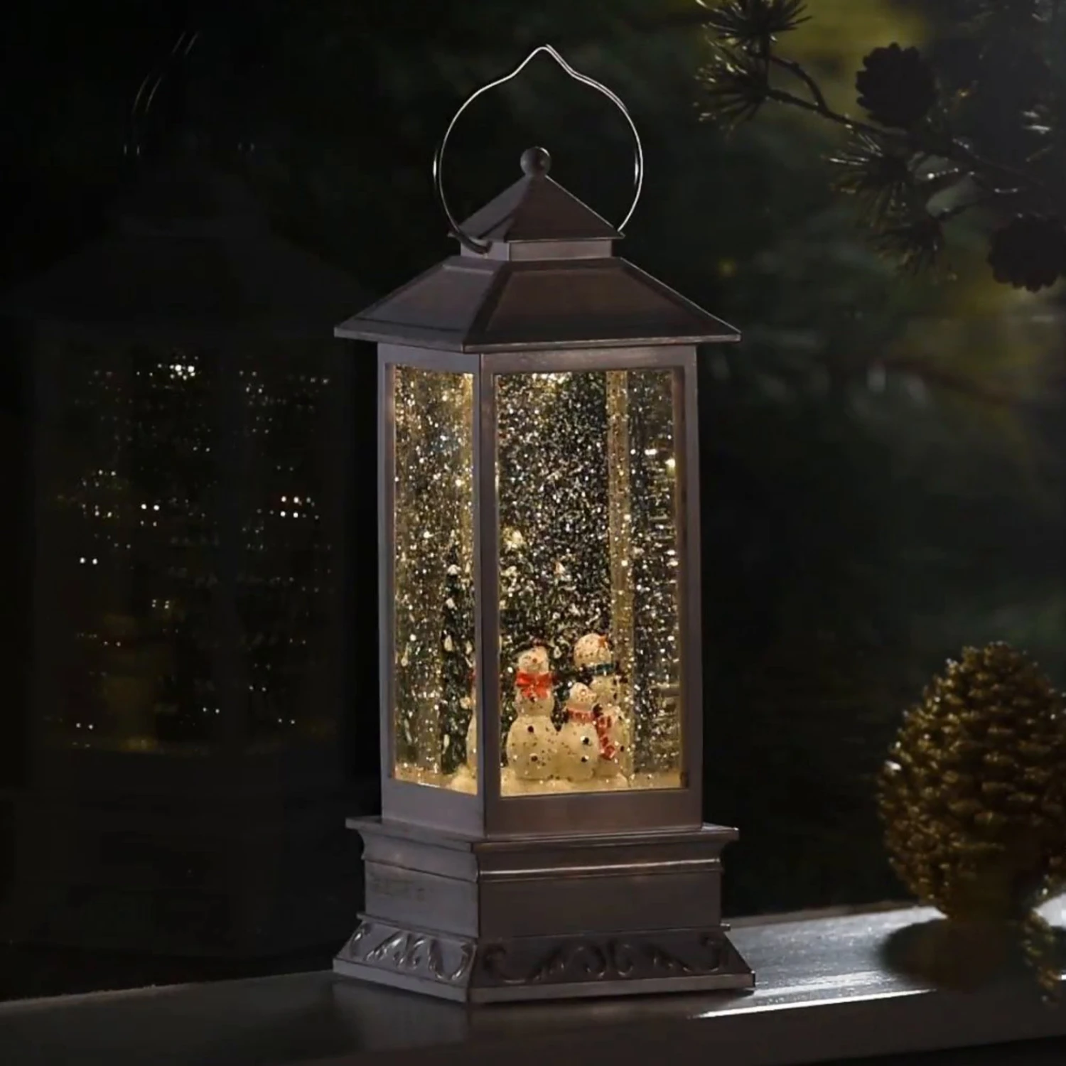 Die Schneemänner im Inneren der mit Wasser gefüllten Dekolaterne werden von einer warmweiß leuchtenden LED mit behaglichem Lichtschein angestrahlt. Die kleinen im Wasser schwimmenden Metallpartikel funkeln wundervoll im Licht. Eine festliche Atmosphäre entsteht, egal, wo die LED-Wasserlaterne Schneemänner platziert wird. Es wird keine Steckdose benötigt. Es müssen drei C-Batterien (1,5 V – über Zubehör erhältlich) eingesetzt werden. Der eingebaute 5-Stunden-Timer schaltet die Laterne jeden Tag zur selben Zeit ein und nach fünf Stunden automatisch auch wieder aus.