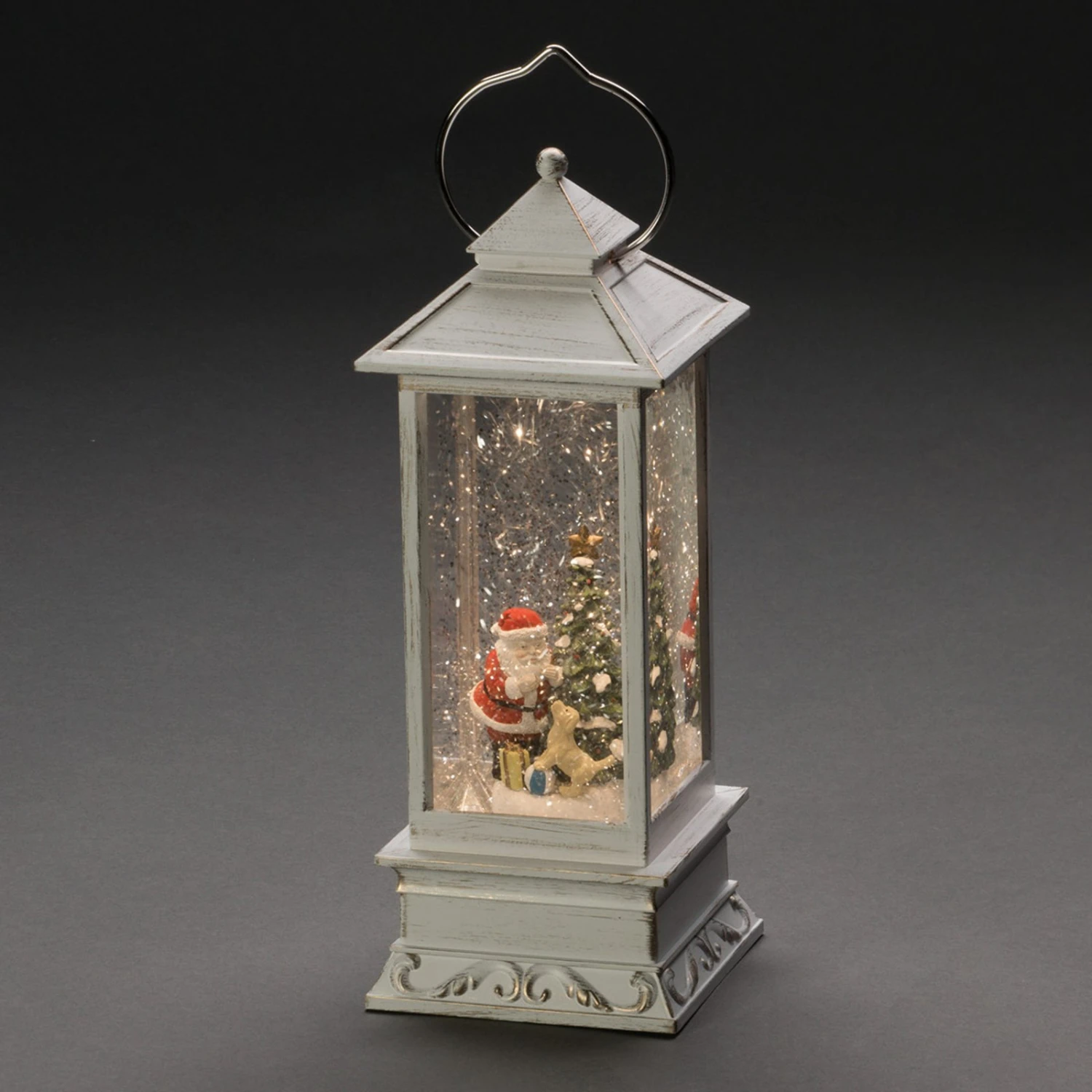 Nanu, der Weihnachtsmann ist auf den Hund gekommen? Das zeigt jedenfalls diese aus Kunststoff gefertigte LED-Wasserlaterne mit den integrierten Figuren. Die Laterne ist – nach Art der bekannten Schneekugeln – mit Wasser gefüllt, in dem kleine Kunstschneepartikel herumwirbeln, was im abstrahlenden Licht der warmweiß leuchtenden LEDs ganz bezaubernd wirkt.