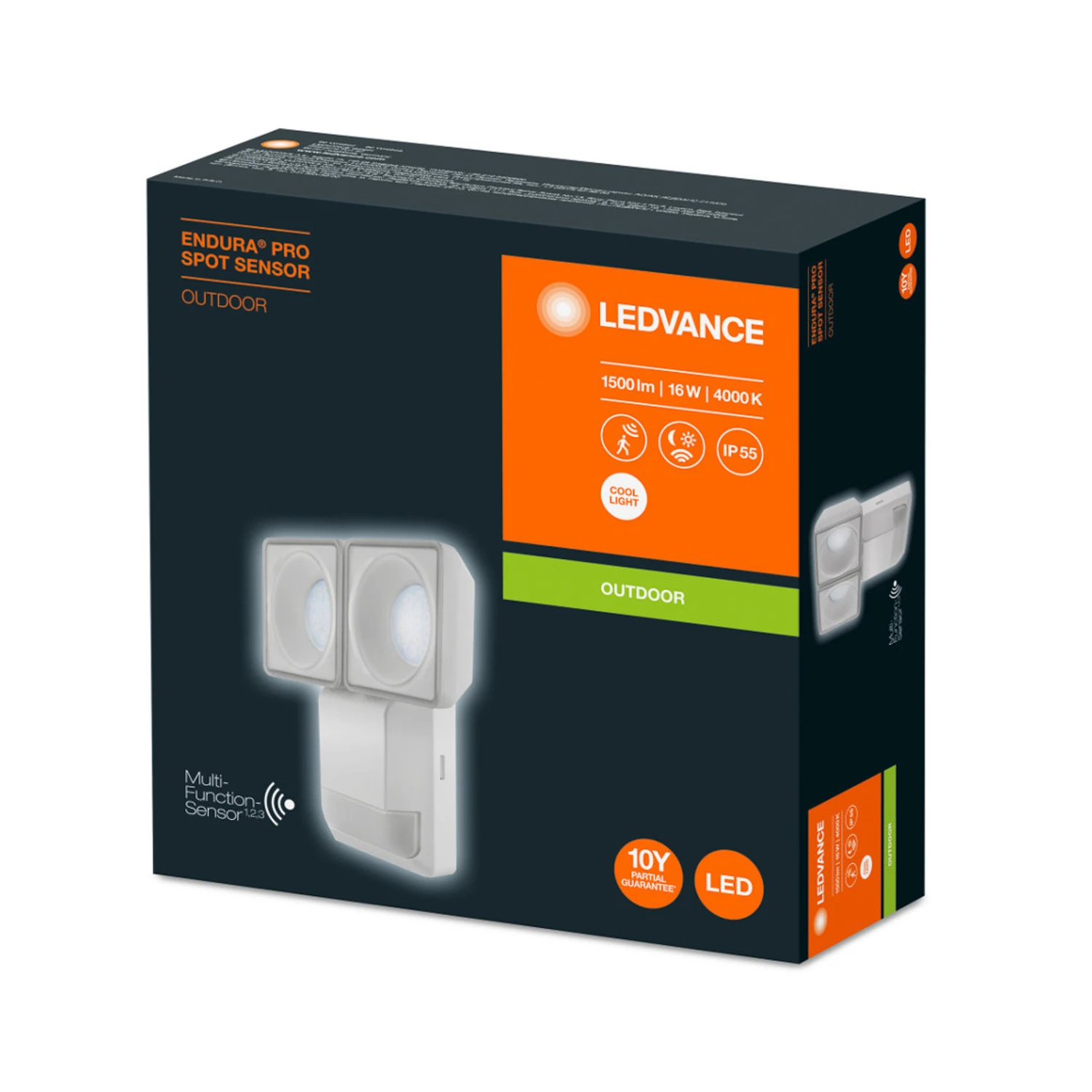 Der LED-Außenwandstrahler Endura Pro Spot kann für die Beleuchtung im Außenbereich und die Ausleuchtung von Eingängen, Arkaden oder Ähnlichem verwendet werden. Die beiden Leuchtenköpfe sind schwenkbar und mit universalweißen LEDs ausgestattet. Für eine bedarfsgerechte Beleuchtung sind verschiedene Einstellungsmöglichkeiten wählbar. Entweder 6 Stunden permanentes Licht, Stand-By-Modus oder Einschalten bei Bewegung oder bei Dämmerung. Das Gehäuse aus Polycarbonat ist robust verarbeitet und dank der Schutzklasse IP55 auch gegen starke Witterungsverhältnisse gut geschützt.