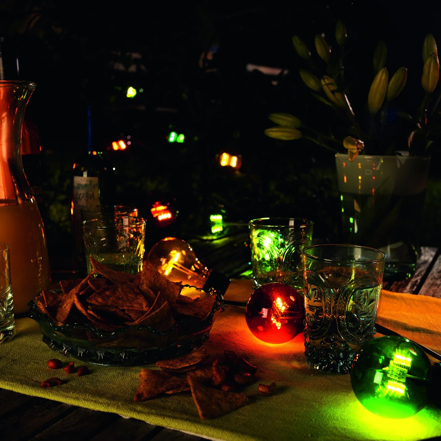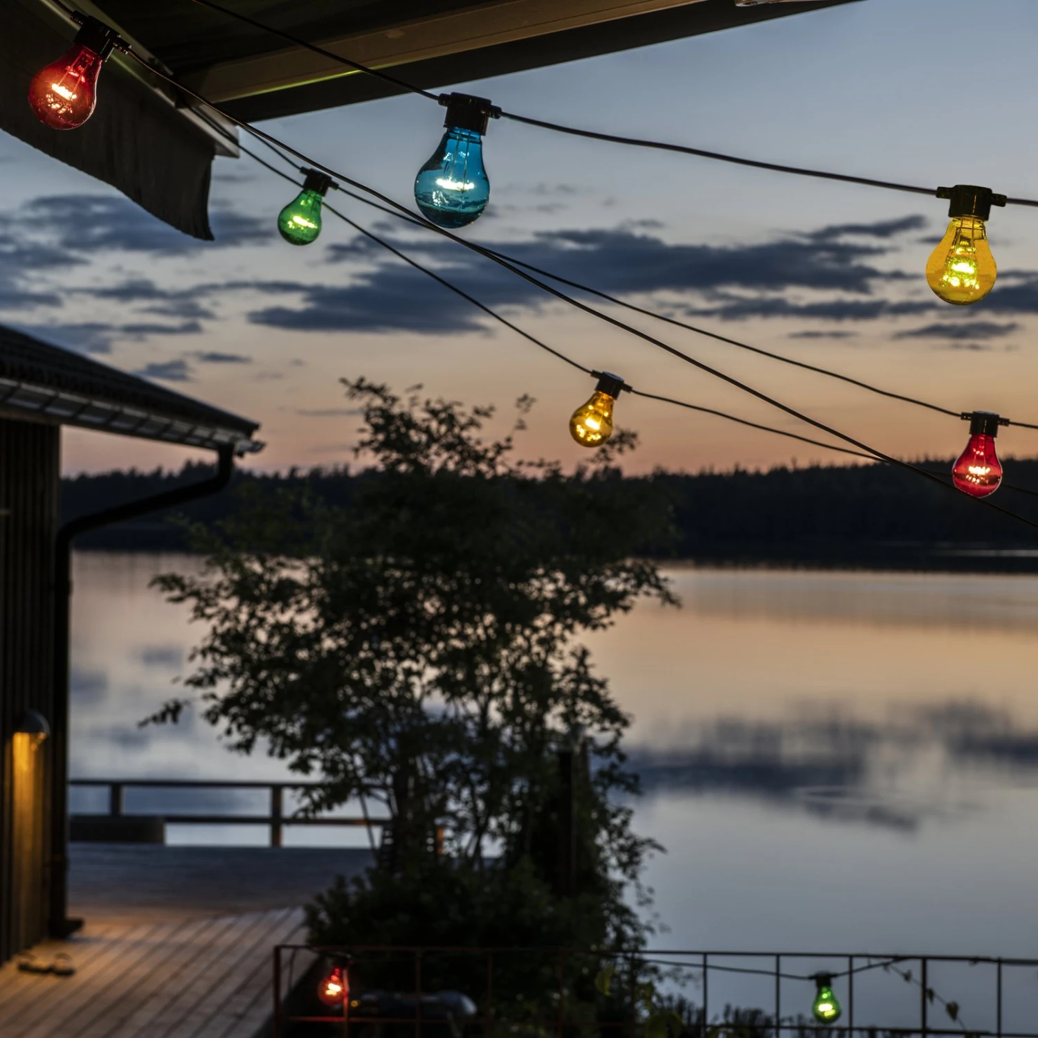 Zehn bunte, transparente Birnen, die innen mit modernen LEDs ausgestattet sind, bilden hier eine dekorative Biergartenlichterkette. Sie wird mit einem passenden 24V-Außentrafo und einer 10 Meter langen Zuleitung geliefert und ist somit perfekt für unterschiedlichste Außenbereiche, wie zum Beispiel die Gartenhütte, die Terrasse oder den Balkon. Die integrierten LEDs leuchten mit einem warmweißen Licht durch die transparenten, bunten Birnen hindurch und vermitteln so eine angenehme Stimmung.