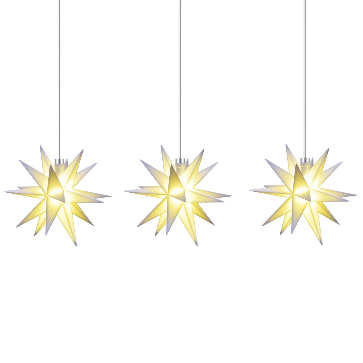 Die LED-Lichterkette Stern ist mit drei kleinen, 18-zackigen Sternen aus Kunststoff geschmückt, die aufgrund ihrer schönen Form wie ein Blickmagnet wirken. Mit der batteriebetriebenen Lichterkette lässt sich in jedem Raum im Handumdrehen ein weihnachtliches Ambiente kreieren, ohne dass ein Stromanschluss in der Nähe sein muss.