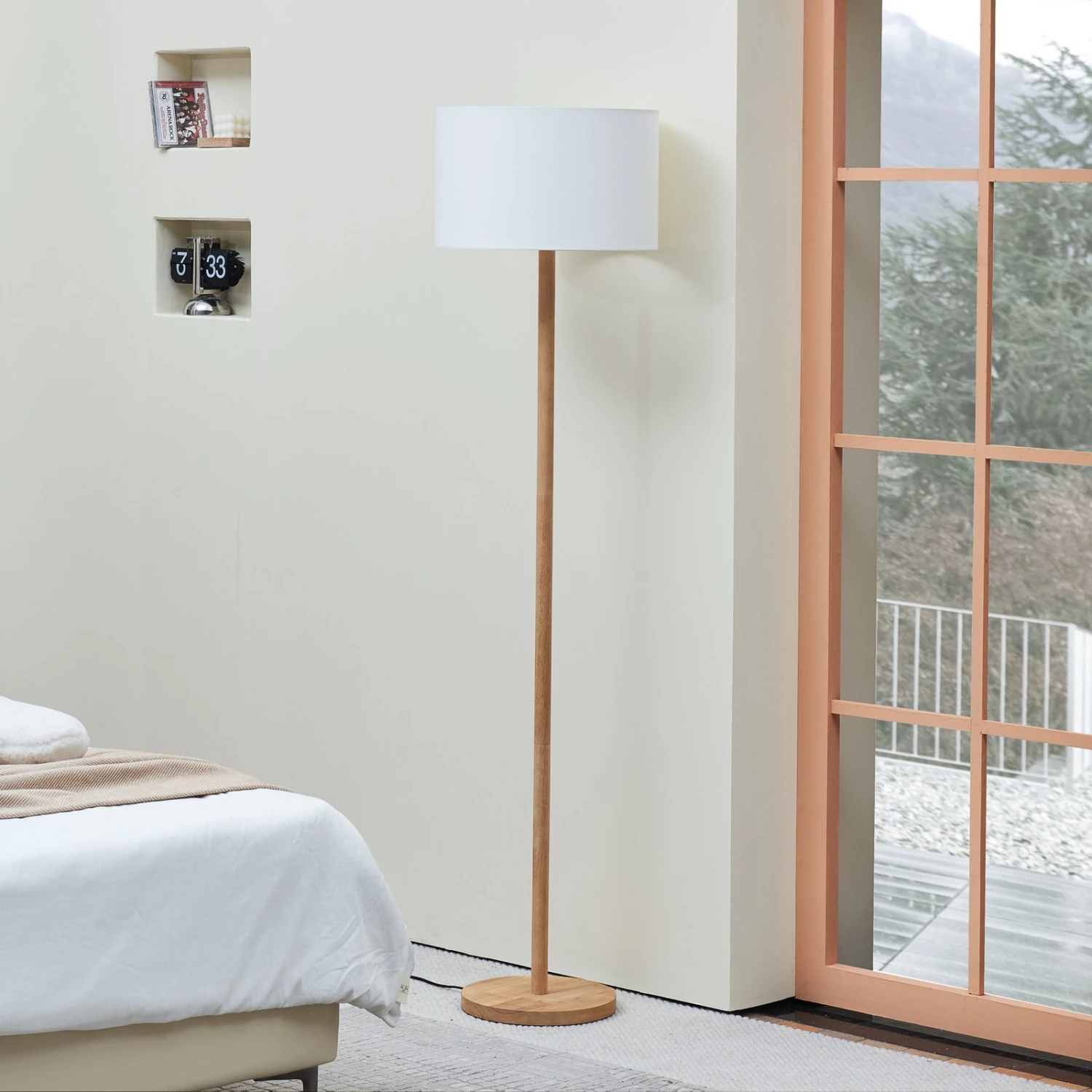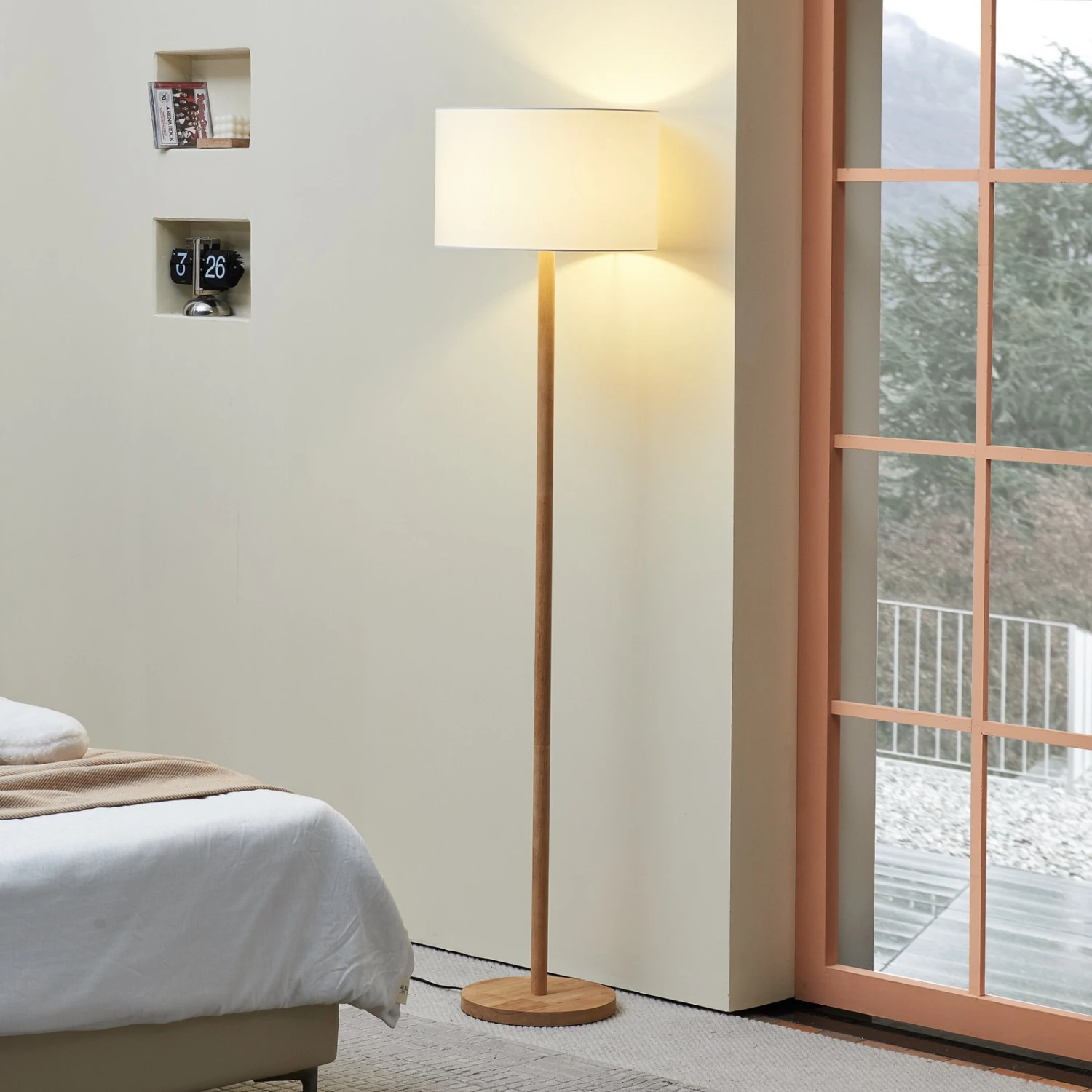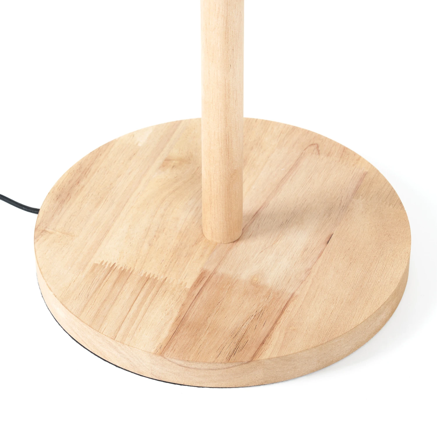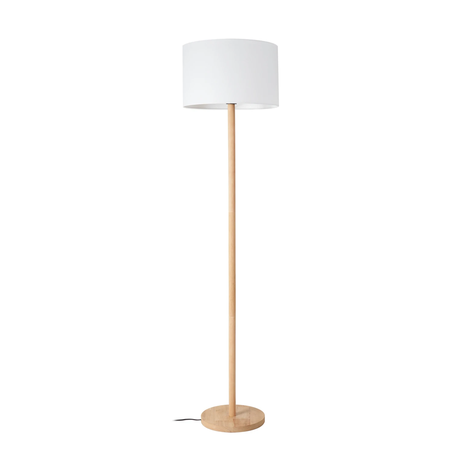 Schlanke Stehleuchte Chava mit Standbein aus Holz und Leuchtenschirm aus Textil