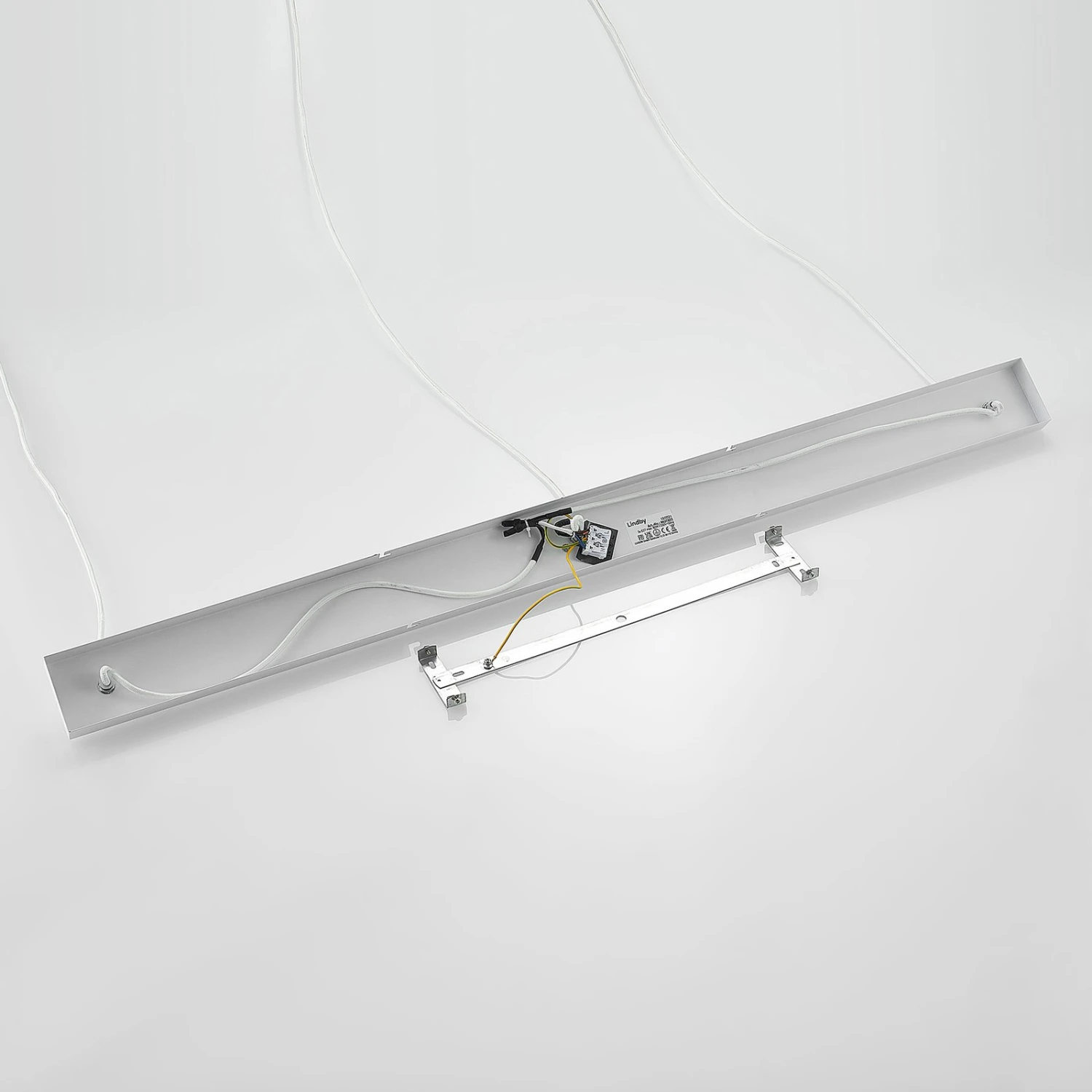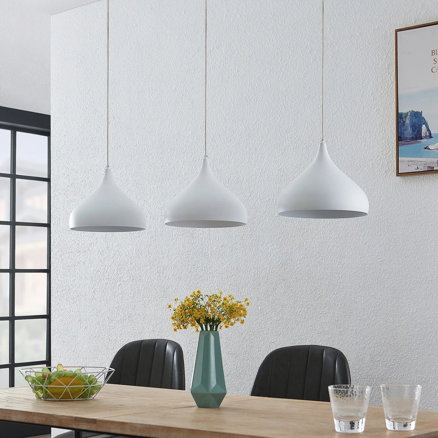 Elamira besteht aus drei schönen, elegant geformten Metalllampenschirmen, die ihr Licht nach unten abgeben und in einem matten Weiß getönt sind, das sehr harmonisch aussieht. Der Lichtschein über dem Esstisch ist auf diese Weise frei von Blendungen und taucht den Raum in eine behagliche Atmosphäre, so dass sich jede Mahlzeit auf schöne Weise einnehmen lässt und der Tisch als Platz sozialer Zusammenkunft einen Wohlfühlort darstellt. Die weißen Textilkabel vervollständigen das Design sehr stimmig und elegant.