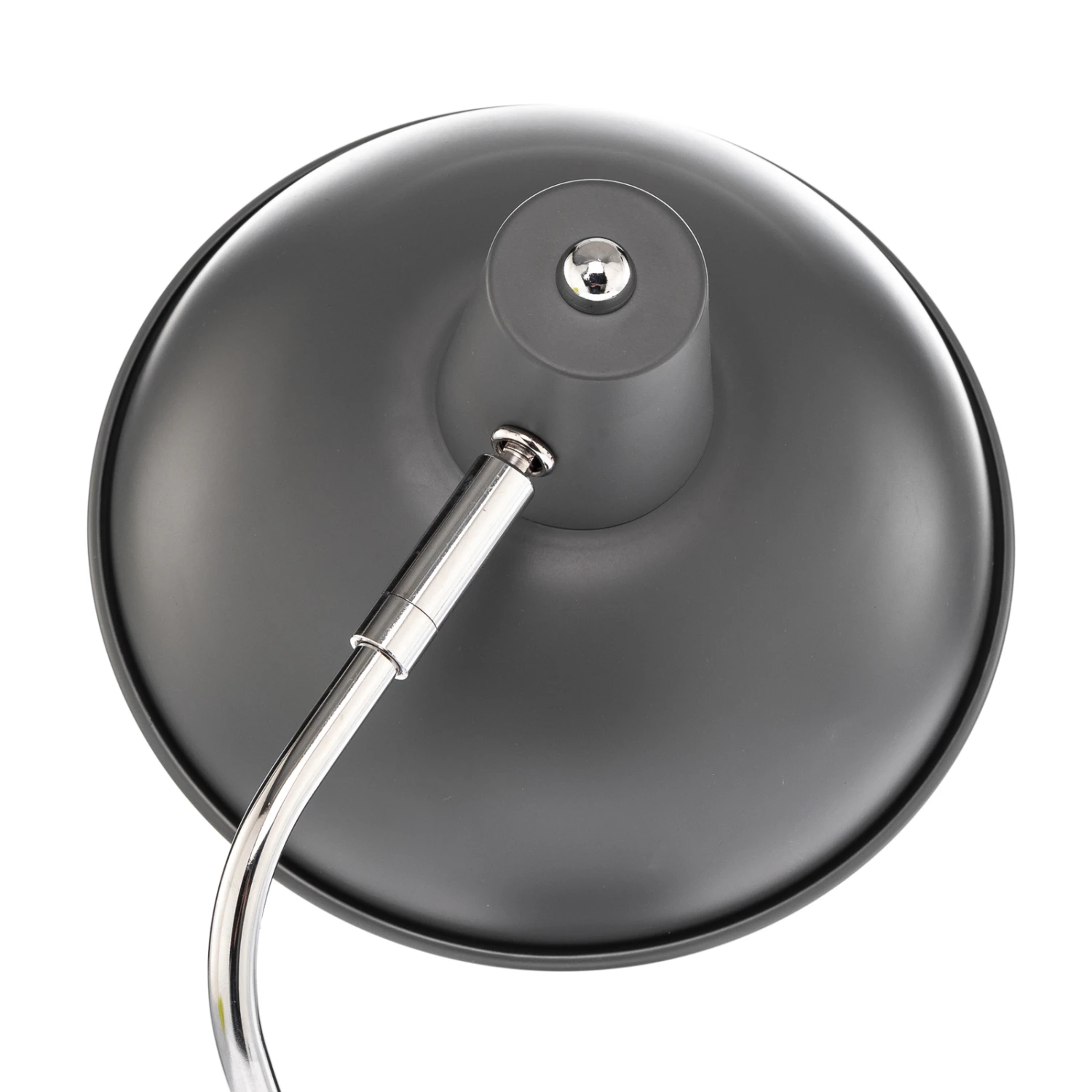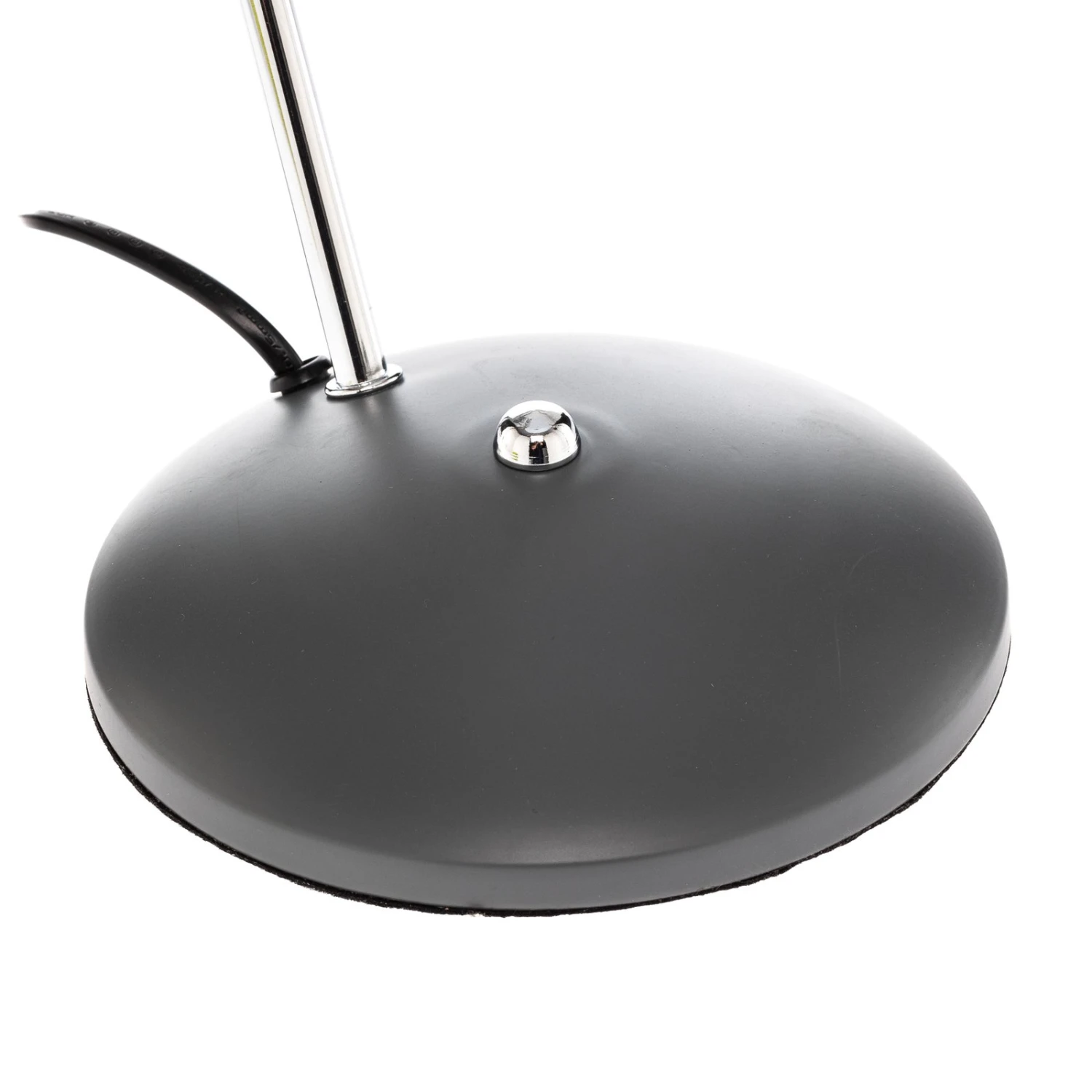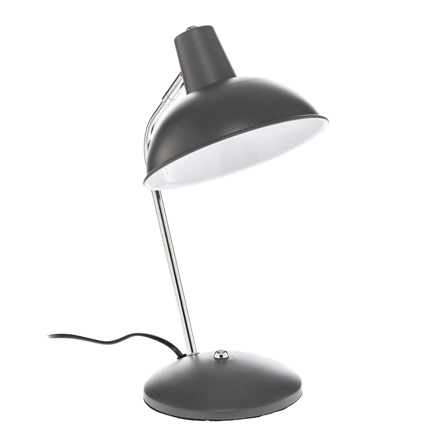 Bei dieser Tischlampe bestehen alle Komponenten aus Stahl, wobei Fuß und Schirm in mattem Grau gehalten sind und die Stange in Chrom einen glänzenden Kontrast bietet. Über ein Gelenk im oberen Teil lässt sich der Lampenschirm verstellen und passgenau ausrichten, so dass man inviduell bestimmen kann, wo das Licht auftreffen soll. Im Idealfall verwendet man Jamelia jedoch auf einem Tisch, um sie als Leseleuchte in Betrieb zu nehmen. Da der Metallschirm an sich lichtundurchlässig ist, entweicht das Licht gebündelt nach unten und gibt eine gute und zentrierte Helligkeit an die Tischfläche ab. Ein- und ausschalten kann man die Tischlampe über einen Knopfschalter am Fuß und insgesamt ist das Design geprägt von einer besonderen Vintagenote und erinnert an lange vergangene Jahrzehnte, was jedoch auch in zeitgemäßen Einrichtungen gut ankommt und einen gezielten Akzent setzen kann.