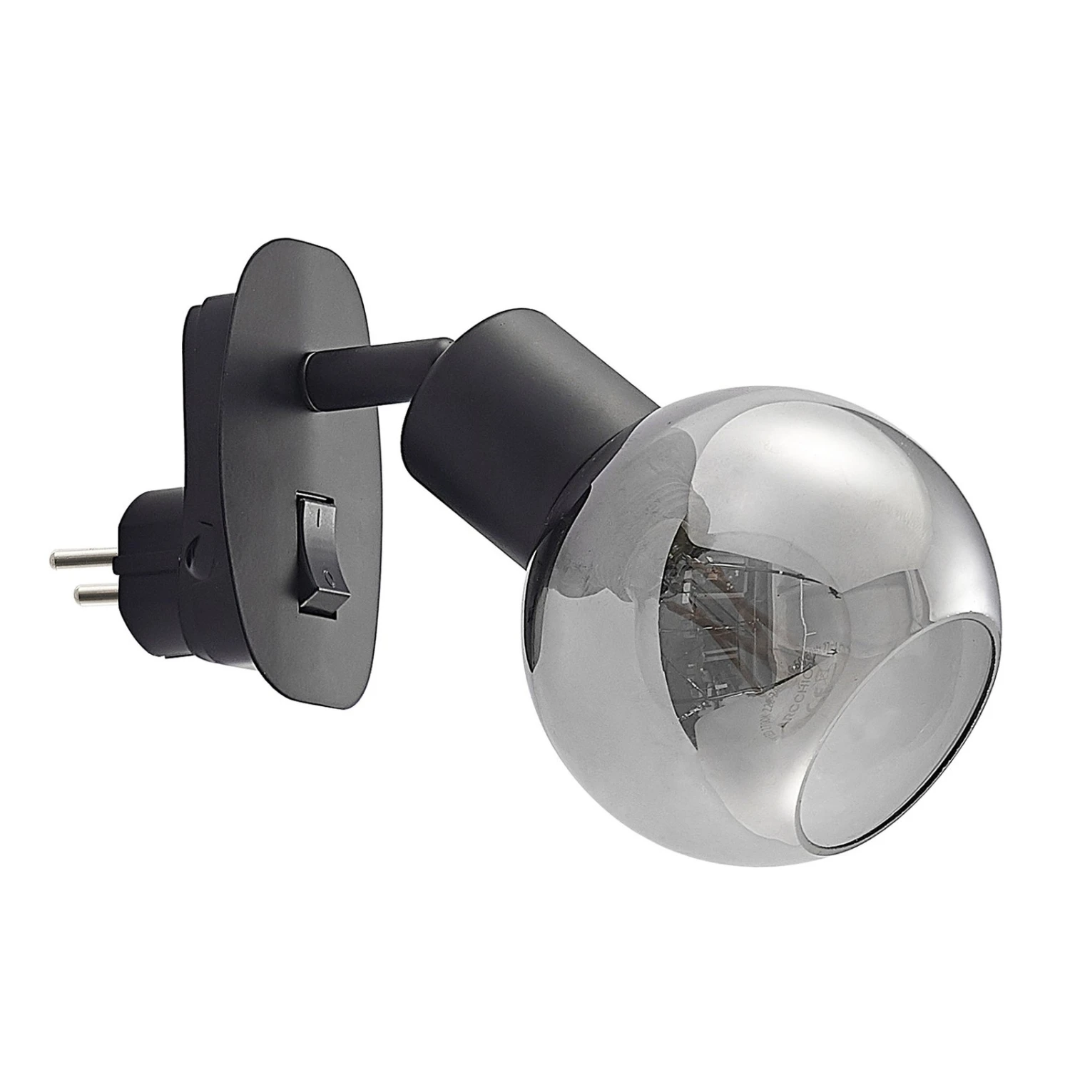 Schwarze Steckdosenleuchte Lioma mit einem Rauchglasschirm