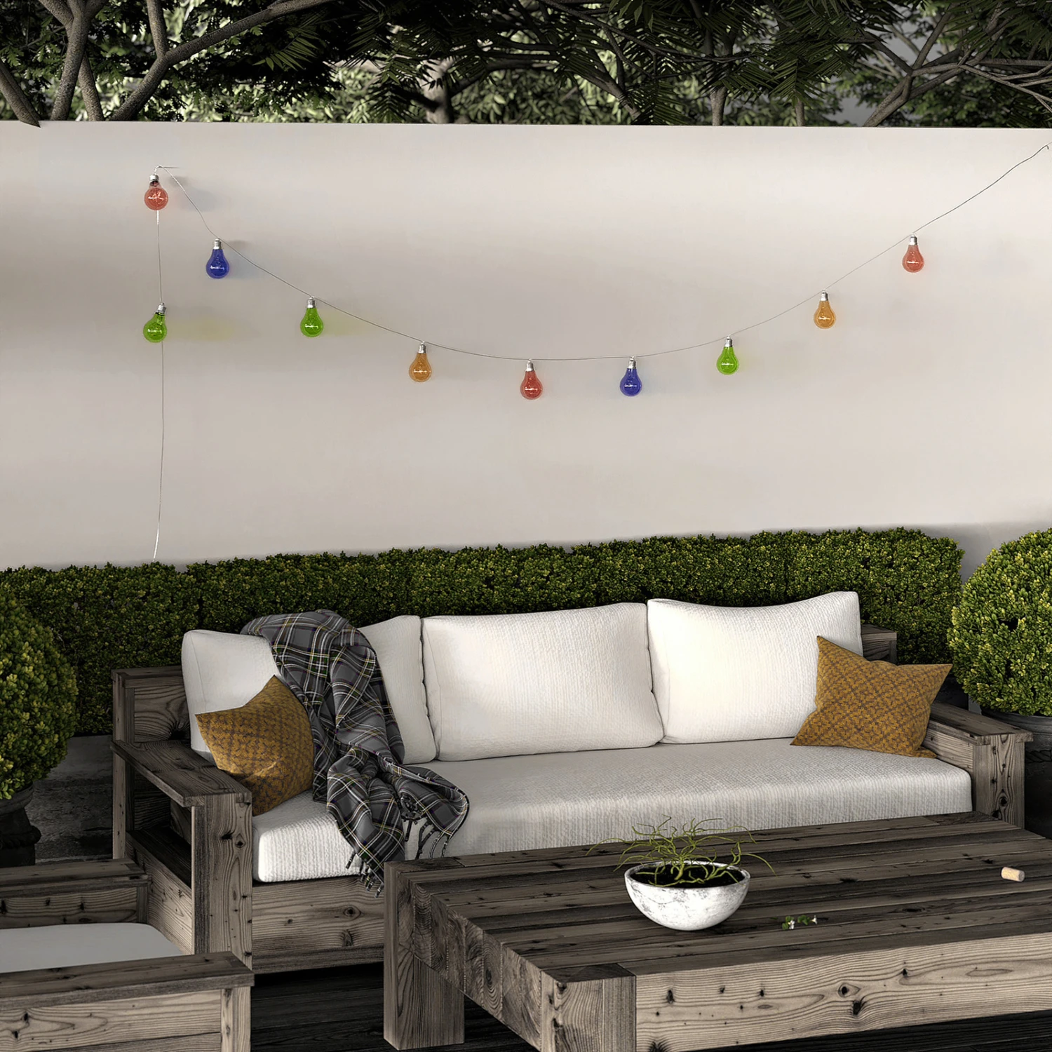 Raean überzeugt als Lichterkette mit ihrem bunten und verspielten Design und verbreitet eine heitere Stimmung innerhalb des Gartens. Die Lichterkette besteht aus mehreren bunten Leuchtenschirmen, welche mit ihrer Form an klassische Glühlampen erinnern. Innerhalb dieser sitzen festverbaute LEDs, die mit Solartechnik betrieben werden. Mit einem vollen Akku spenden die LEDs bis zu acht Stunden warmweißes Licht. Die bunte Farbgebung der LED-Solar-Lichterkette Raean setzt auffällige Akzente innerhalb des Außenbereiches und wertet die Gartendekoration wohlwollend auf und ist auch die passende Deko für jede Gartenparty. Die Schutzart IP44 macht die Lichterkette zusammen mit der Solartechnik perfekt für die Wetterbedingungen vor der Tür und aus diesem Grund ist Raean wunderbar für Gärten und Vorgärten geeignet. Die zehn Leuchtelemente sind miteinander verbunden und ein separates Solarpanel mit Erdspieß sorgt tagsüber dafür, dass das Licht der Sonne eingefangen wird, damit die Lampen abends mit ihrem bunten Licht verzaubern können.