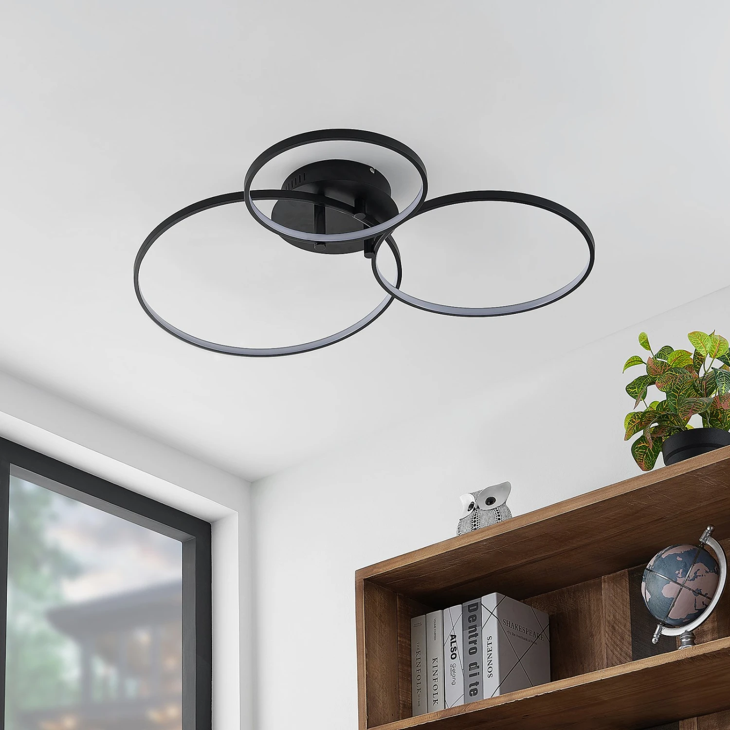 Die schwarze LED-Deckenlampe Rayk ist perfekt für die Beleuchtung eines Schlafzimmers oder Wohnzimmers. Ihr Design besteht aus drei Lichtkreisen, welche versetzt übereinander angebracht sind und dadurch eine interessante Form ergeben. Im Inneren dieser Kreise befinden sich fest verbaute LEDs, welche das nötige Licht erzeugen. Durch einen Wandschalter ist es möglich, die Leuchte wie gewohnt ein- und auszuschalten. Durch die 3-Stufen-Dimmtechnik mit integrierter Off-Funktion lässt sie sich zudem durch mehrmaliges Betätigen des Schalters in drei unterschiedliche Stufen ihrer Helligkeit dimmen: 100 %, 40 % und 10 %. Die LED-Deckenleuchte Rayk ist mit ihrer eher schlichten Farbgebung in mattem Schwarz perfekt für die Integration in verschiedenste Einrichtungsstile und passt sich mühelos dem restlichen Mobiliar an, ohne dieses zu überflügeln.
