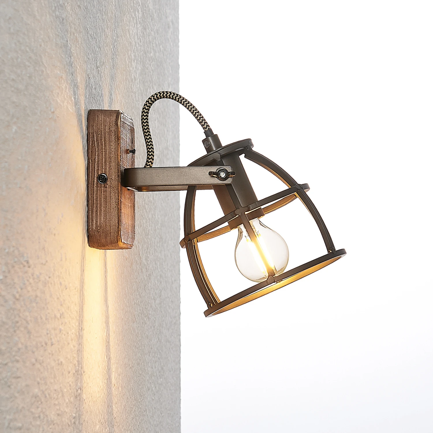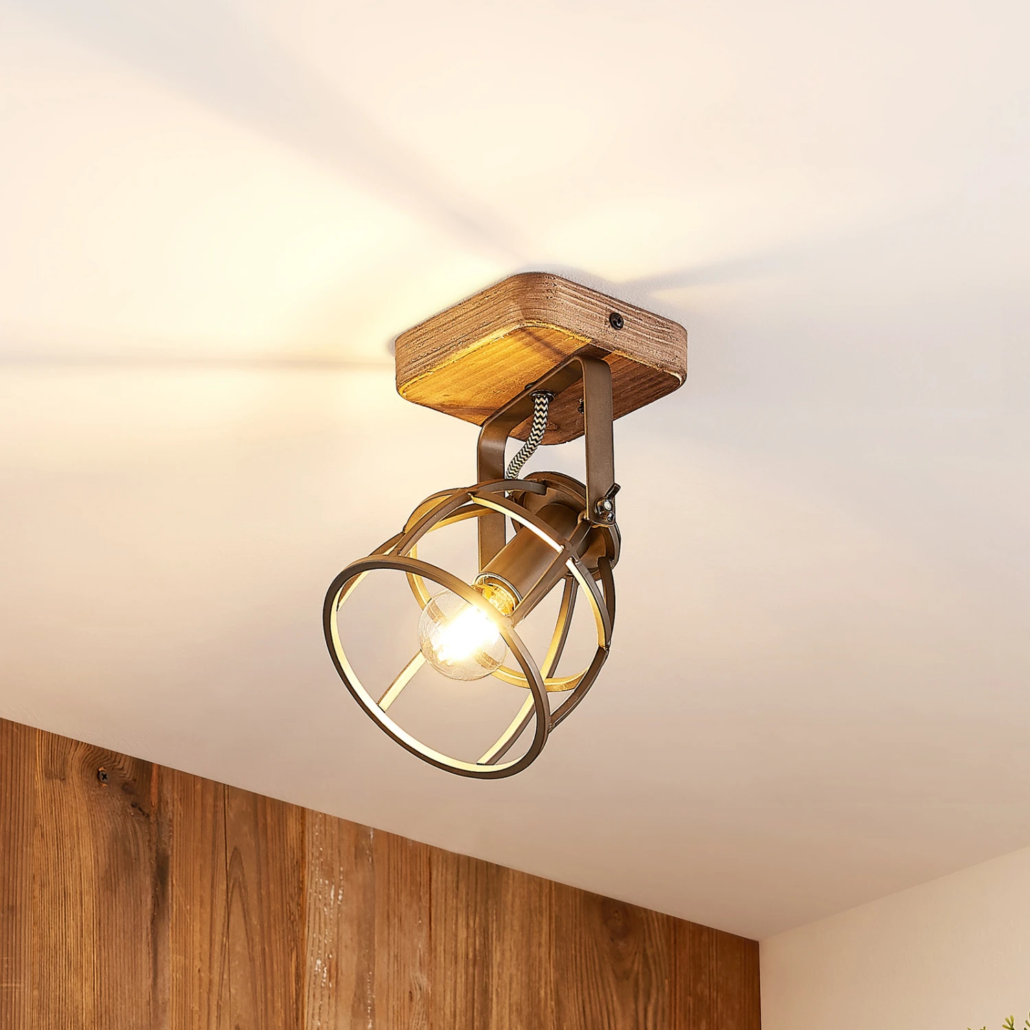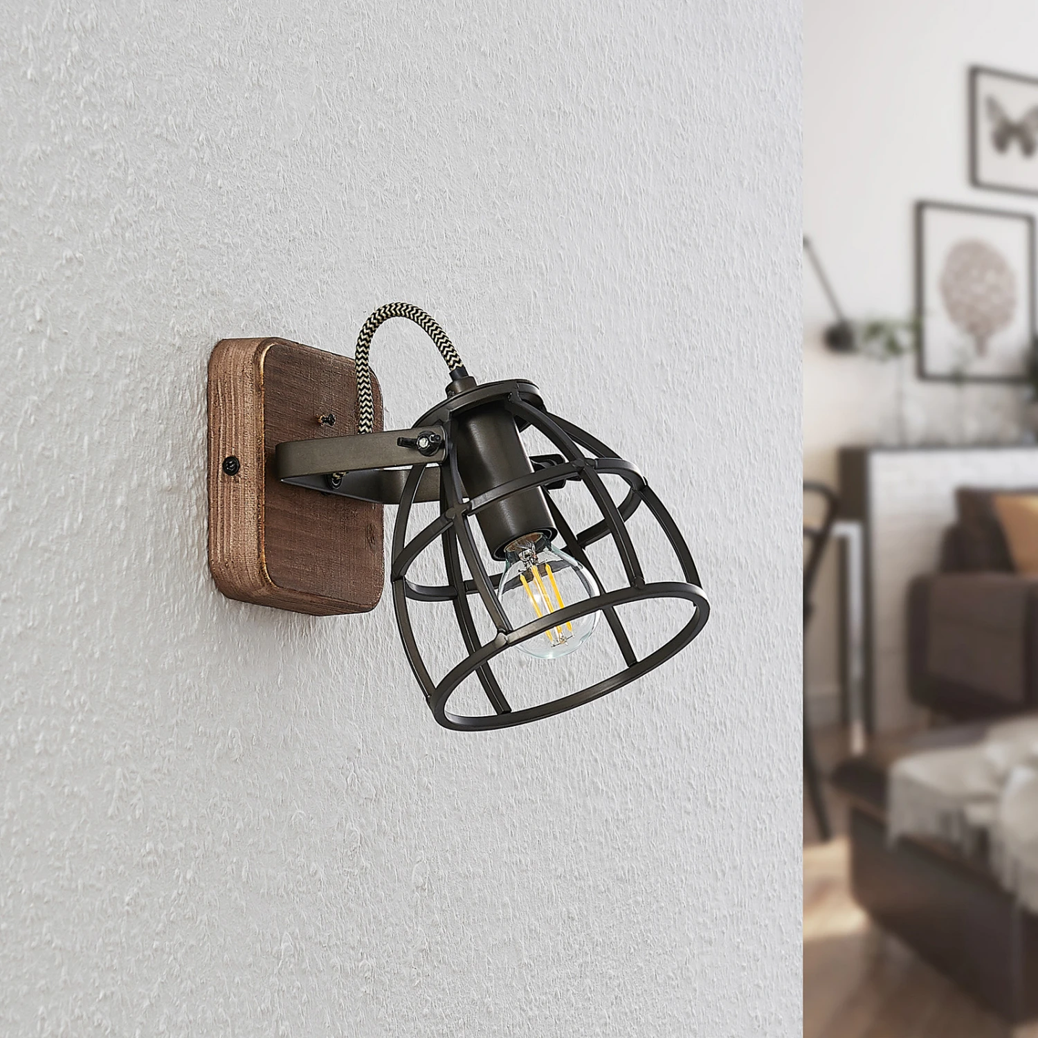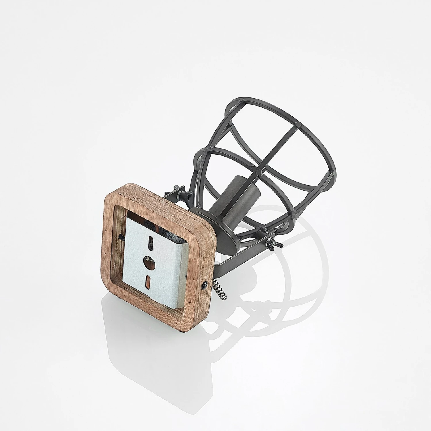 Eine kleine, quadratische Halterung aus geflämmt wirkendem Holz und ein schwarzer Käfigschirm, der in einem Haltebügel daran befestigt ist – das ist der einflammige Strahler Rutger, der sich auch zur Deckenmontage eignet. Das Vintage-Design des Strahlers lässt sich komplettieren, indem ein dekoratives Leuchtmittel in die E14-Fassung eingesetzt wird (nicht enthalten). Drehen des Bügels am Holzelement und Schwenken des Strahlers im Bügel ermöglichen eine gezielte Ausrichtung der Leuchte.