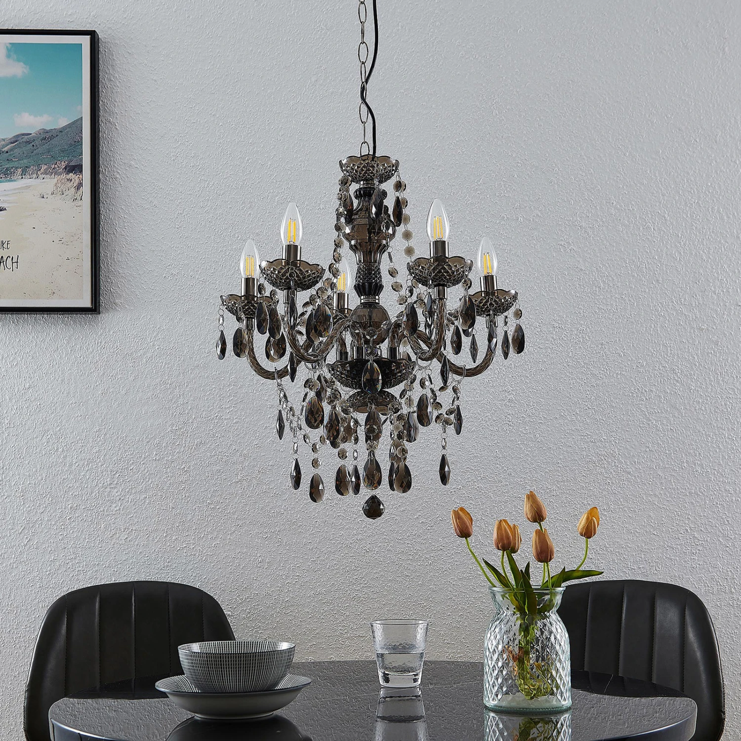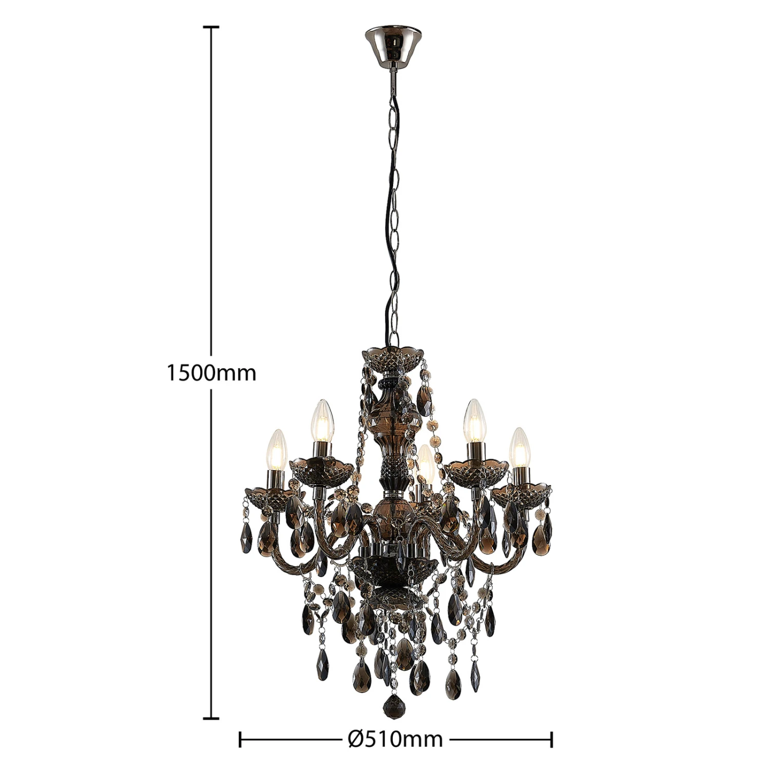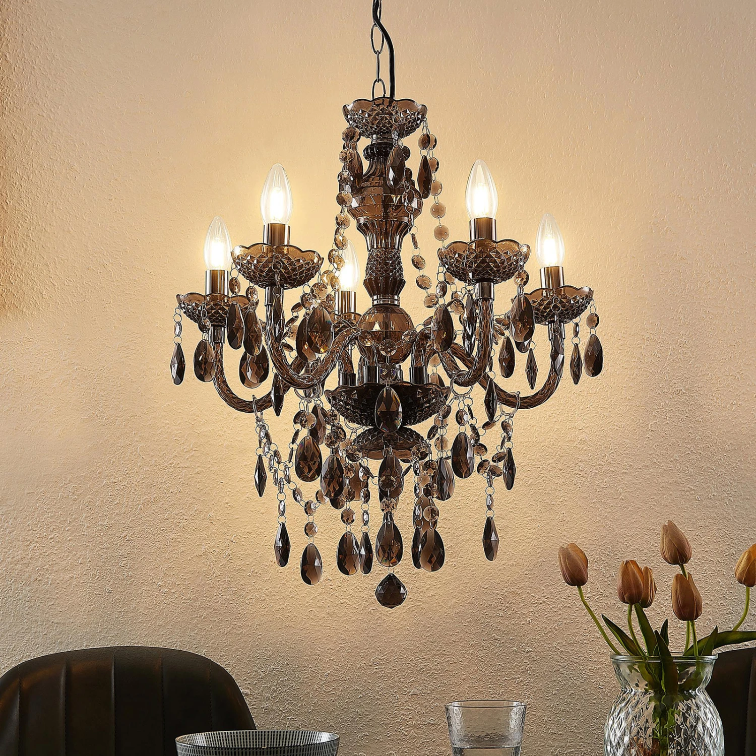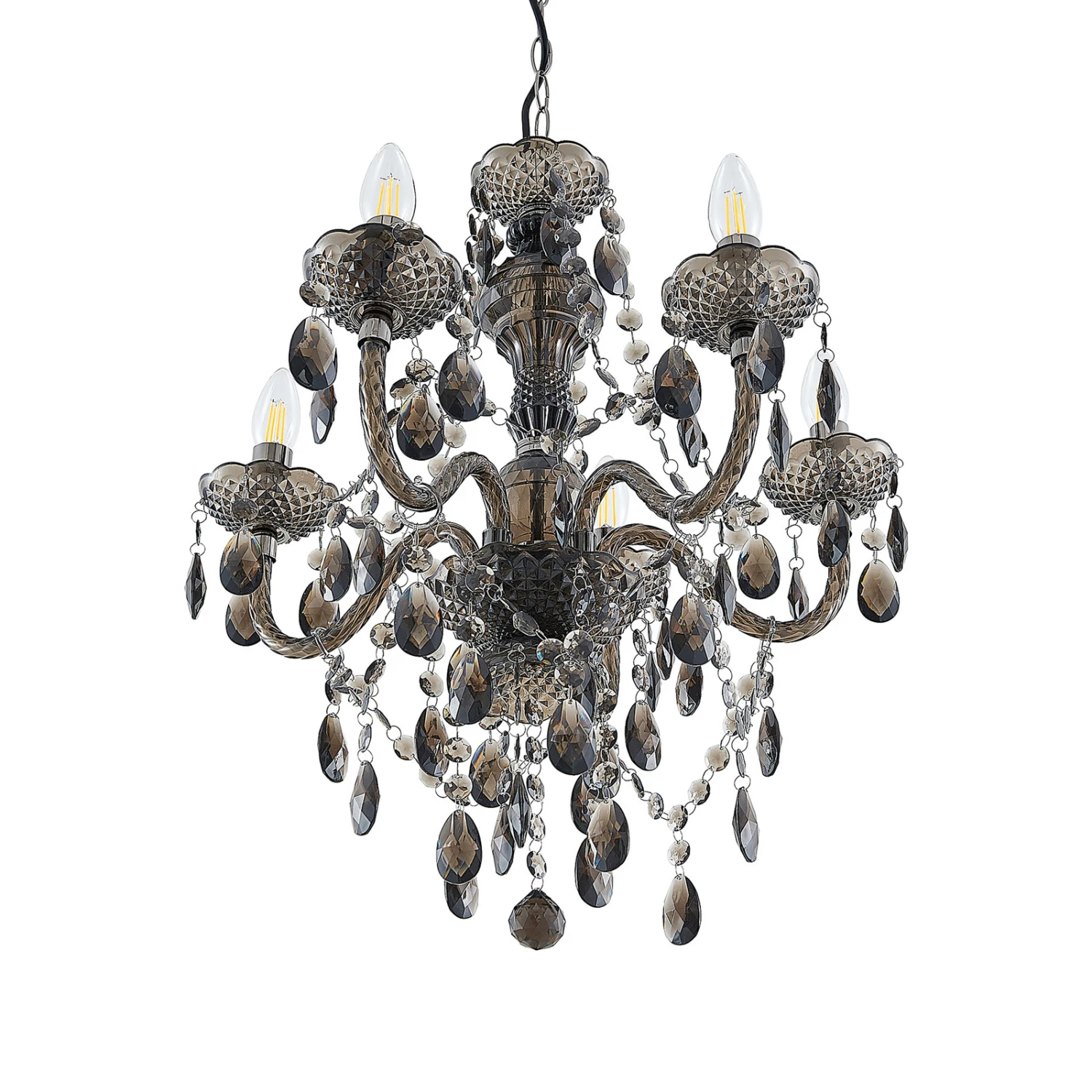 Spirou überzeugt mit dem kunstvollen Lüster-Design auf ganzer Linie und passt sowohl zu klassischen als auch zu moderneren oder jungen Wohnstilen, denn das Gestell ist aus Acryl gefertigt und besitzt eine rauchgraue Tönung, so dass die Optik jugendlicher daherkommt. Der geschliffene Behang wirkt nicht nur kunstvoll und passend, sondern sorgt auch für schöne Lichtreflexionen und ein sanftes Funkeln. Insgesamt ragen vom Gestell fünf Leuchtenarme empor, die in jeweils einem Teller münden und mit passenden Lampen nach Wahl bestückt werden können. Kerzenlampen wirken hierbei natürlich am stilvollsten und sie können für den besonders authentischen Look auch in Windstoßoptik gehalten sein, um den Kerzenleuchterlook gekonnt zu untermalen.