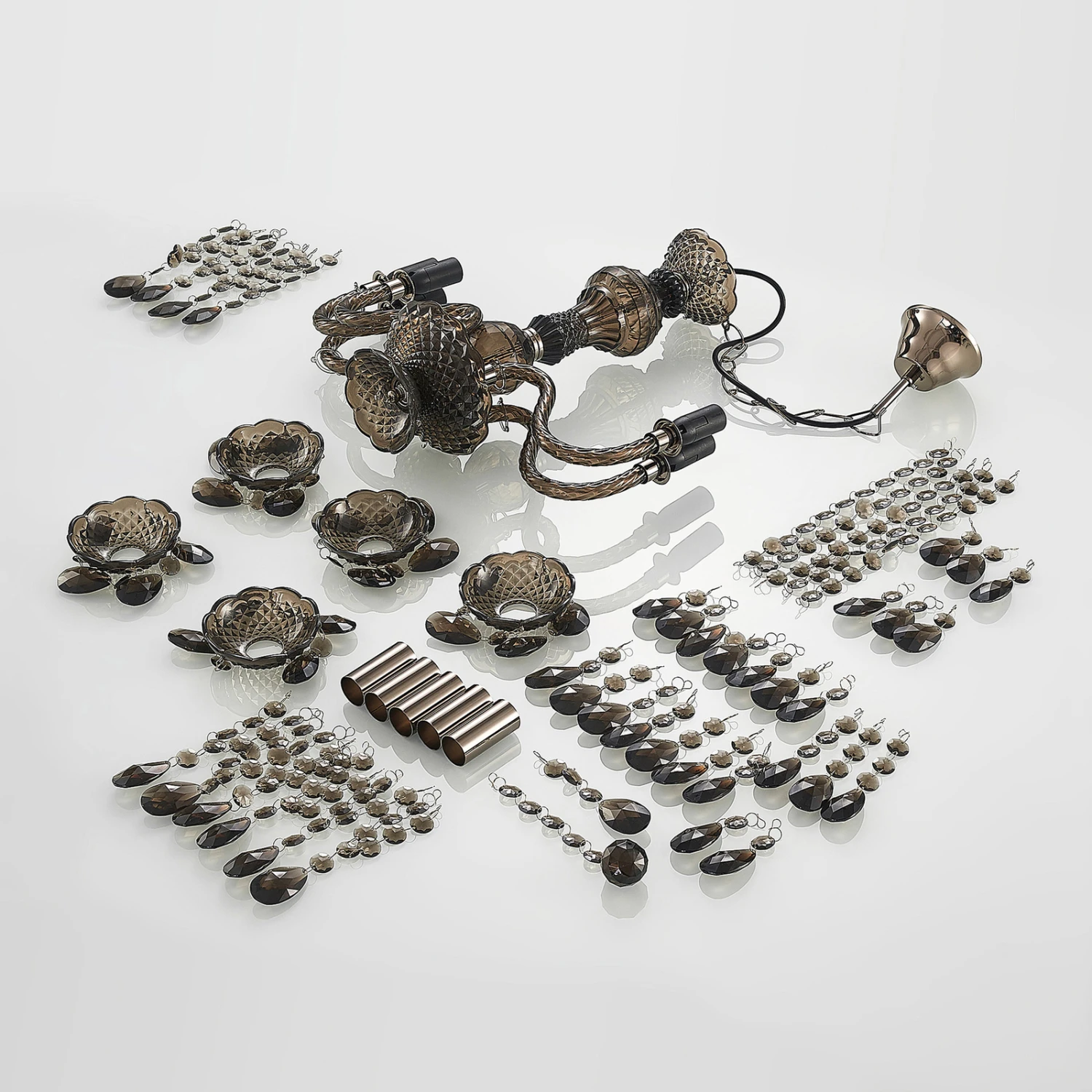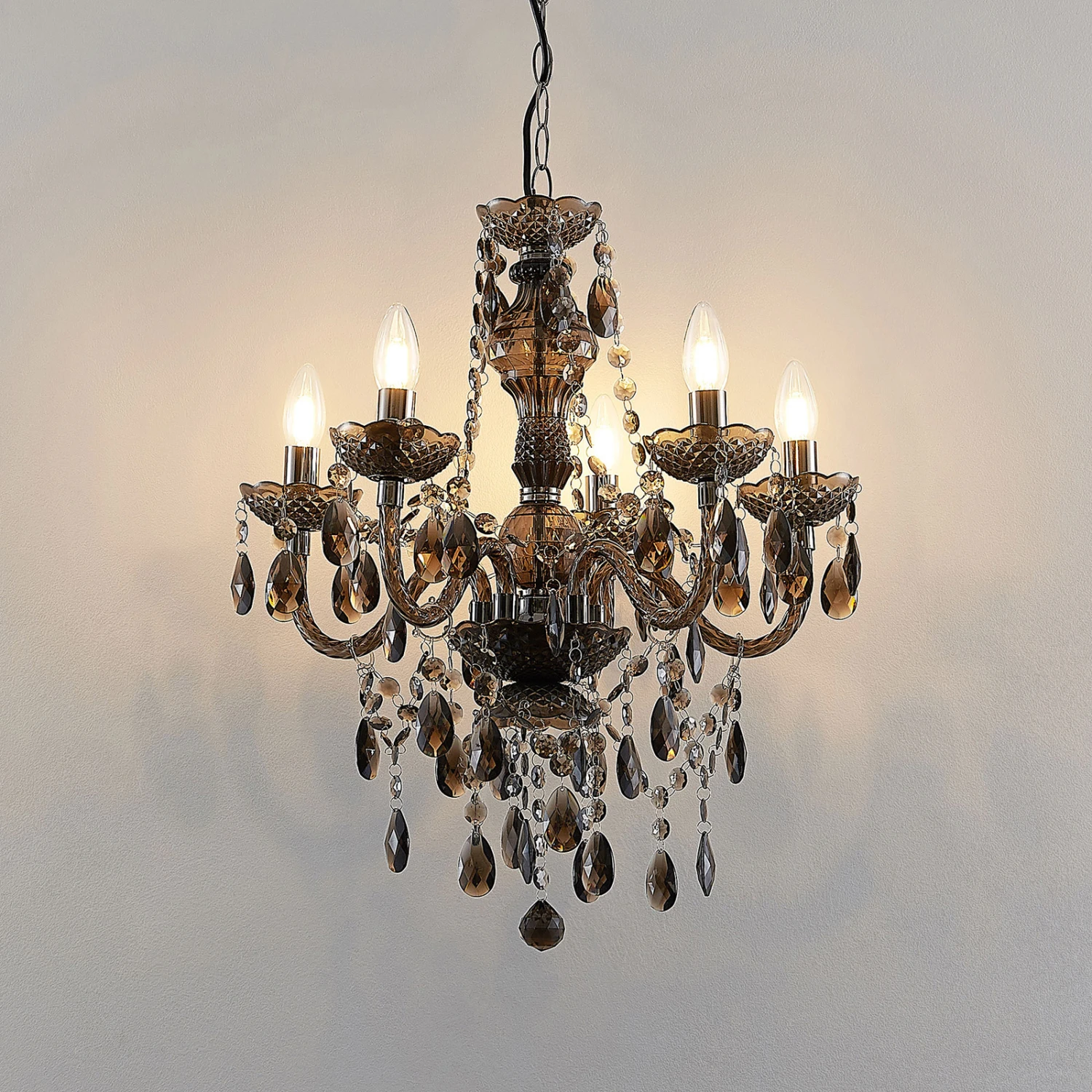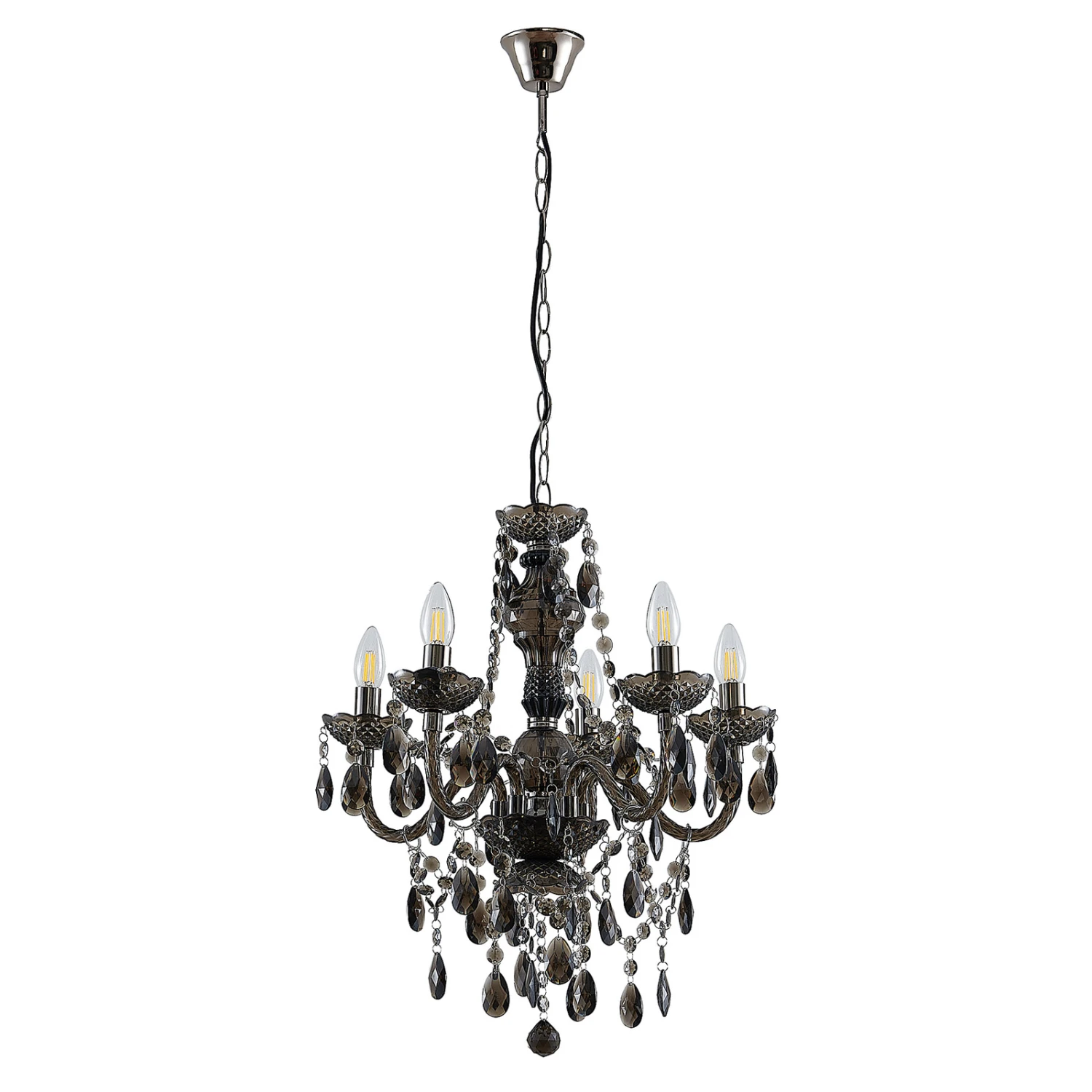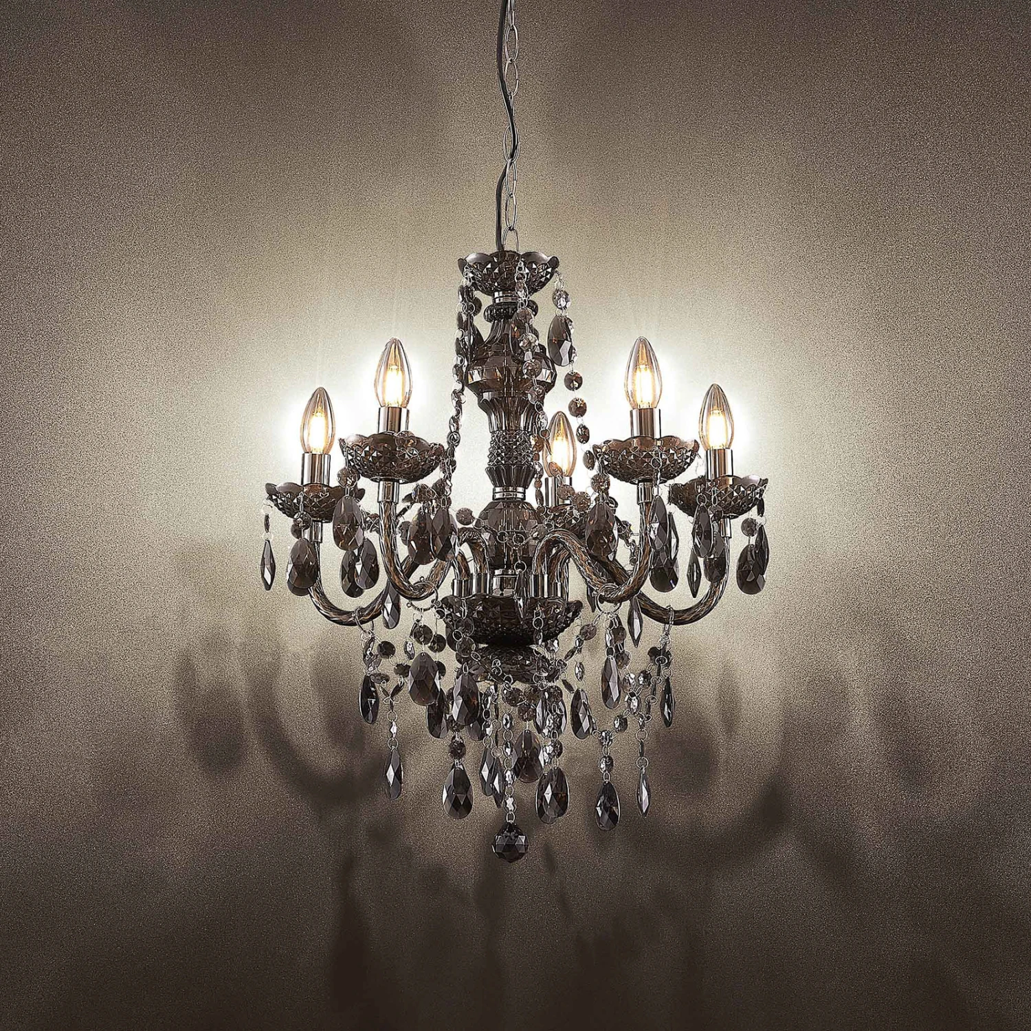 Rauchgrauer Kronleuchter Spirou aus Acryl, fünfflammig mit edlem Behang
