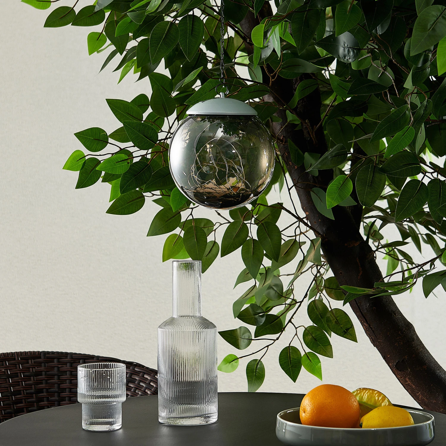 Kugelförmige LED-Solar-Hängeleuchte aus rauchgrauem Kunststoff Die LED-Solar-Hängelampe überzeugt mit ihrem stilvollen und interessanten Design. An einer stabilen Kette hängt ein kugelförmiger Leuchtenschirm aus rauchigem Kunststoff. Innerhalb dieses Lampenschirmes sitzt ein schmales LED-Band, welches im angeschalteten Zustand Lichtpunkte erzeugt. Die Kombination aus der dunklen Oberfläche und den hellen Punkten erinnert an einen Sternenhimmel bei Nacht und verbreitet das passende Ambiente auf einer Terrasse. Die LED-Solar-Hängeleuchte ist akkubetrieben, sodass sie an allen Orten einen guten Platz findet, ohne dass ein Stromkabel verlegt werden muss. Sie spendet für sechs bis acht Stunden zuverlässig Licht, ist durch ihre Schutzart IP44 gegen Spritzwasser geschützt und aus diesem Grund wie gemacht für die Anbringung auf einer Terrasse. Für ein stimmiges Gesamtbild empfiehlt es sich, sie mit anderen Leuchten ihrer Serie zu kombinieren.