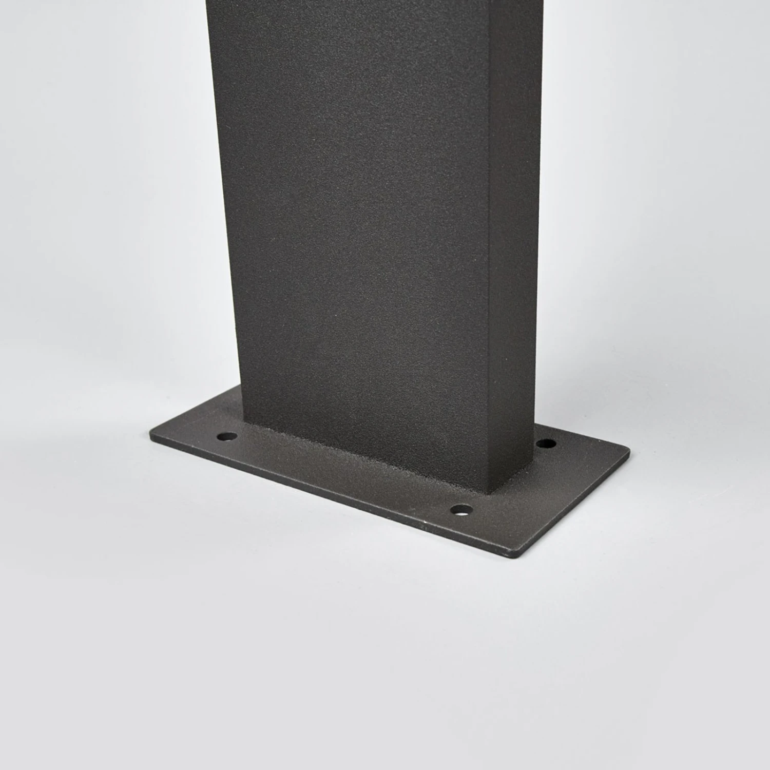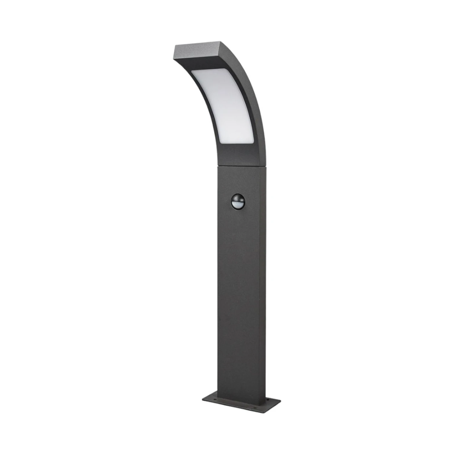 Juvia besitzt eine moderne Formensprache und wirkt recht geradlinig. Nur im oberen Teil neigt sich der Leuchtkopf mit den integrierten LEDs, so dass der Lichtschein mehr zum Boden gerichtet ist. Der Aluminiumkörper hat eine dunkelgraue Lackierung und ein wichtiges Feature der LED-Wegeleuchte ist natürlich der integrierte Sensor unterhalb der Leuchtfläche.