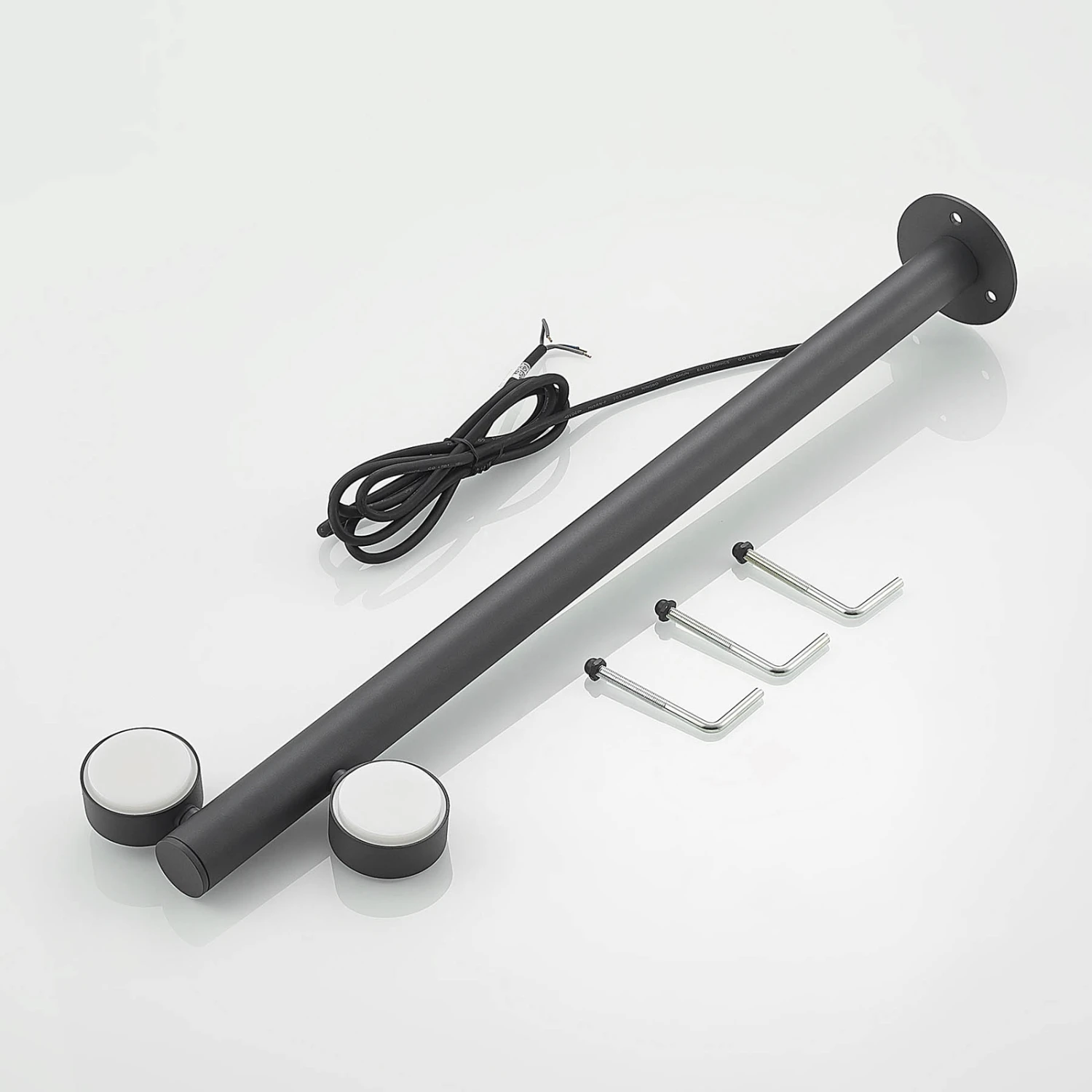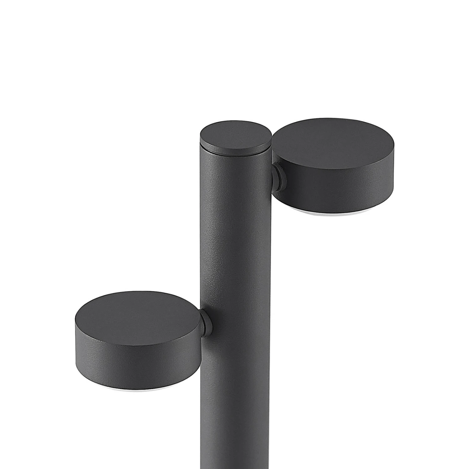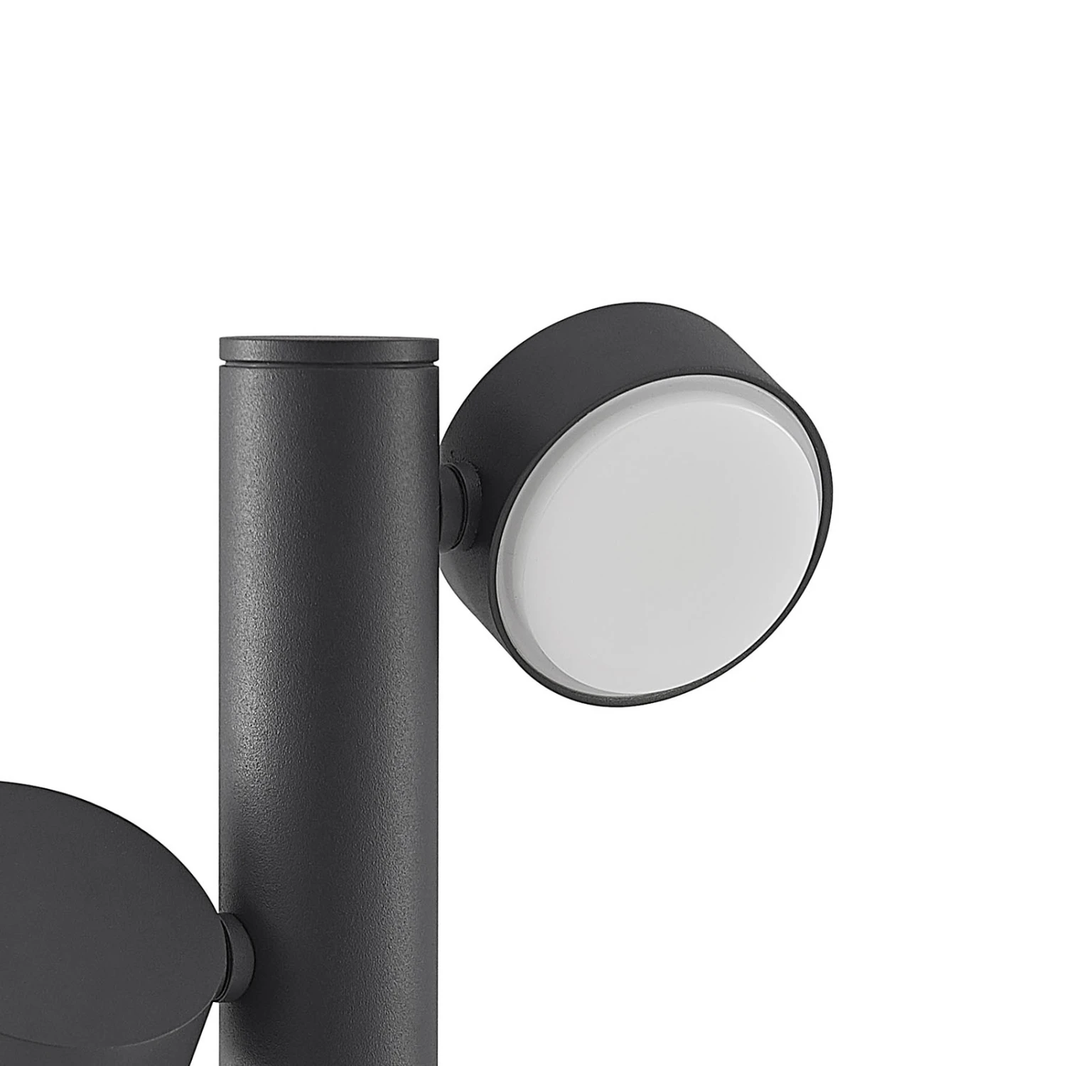 Die schlanke LED-Wegeleuchte Kynlee besitzt einen modernen und markanten Charakter. Ihr Leuchtenkörper besteht aus Aluminium und ihre Oberfläche ist in einem stimmigen Dunkelgrau gehalten. Sie besitzt zwei Leuchtenschirme, welche an der Spitze ihres Standbeines angebracht und nach unten gerichtet sind, wobei sich die Lichtausrichtung auch anpassen lässt. In den Schirmen sind LEDs fest verbaut und generieren ein warmweißes Licht, welches ein stimmiges Ambiente für den Außenbereich generiert. Die Schutzart IP54 lässt die LED-Pollerleuchte Kynlee geschützt sein gegen Staub und Spritzwasser und ihr modernes Design integriert sich mühelos in einen Garten oder in den Baustil eines Hauses.